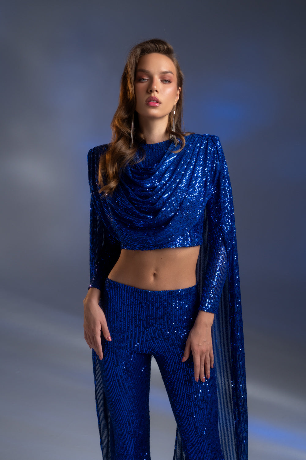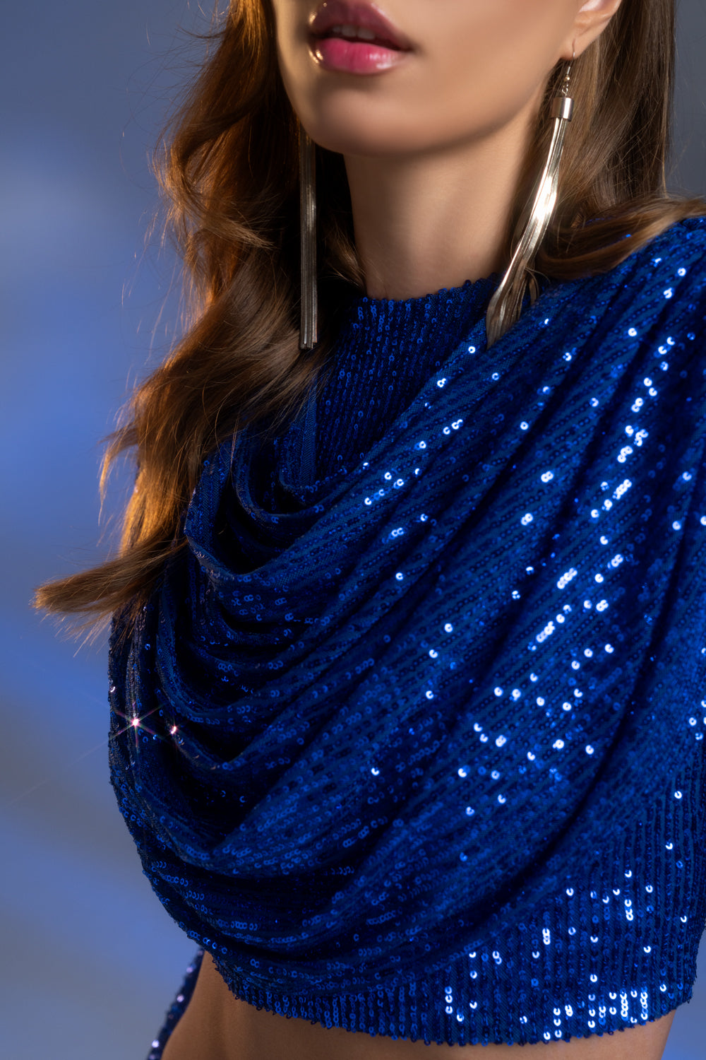 Saks Mavi Payetli Şal Detaylı Takım