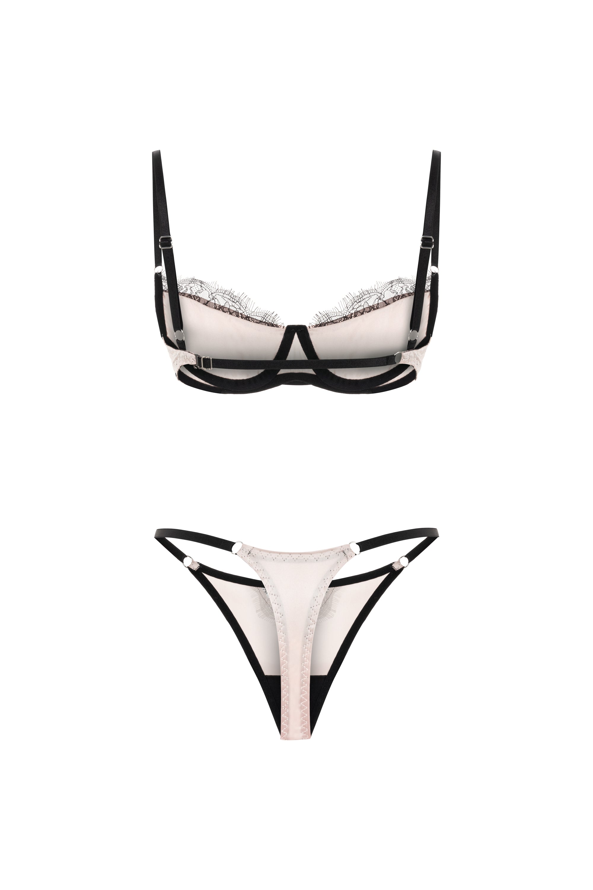Powder Set, hem sütyen hem de tangada yer alan ince dantel detaylarıyla lüks bir iç giyim setidir. Saten ipek kumaşı, zarif siyah dantel süslemeleriyle çarpıcı bir kontrast oluşturarak çekici ve zarif bir görünüm sunar. Ayarlanabilir askılarıyla rahat bir uyum sağlayan bu set, hem çekiciliği hem de sofistikeliği bir araya getirir.