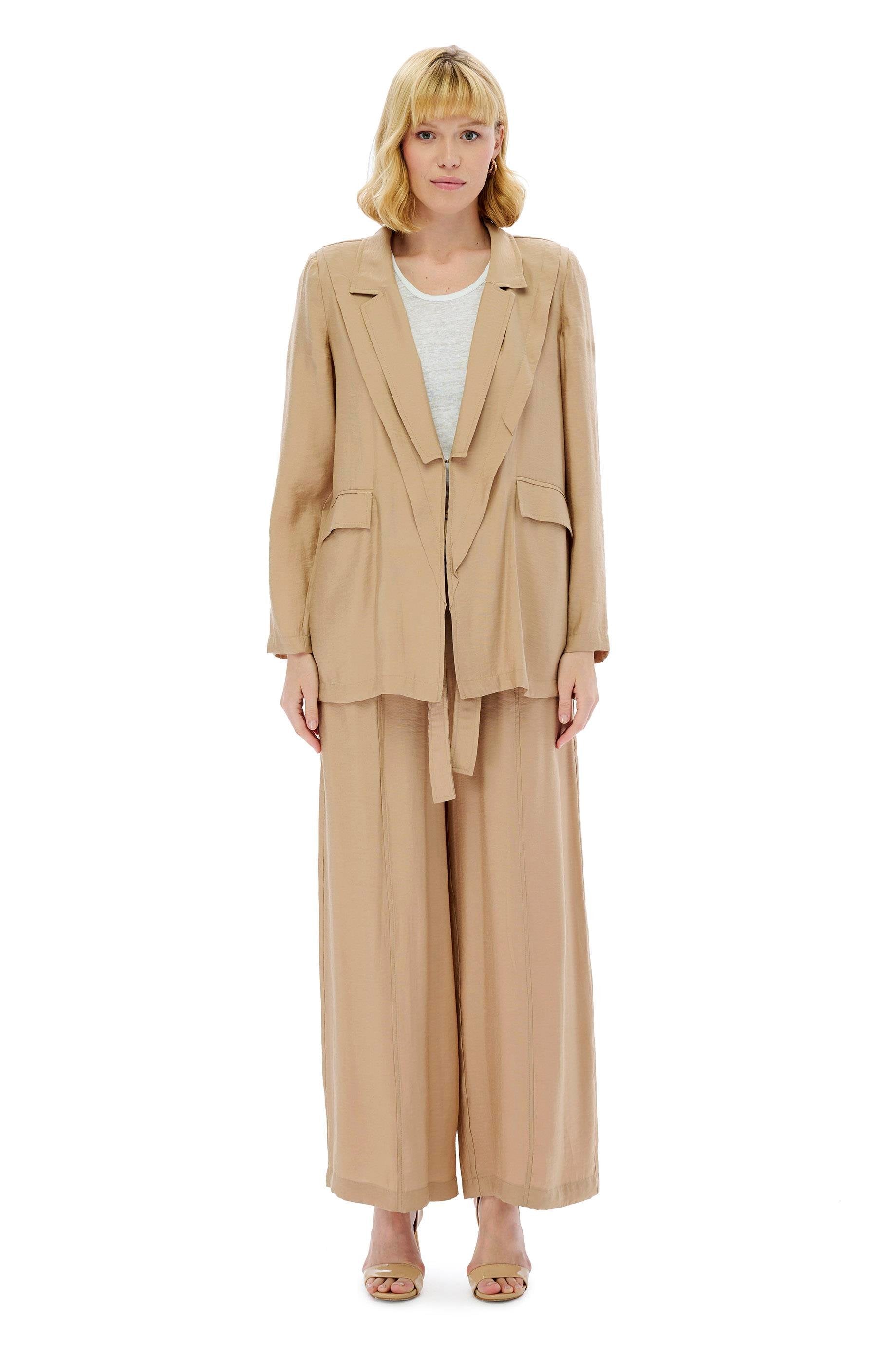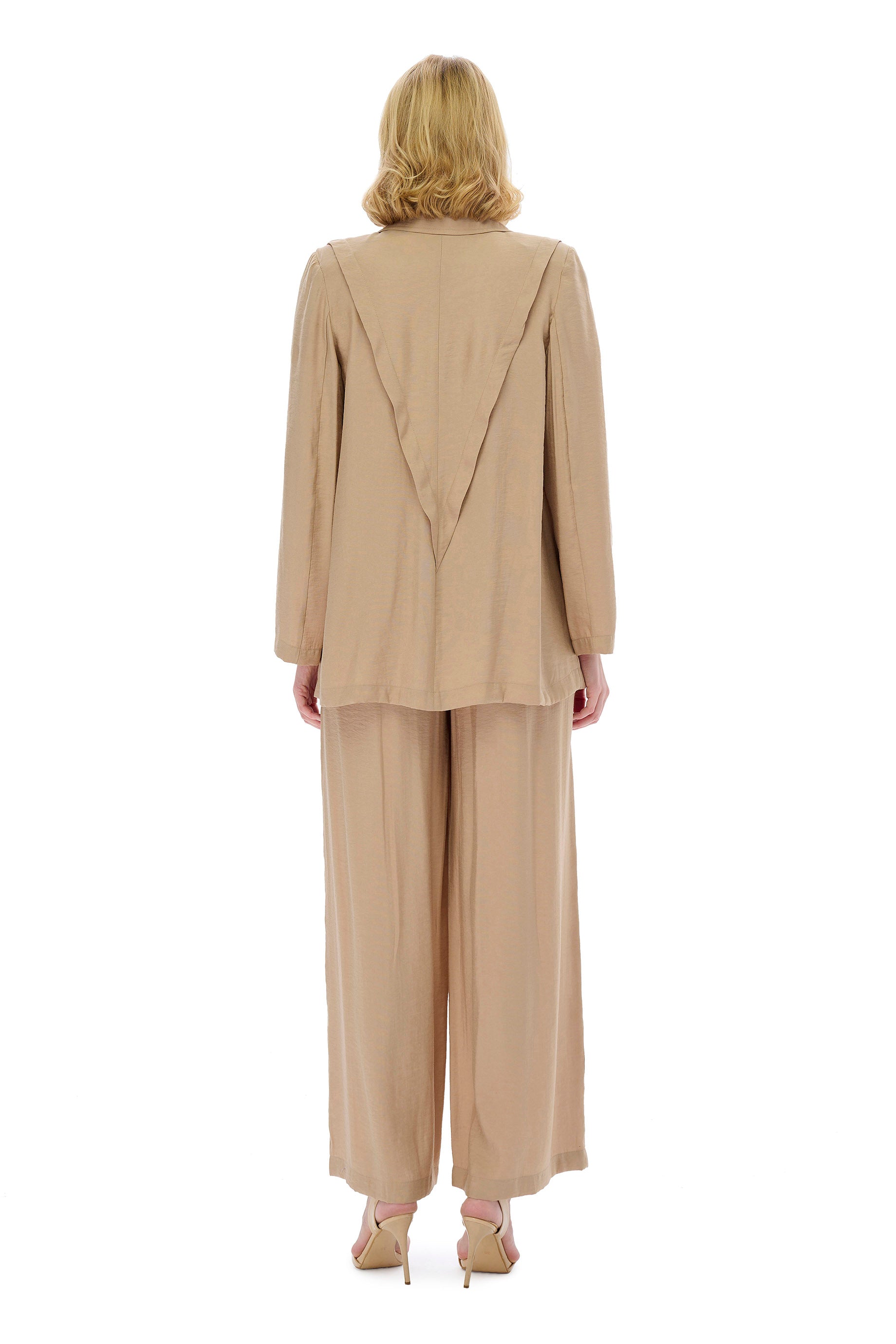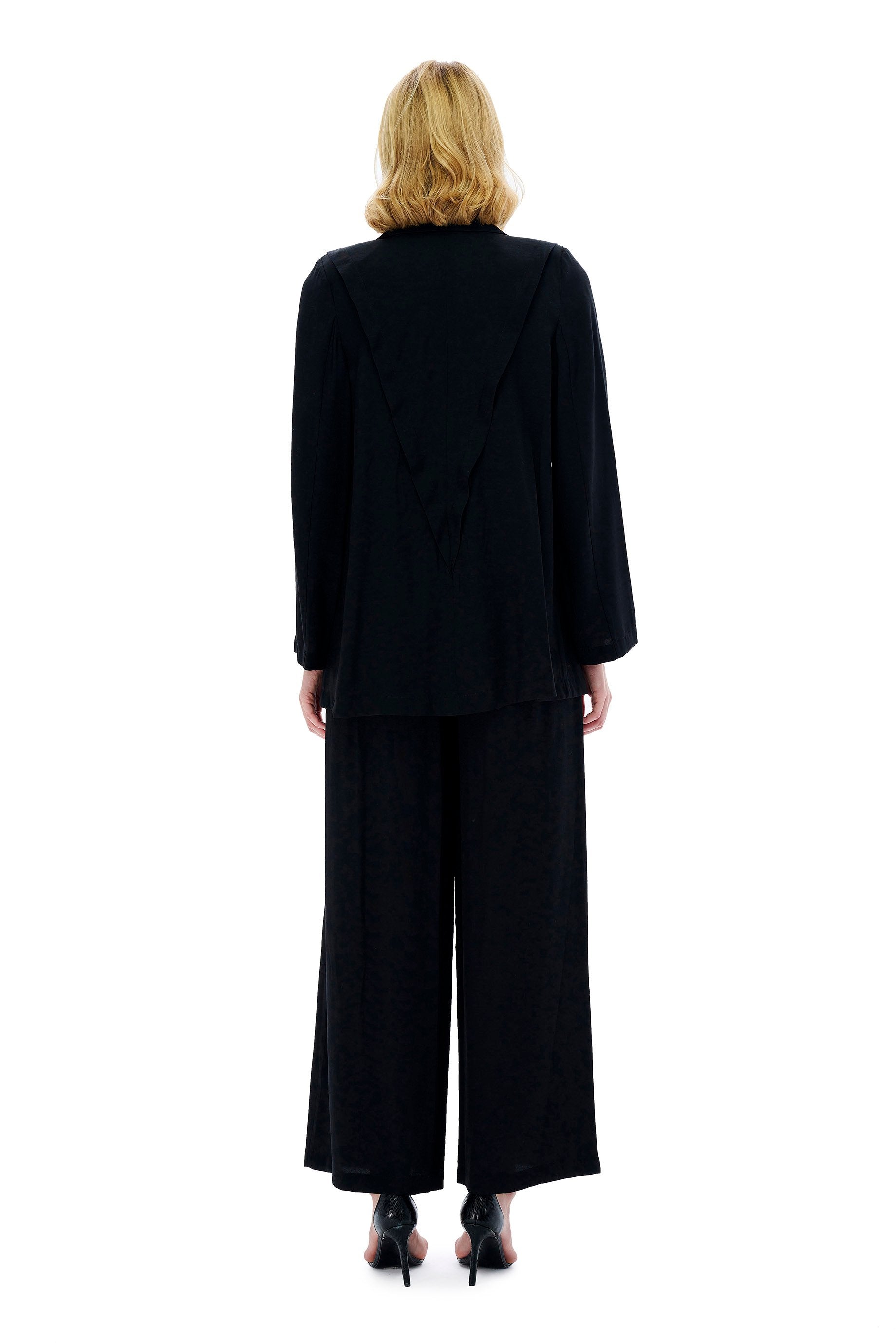 - Ürün Açıklaması: Pantolon: Belden lastikle büzdürmeli, kuşaklı, yandan cepli, çima dikişli, bol paça pantolon.Ceket: Vatkalı, geniş nervür detaylı, agraf kapamalı, süs cep fletolu ceket.