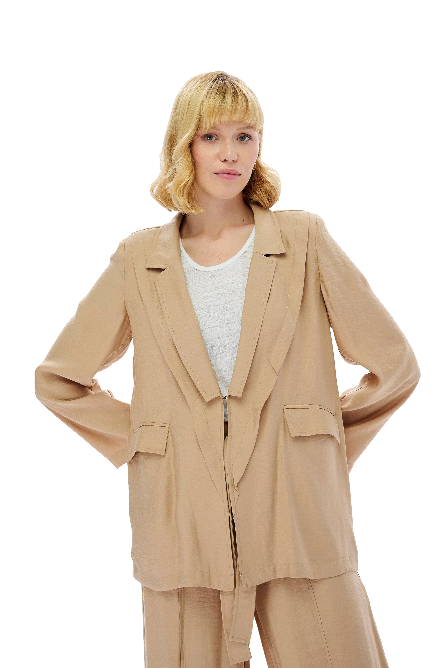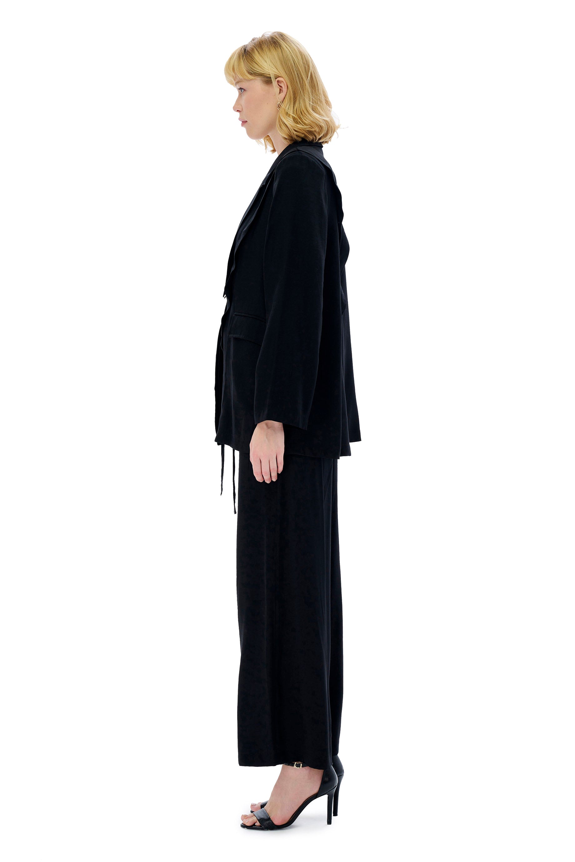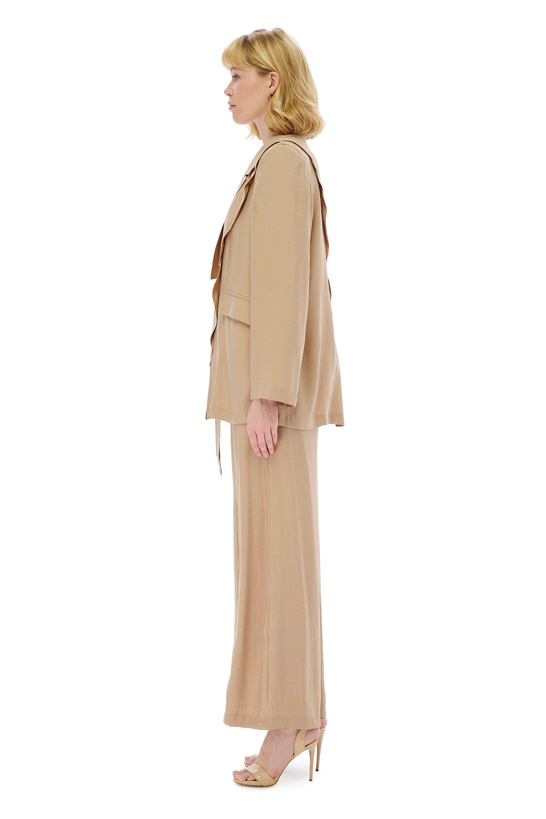 - Ürün Açıklaması: Pantolon: Belden lastikle büzdürmeli, kuşaklı, yandan cepli, çima dikişli, bol paça pantolon.Ceket: Vatkalı, geniş nervür detaylı, agraf kapamalı, süs cep fletolu ceket.
