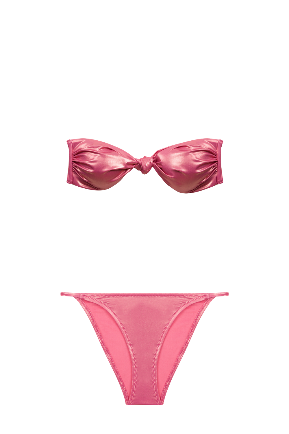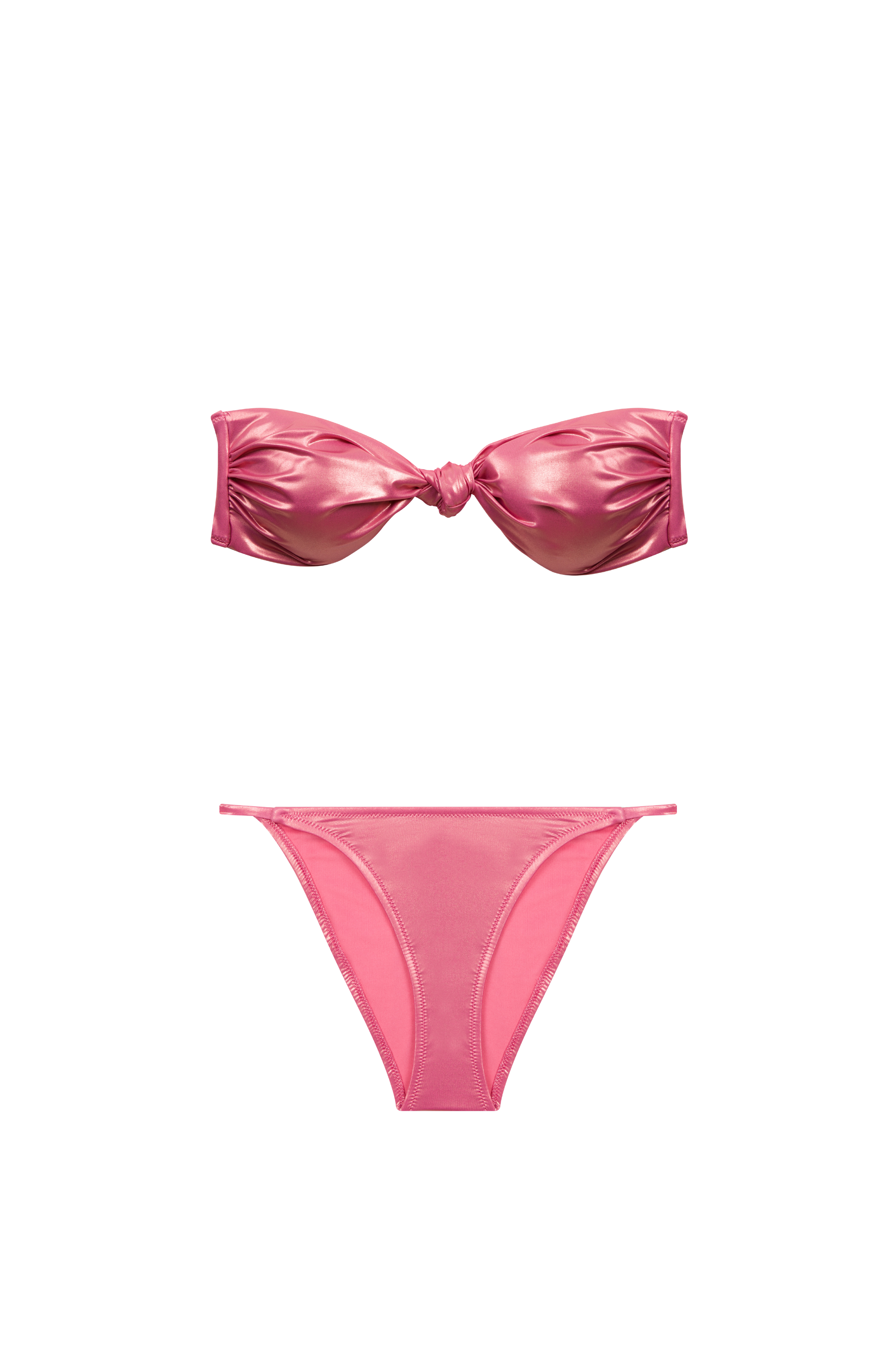 The "Honeybunny" set is your go-to for a dazzling summer vibe. The sparkling pink strapless top, with its delightful center twist, pairs beautifully with a range of bottoms from our collection. Mix and match with "Goddess of the Moon", "Hotter Than Hell", "Maneater", "Sounds of the Ocean", or "Sweetheart" for a personalized look that's as versatile as it is stunning. Ready to turn heads at any beach or pool party, "Honeybunny" is a playful yet elegant choice for the fashion-forward beachgoer.