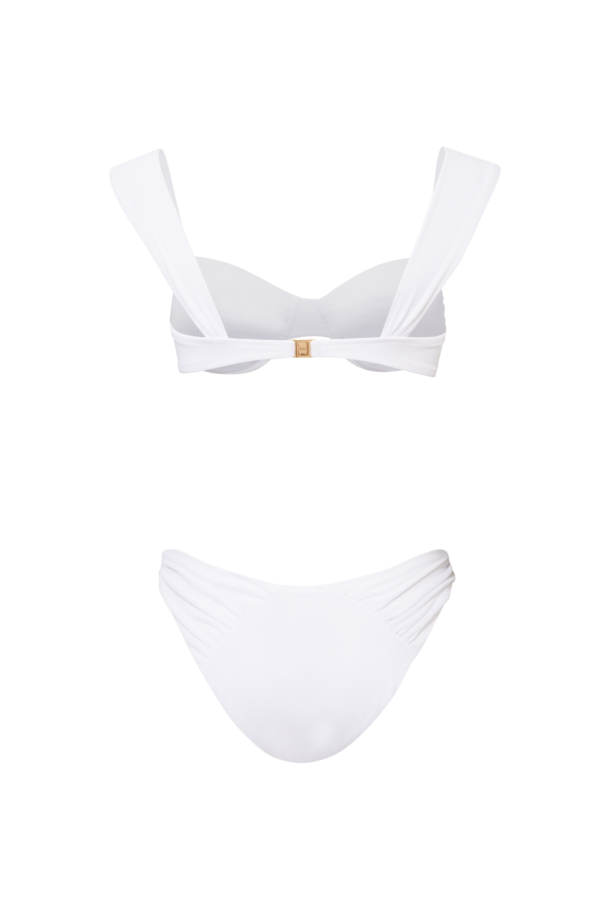 Anna Bikini Üstü, drapeli tasarımıyla rahatlık ve şıklığı bir araya getiriyor. Havlu kumaş dokusu, beyaz tonuyla birleşerek tasarıma ferah ve modern bir görünüm katıyor. Gün boyu konforlu ve zarif bir plaj stili için ideal bir tercih.