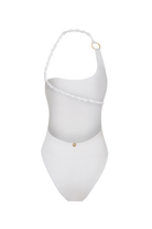 Kaia Mayo, tek omuz tasarımı ve özenle işlenmiş örgü detayıyla öne çıkıyor. Yumuşak havlu kumaştan üretilen bu mayo, rahat ve modern bir görünüm sunuyor. Beyaz tonu, tasarıma ferah bir dokunuş katıyor ve unutulmaz yaz günleri için mükemmel bir seçim haline geliyor.