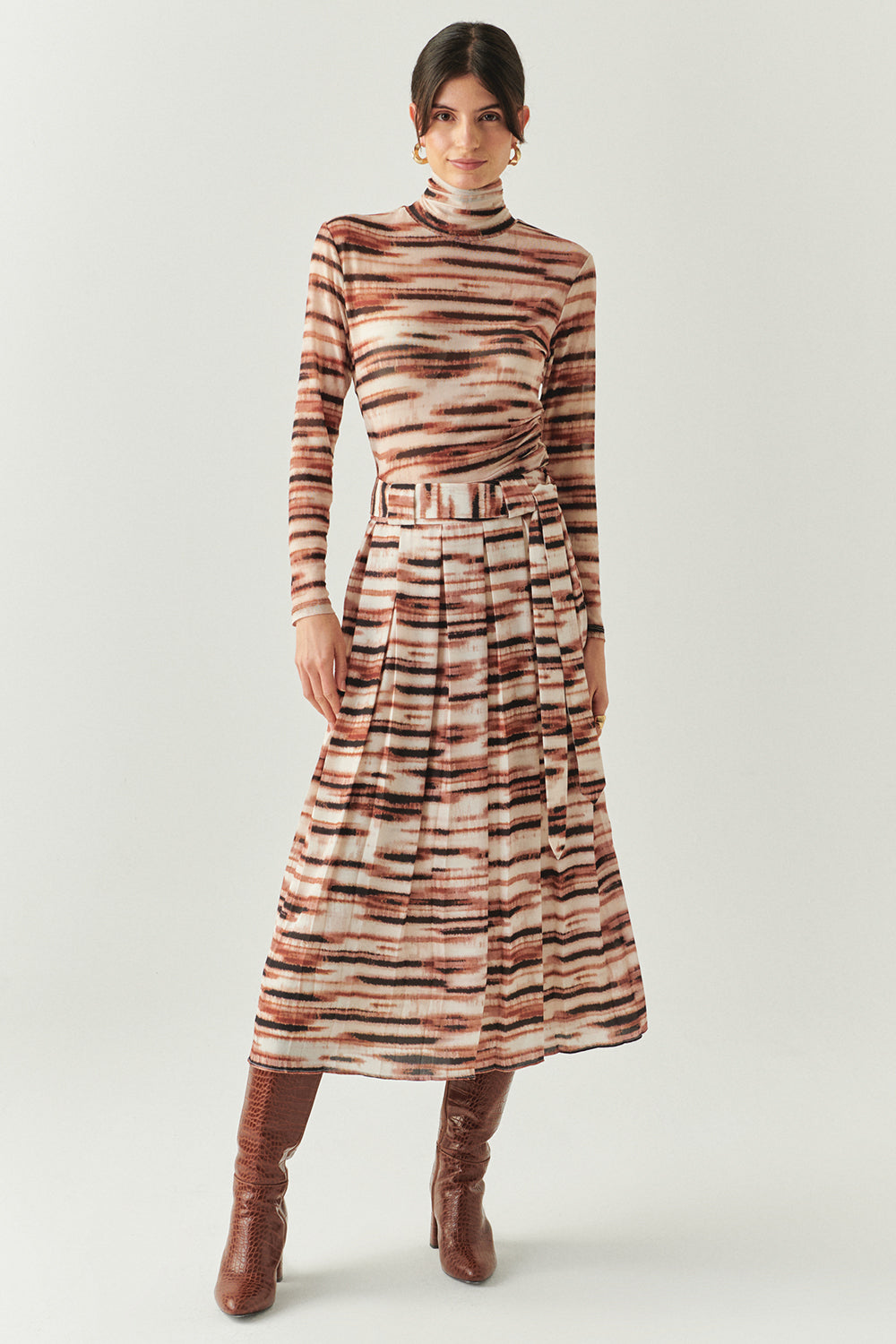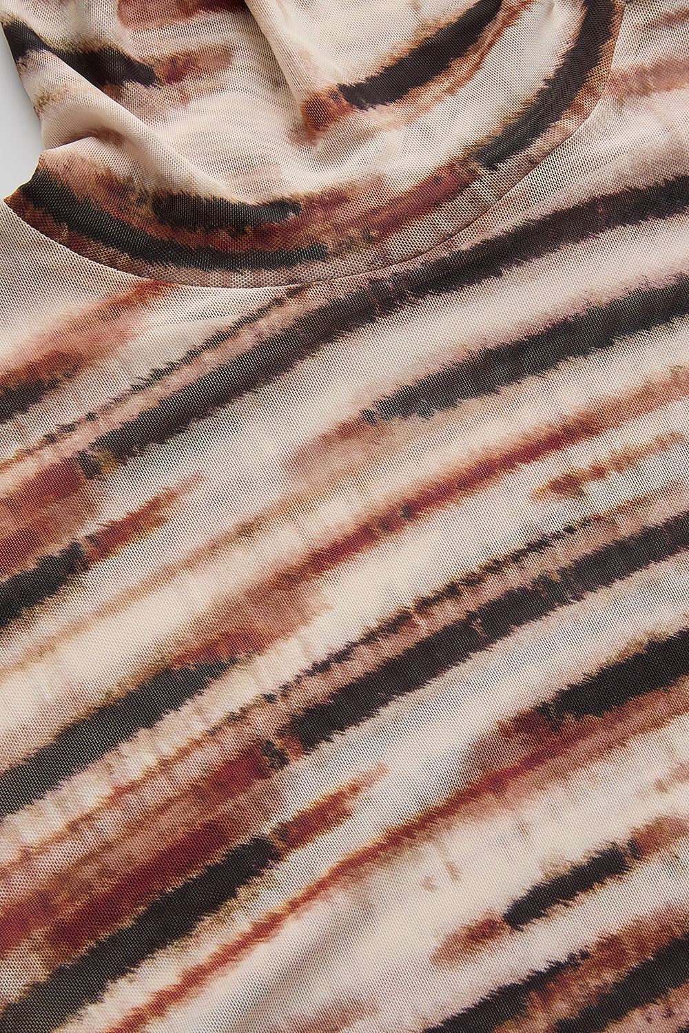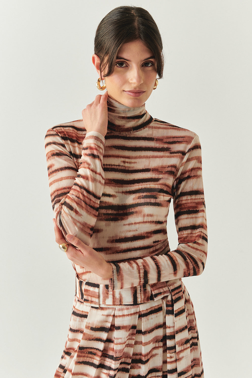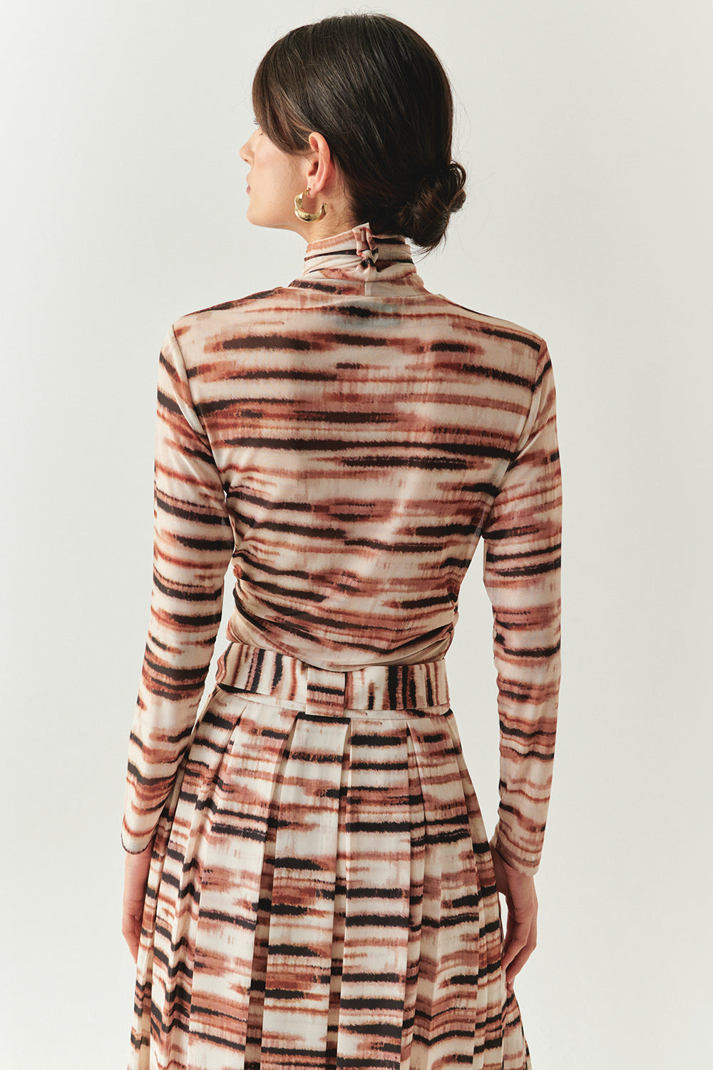 Yumuşacık tül dokusuyla teninize hafifçe dokunan bu boğazlı bluz, gün batımının sıcak tonlarını andıran çok renkli deseniyle adeta hareket eden bir tablo gibi görünür. Uzun kolları ve hafif büzgü detayları, hem zarif hem modern bir siluet yaratırken, esnek yapısı gün boyu konfor sunar. İster aynı desenli etekle baştan aşağı uyum yakalayın, ister düz renk bir pantolonla deseni ön plana çıkarın; bu parça, bulunduğunuz her ortamda dikkatleri üzerinize çekecek.