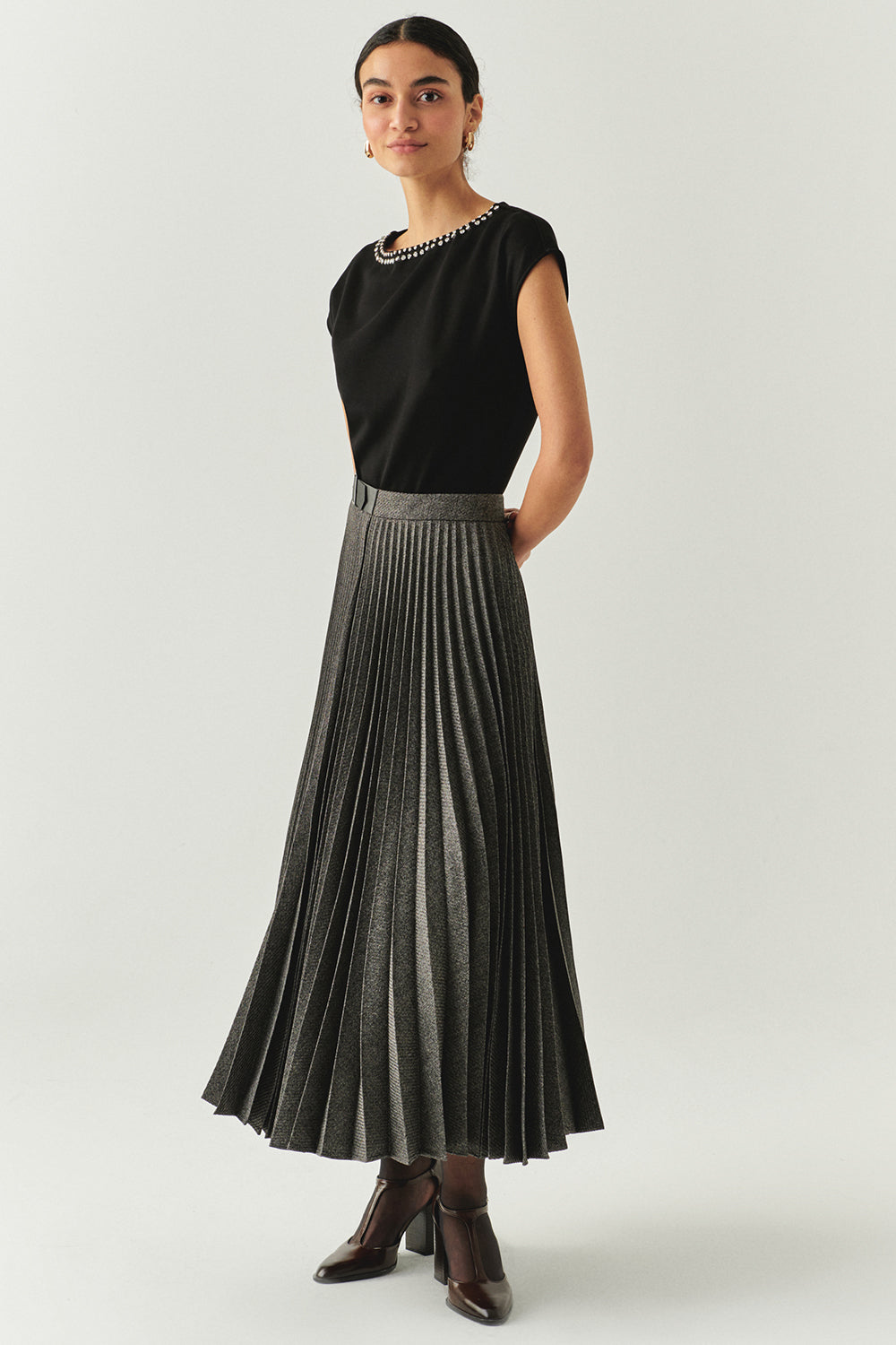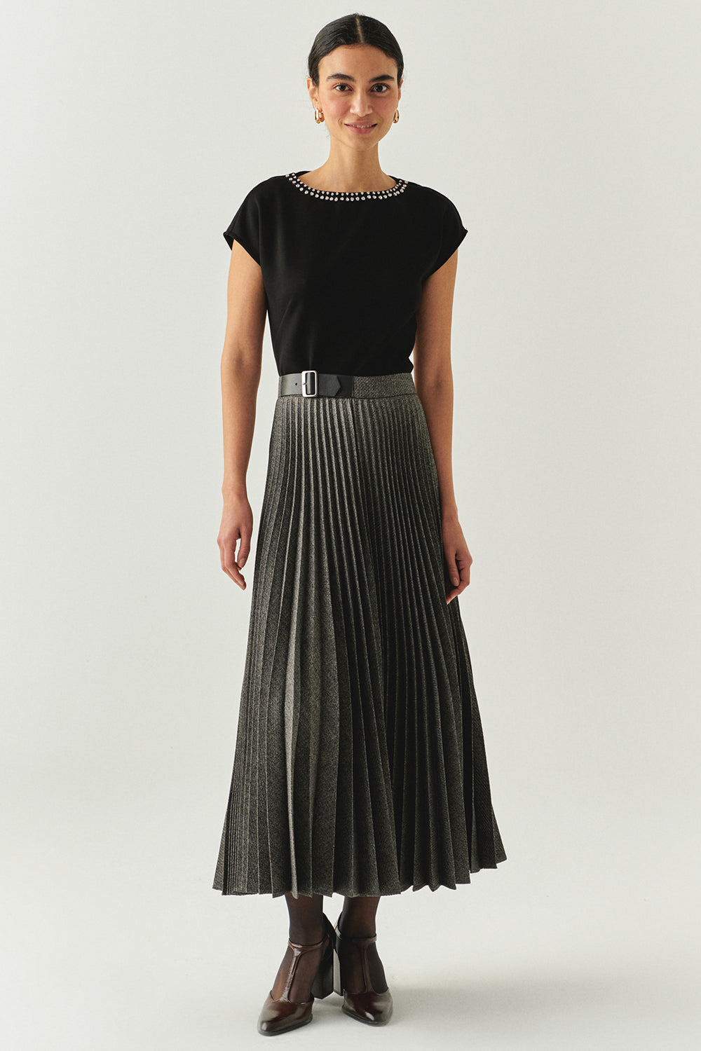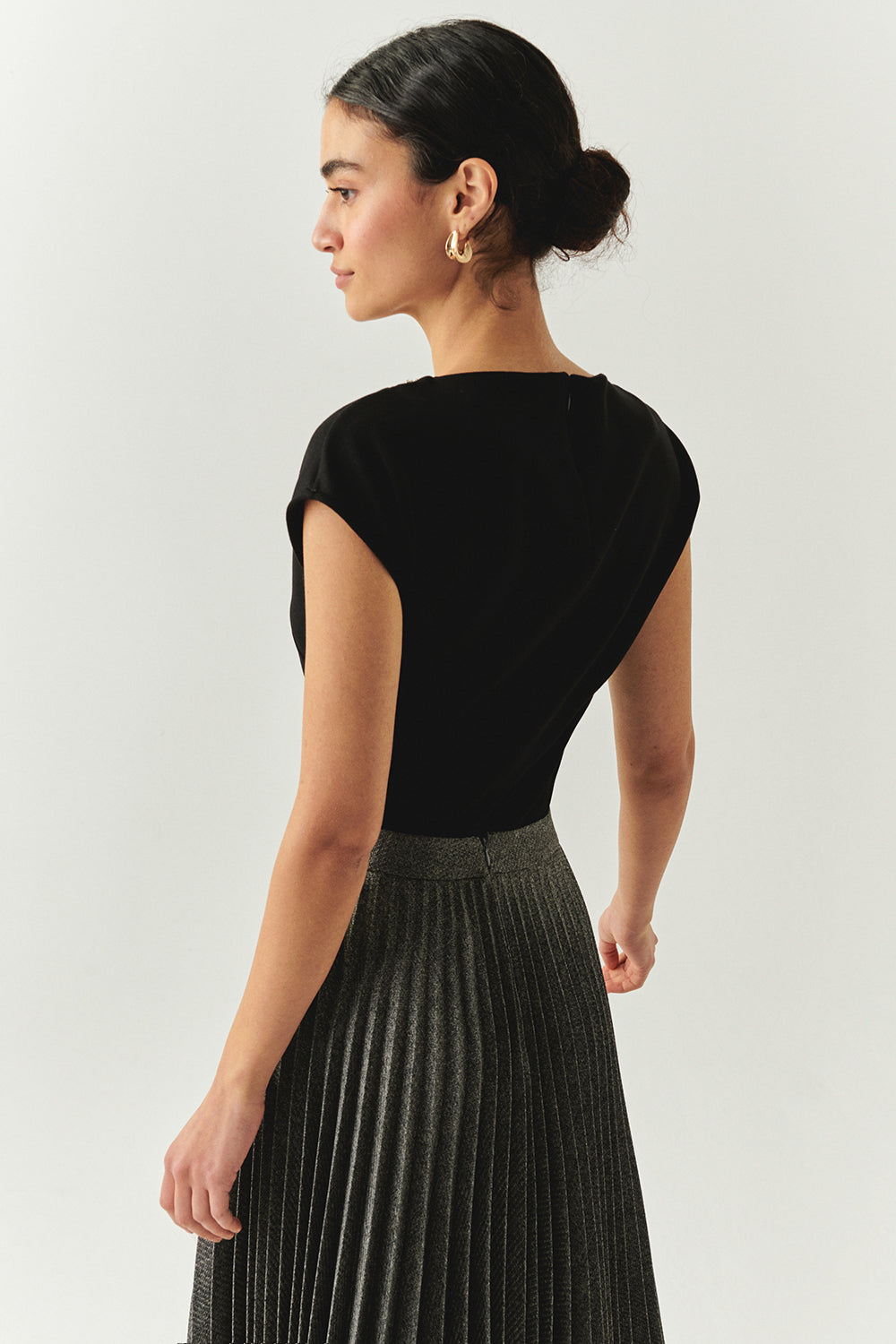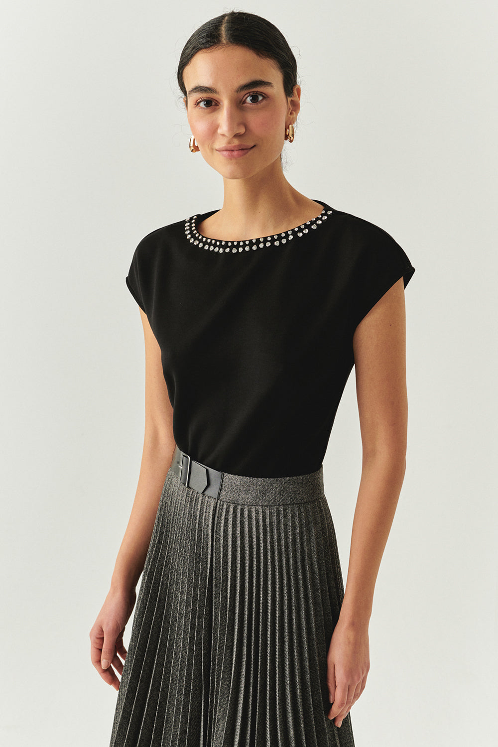 Kayık yakasını çevreleyen zarif taş detaylarıyla ışığı yakalayan bu kolsuz siyah bluz, yumuşak örme dokusu ve regular kesimiyle hem rahat hem de şık bir duruş sunar; metalik pileli bir etekle akşam davetine hazırlanabilir ya da klasik pantolonla gündüzden geceye uzanan kusursuz bir görünüm yakalayabilirsiniz, tıpkı sabah aceleyle seçip gün boyu kendinizi iyi hissettiğiniz o vazgeçilmez parçalar gibi.