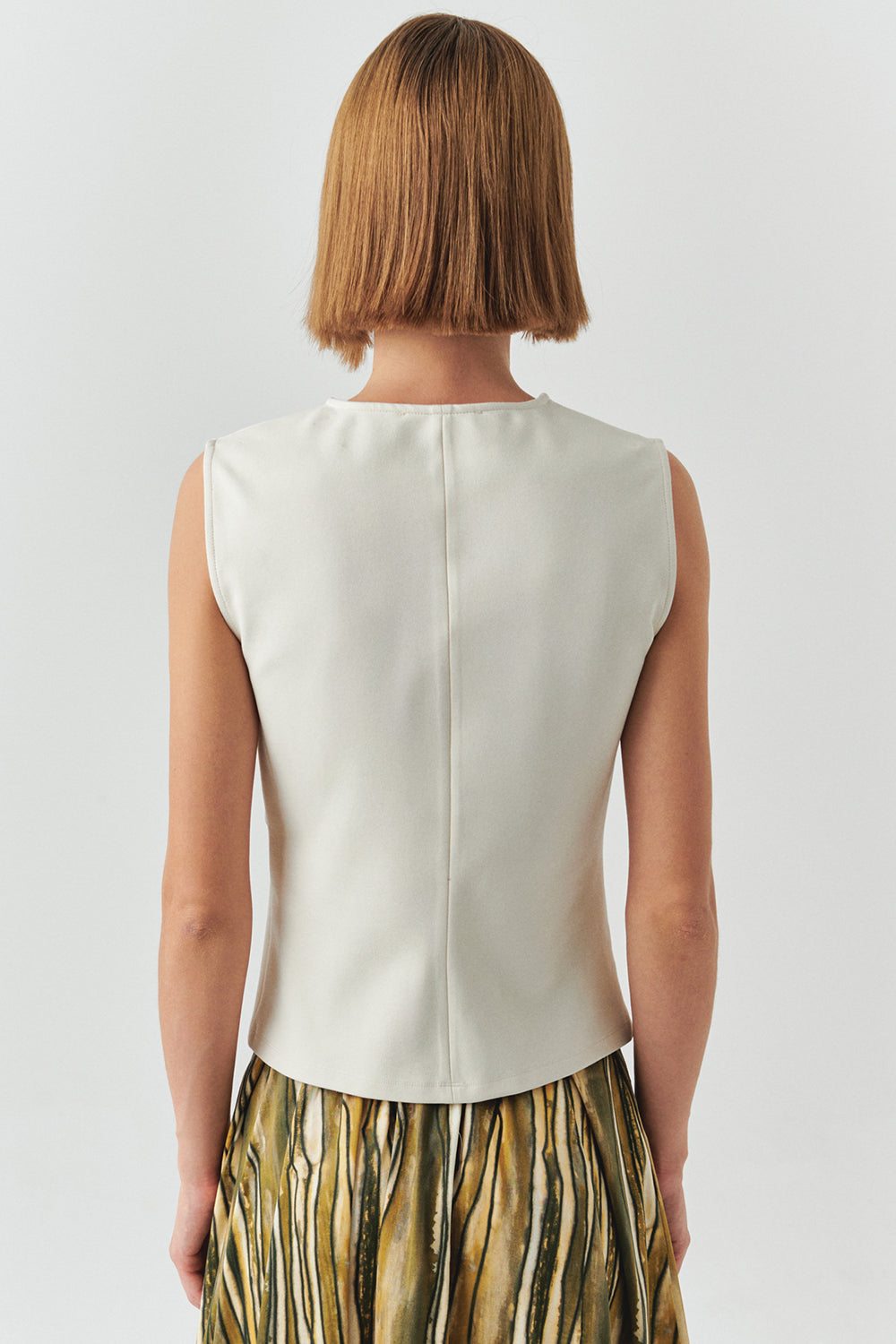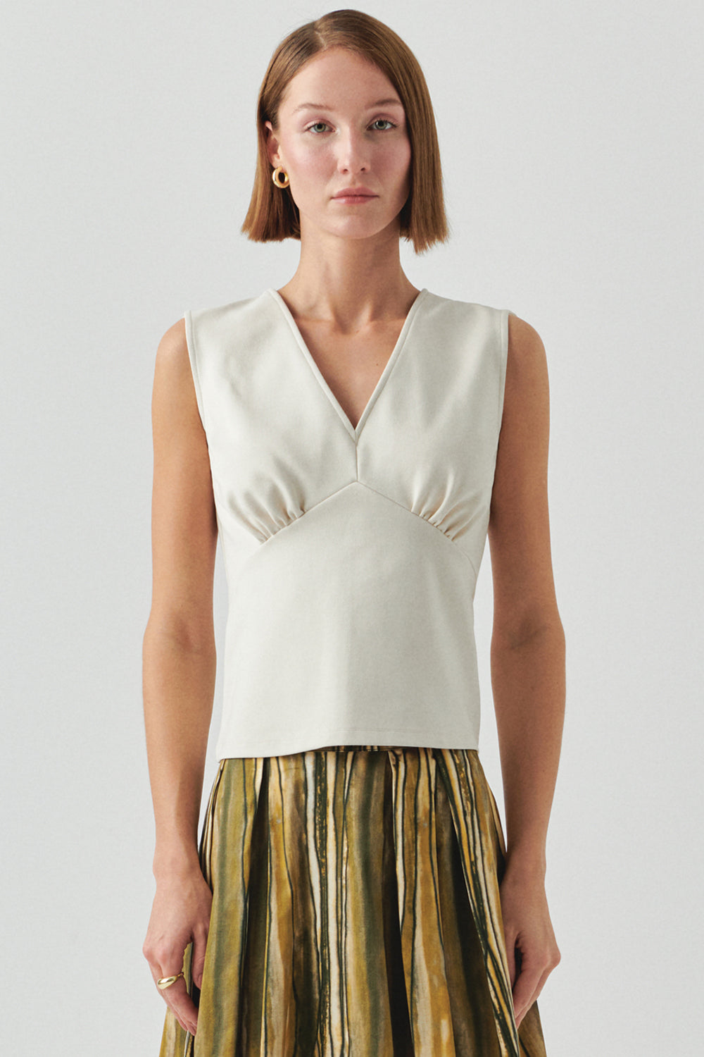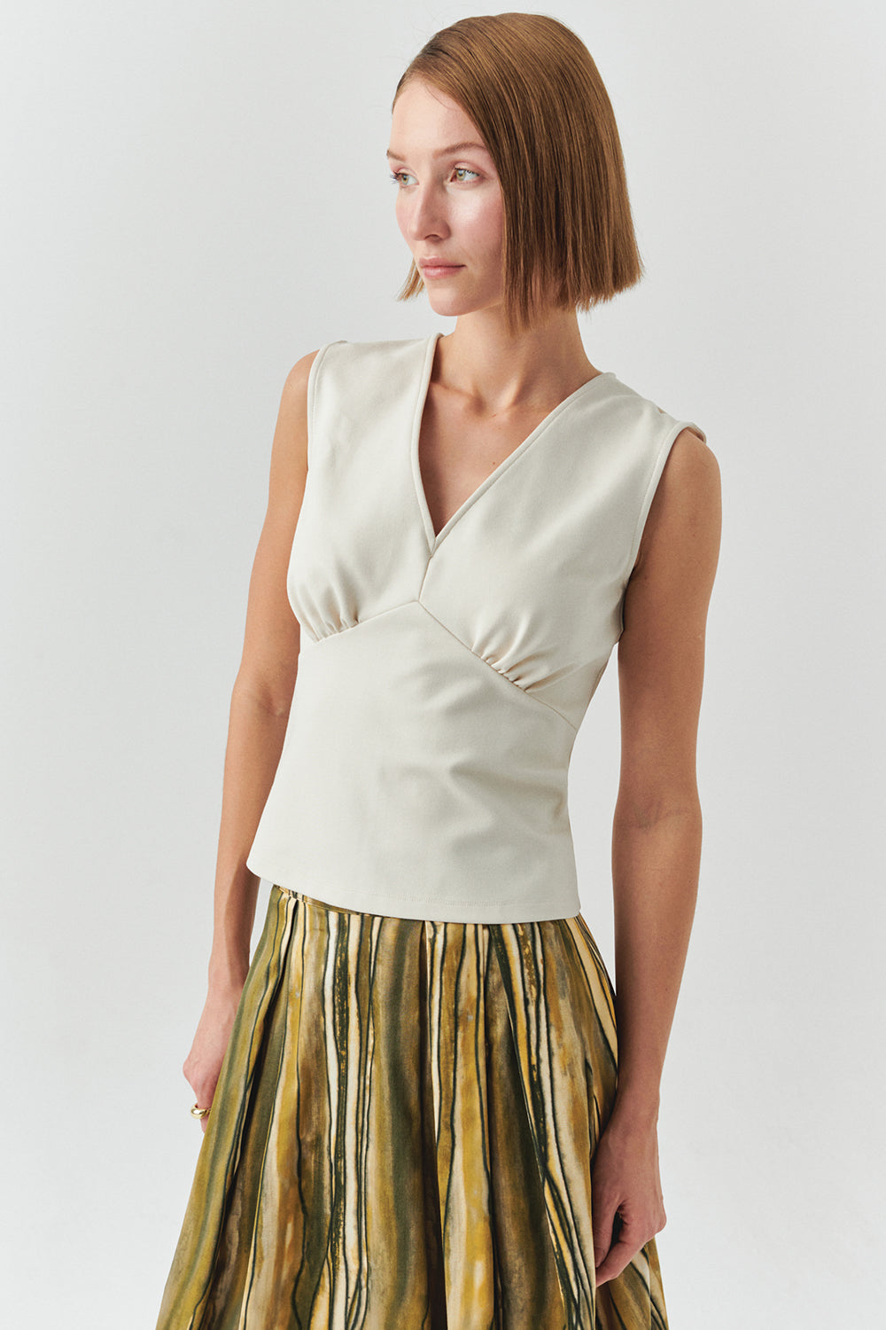 Yumuşak dokulu örme kumaştan üretilen bu kolsuz bluz, V yaka detayı ve vücuda oturan formuyla şık ve modern bir görünüm sunar. Günlük ve özel kombinlerde rahatlıkla kullanılabilir.