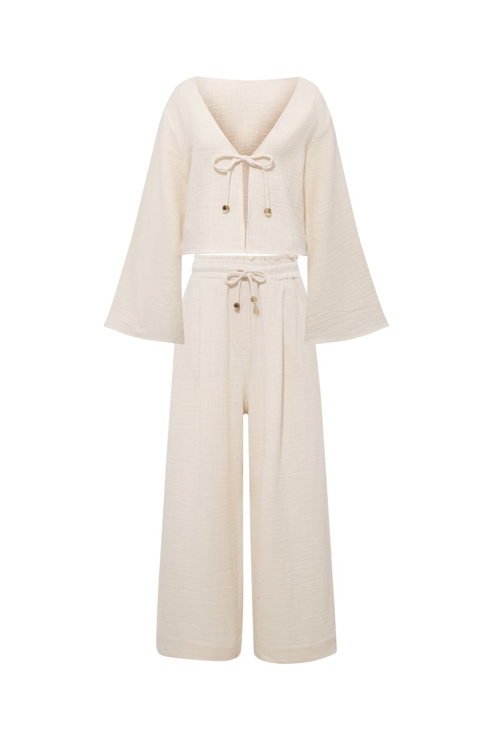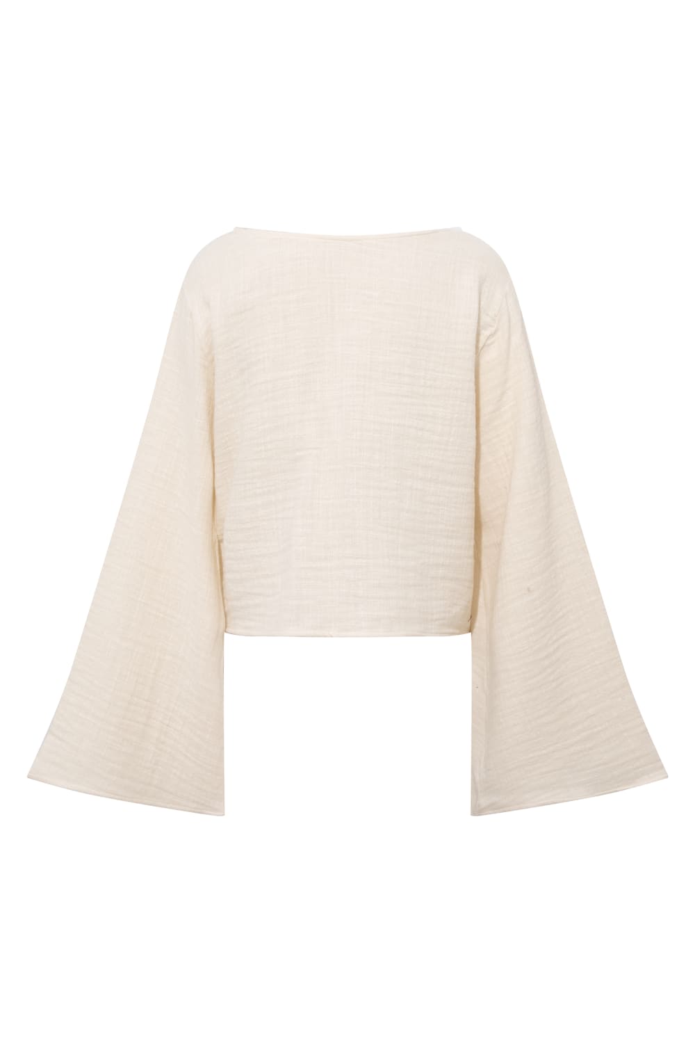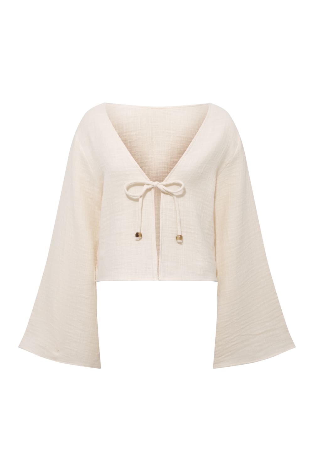 Keten Dokulu Önden Bağlamalı Ekru Bluz