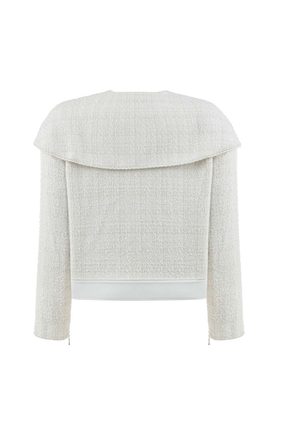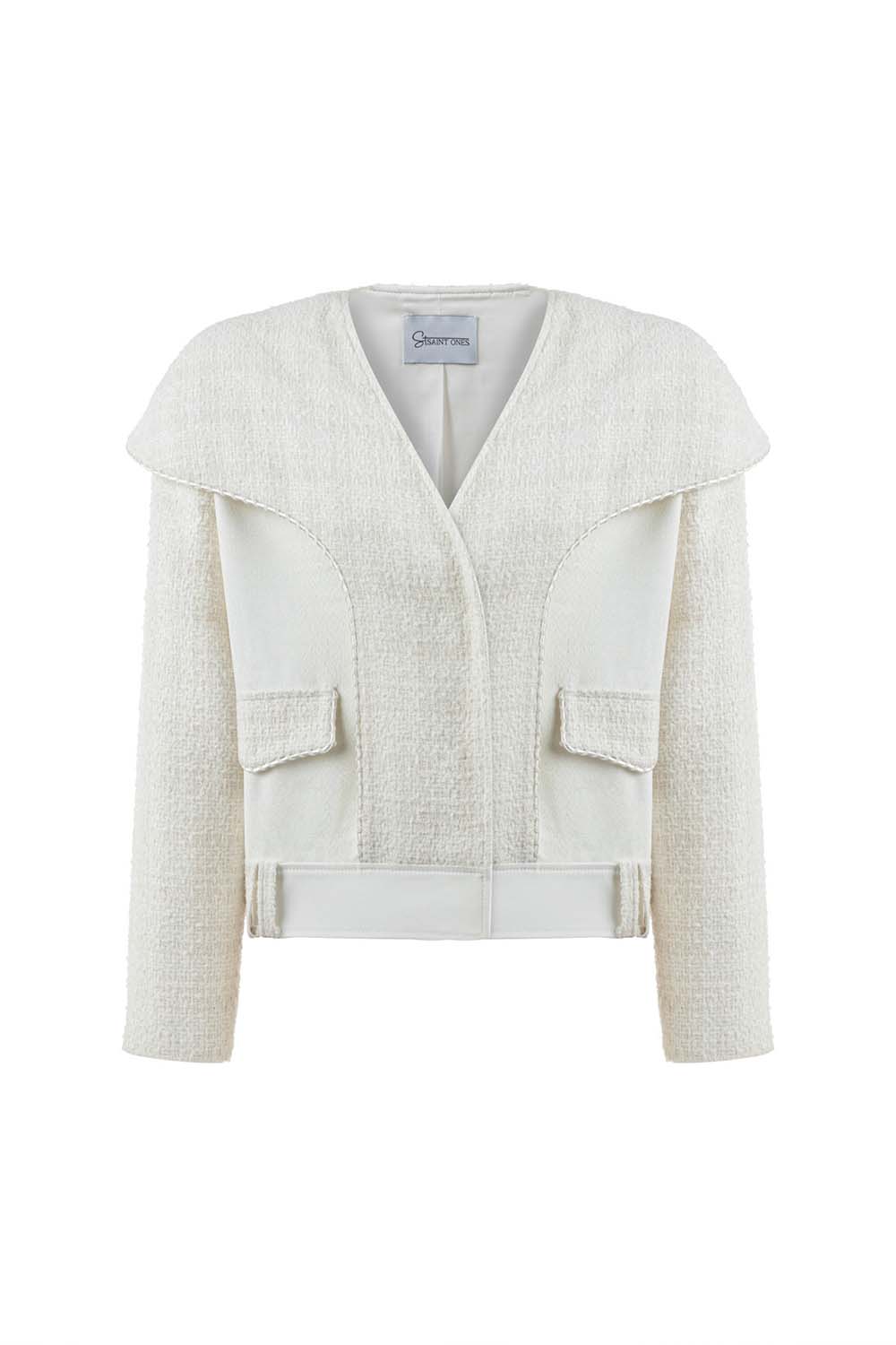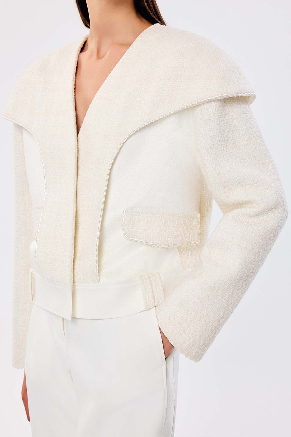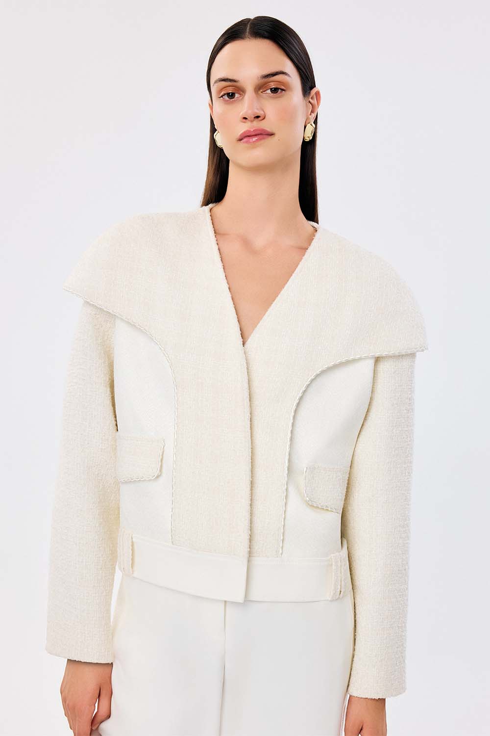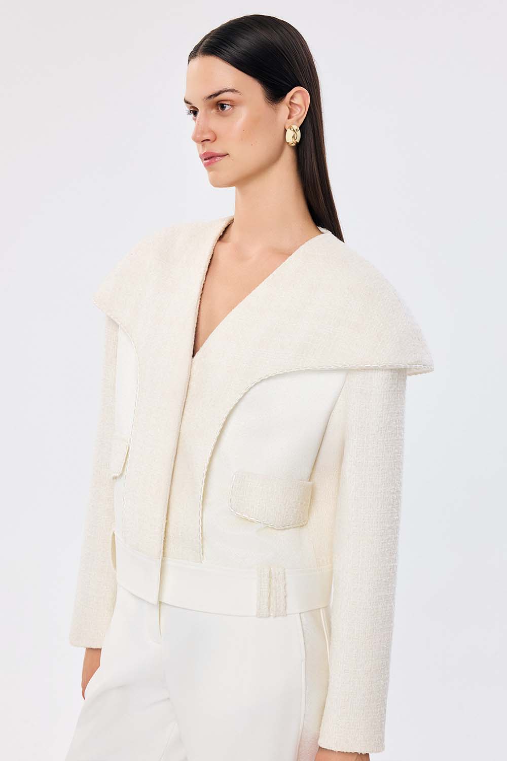 The Maia Jacket is a refined take on classic tailoring, featuring a sculptural oversized collar and structured silhouette. Crafted from textured ivory tweed with subtle tonal paneling, it exudes understated elegance. Functional pocket details and a clean, cropped cut make it a versatile statement piece for effortless sophistication.