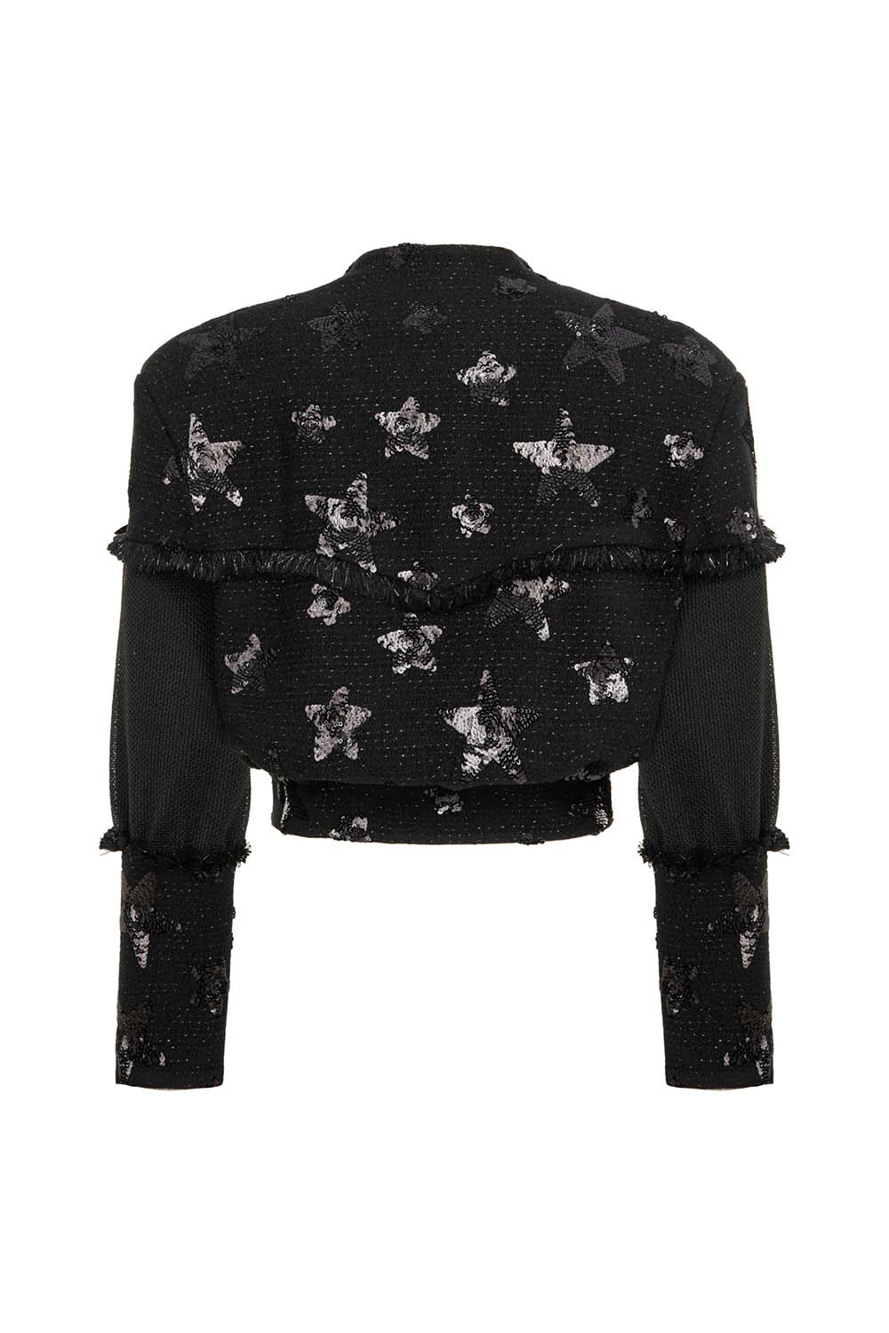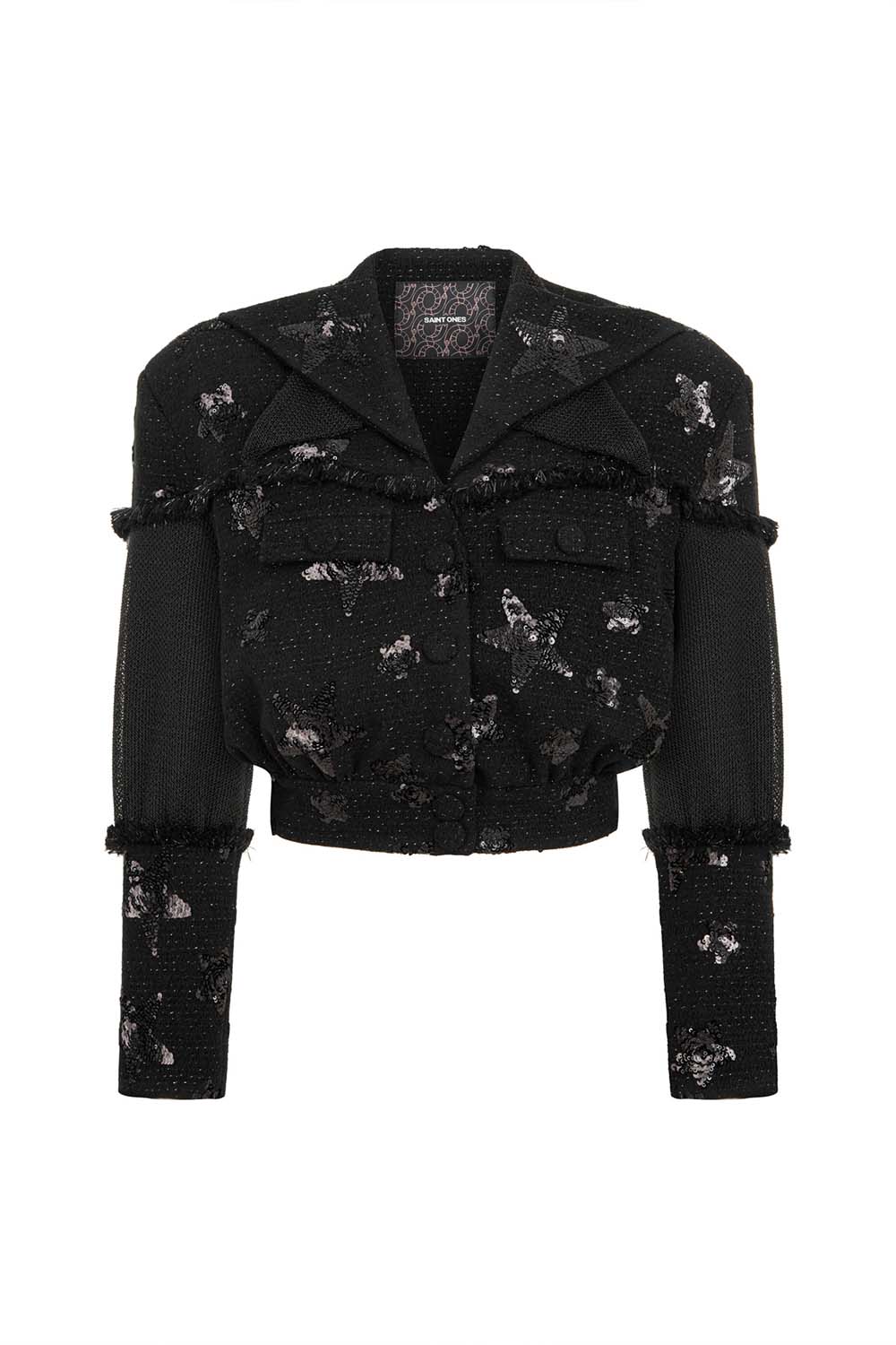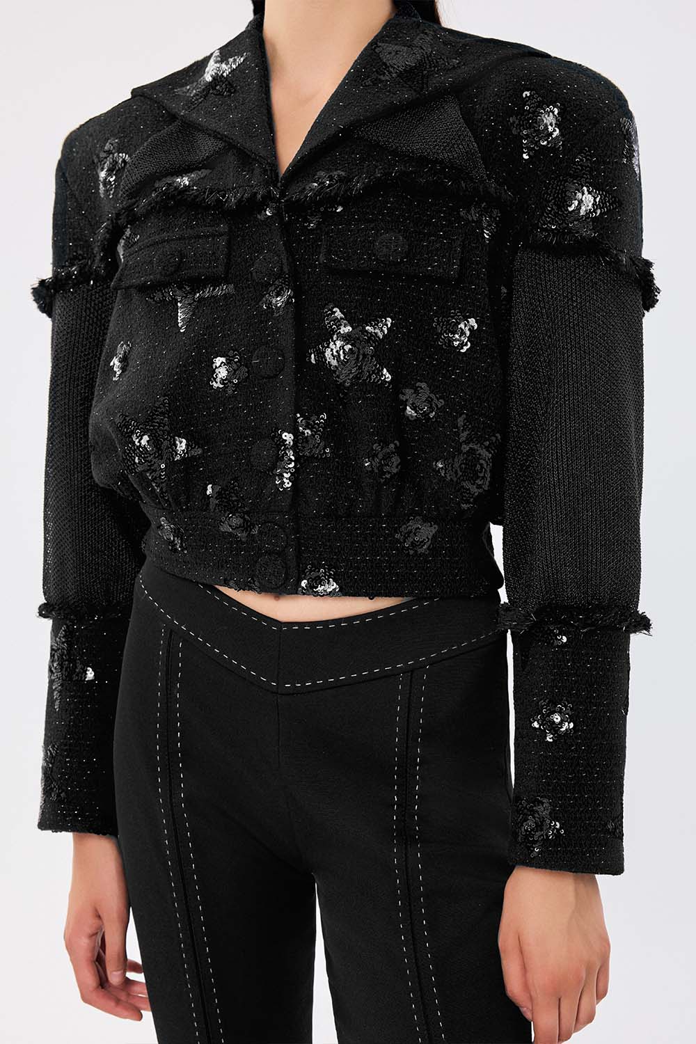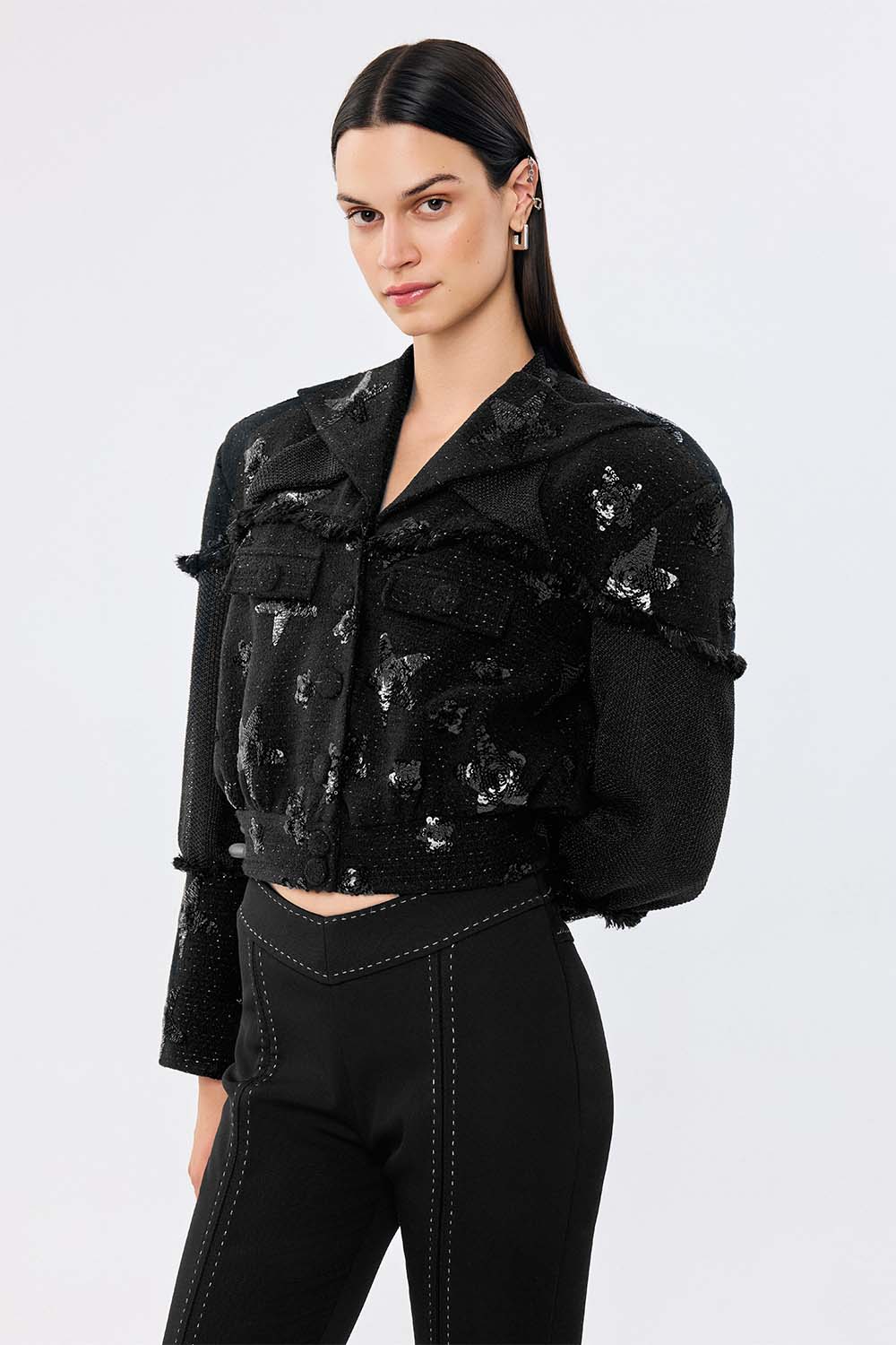 Nova is a cropped jacket designed to shimmer quietly yet command attention. With its sculptural shoulders and full sequin texture, it reflects light with every movement, giving a sense of mystery and magnetism. The layered construction and elasticated waist bring a sense of controlled volume, while the elongated sleeves and tailored cuffs anchor the silhouette. Nova is for the night.