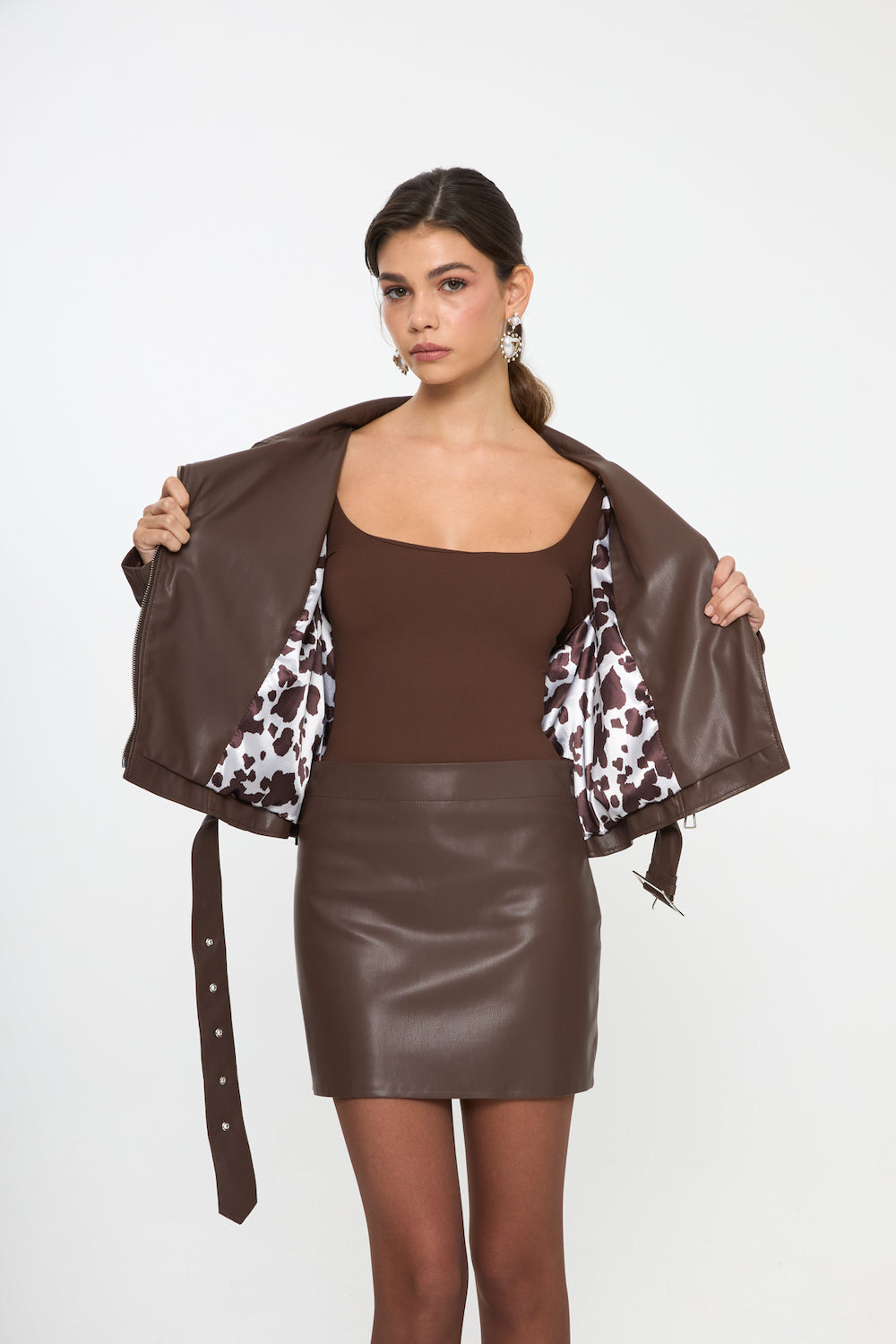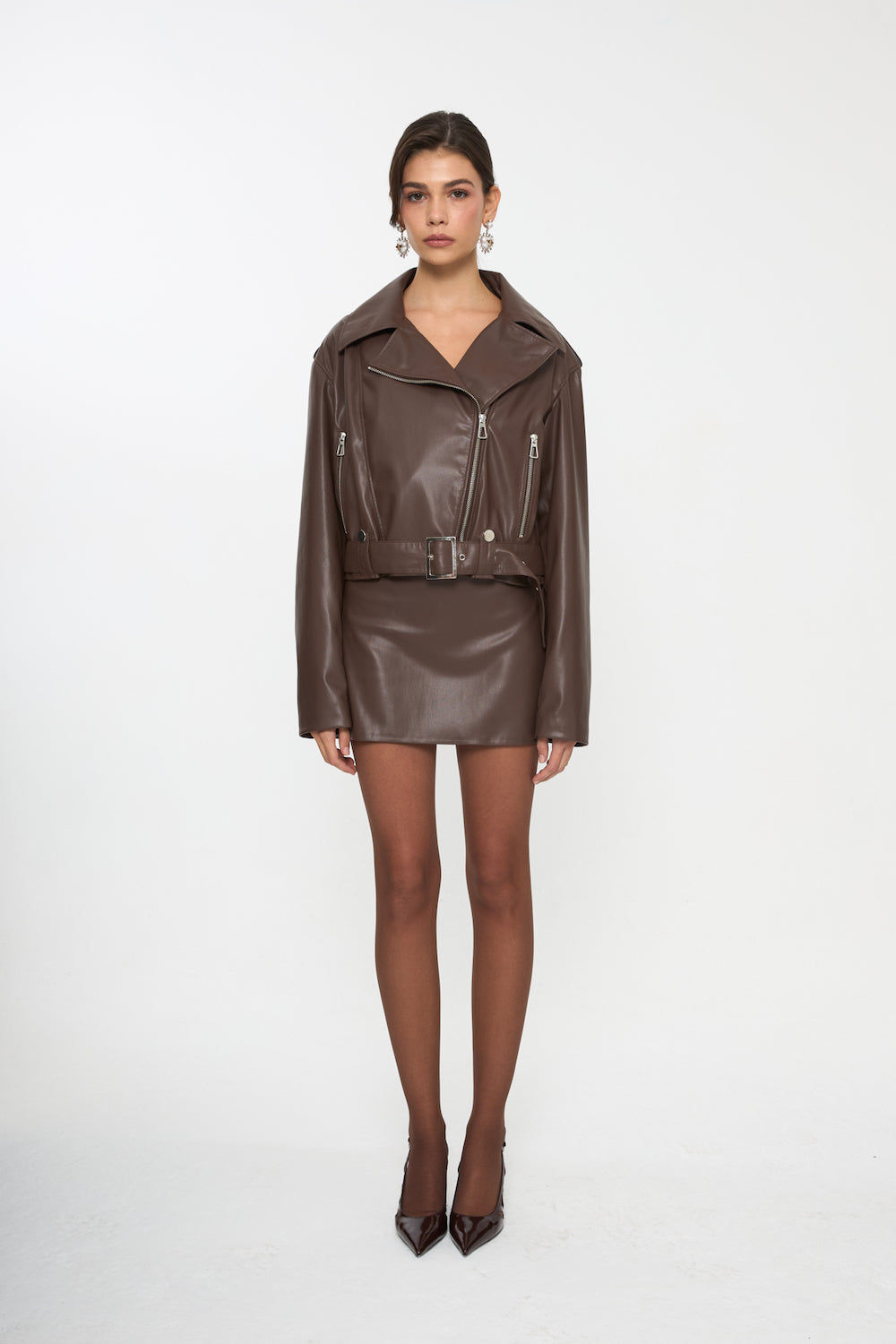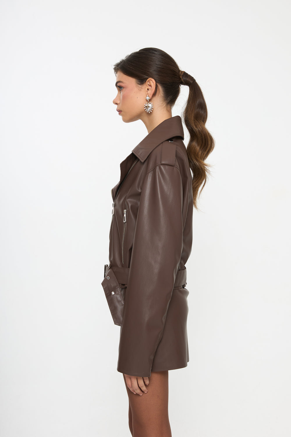 Kuralları yıkmaya hazır olanlar için tasarlanan Zina Deri Ceket, klasik biker formunu modern ve güçlü bir siluetle yeniden yorumluyor. Yumuşak dokulu suni deri kumaşı, mat parlaklığı ve iddialı fermuar detaylarıyla şehir stiline asi ama sofistike bir duruş katıyor. Geniş yakası, bel kemeri ve metal donanımları; cekete karakter katan imza detaylar arasında.