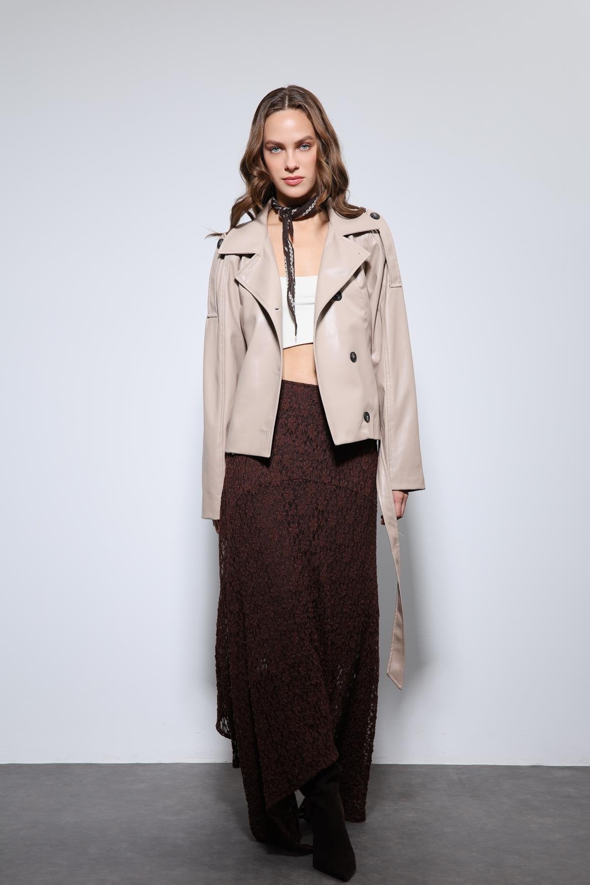 Bej renkte, kemerli tasarıma sahip suni deri kadın mont modelidir. Modern kesimi ve yapılandırılmış formu sayesinde hem günlük hem şehir stiline kolaylıkla uyum sağlar. Şık ve kullanışlı detayları ile sezon boyunca rahat bir kullanım sunar. Türkiye’de üretilmiştir.