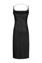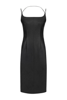 Vücuda oturan bir siluete, ince omuz askılarına ve arka eteğinde yırtmaç detayına sahip olan Valentina siyah suni deri midi elbise.