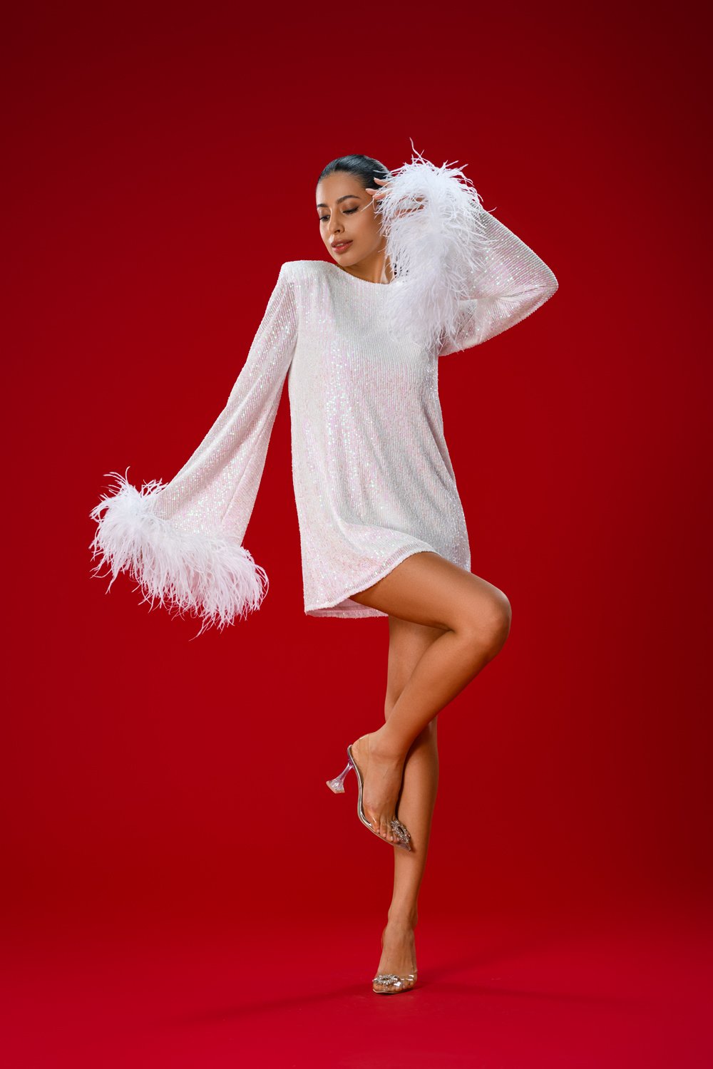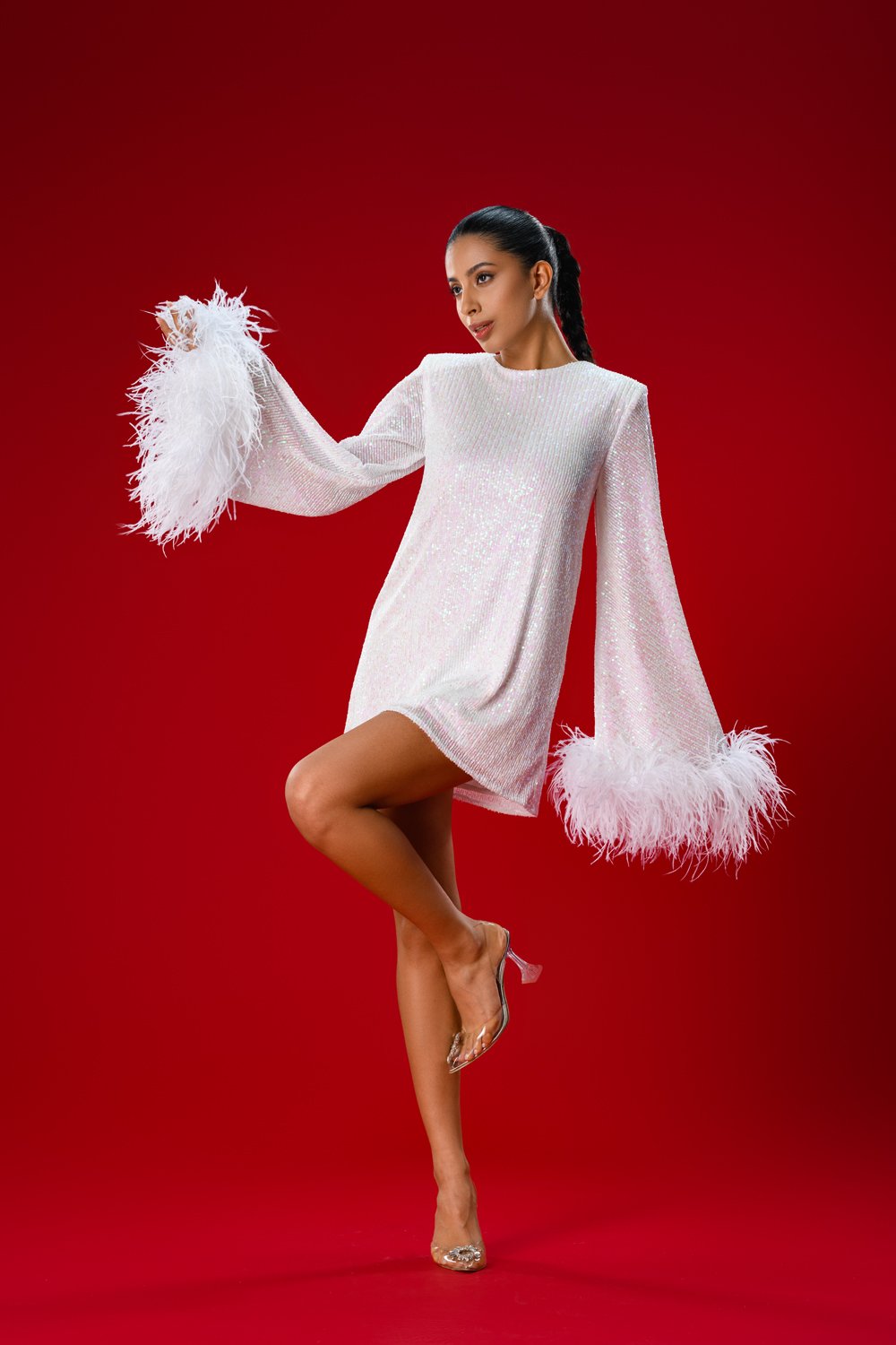 Işıltılı beyaz payet dokusu ve dramatik tüy detaylarıyla göz alıcı bir siluet sunan bu mini elbise, özel gecelerde fark edilmek isteyenler için tasarlandı. Vatkalı geniş kol formu güçlü bir duruş sağlarken, astarlı yapısı iç göstermez ve kullanım boyunca konfor sunar. Kullanılan yoğun ve premium devekuşu tüyleri elbiseye lüks bir hareket ve sahne etkisi kazandırır.