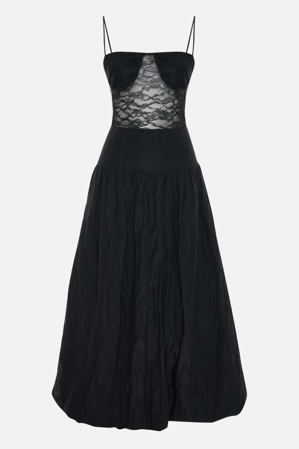 Üst kısmı dantel korsaj görünümüne sahip, ince askılı ve yarı transparan detaylarla tasarlanmış bu elbise, feminen ve modern bir siluet sunar. Göğüs kısmındaki yapılandırılmış cup detayı formu desteklerken, bel hattını vurgulayan dar kesim zarif bir duruş yaratır.