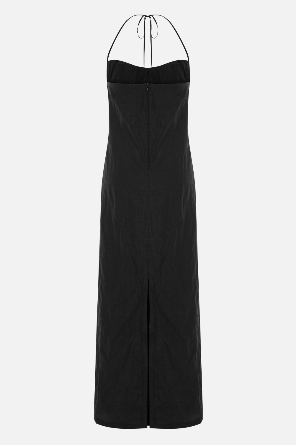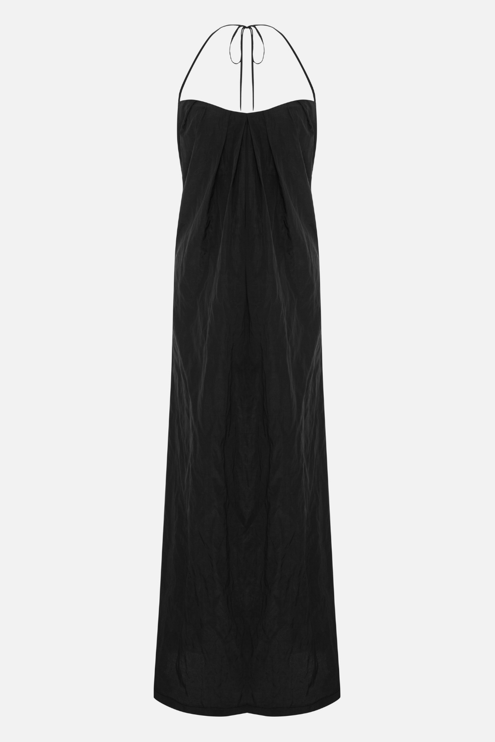 Hafif parlak dokusu ve modern çizgileriyle öne çıkan bu maxi elbise, polyamid, pamuk ve metal iplik karışımıyla üretilmiştir. İnce bağlamalı sırt detayı zarif bir görünüm sunarken, ön kısmındaki pileler akıcı bir duruş yaratır.