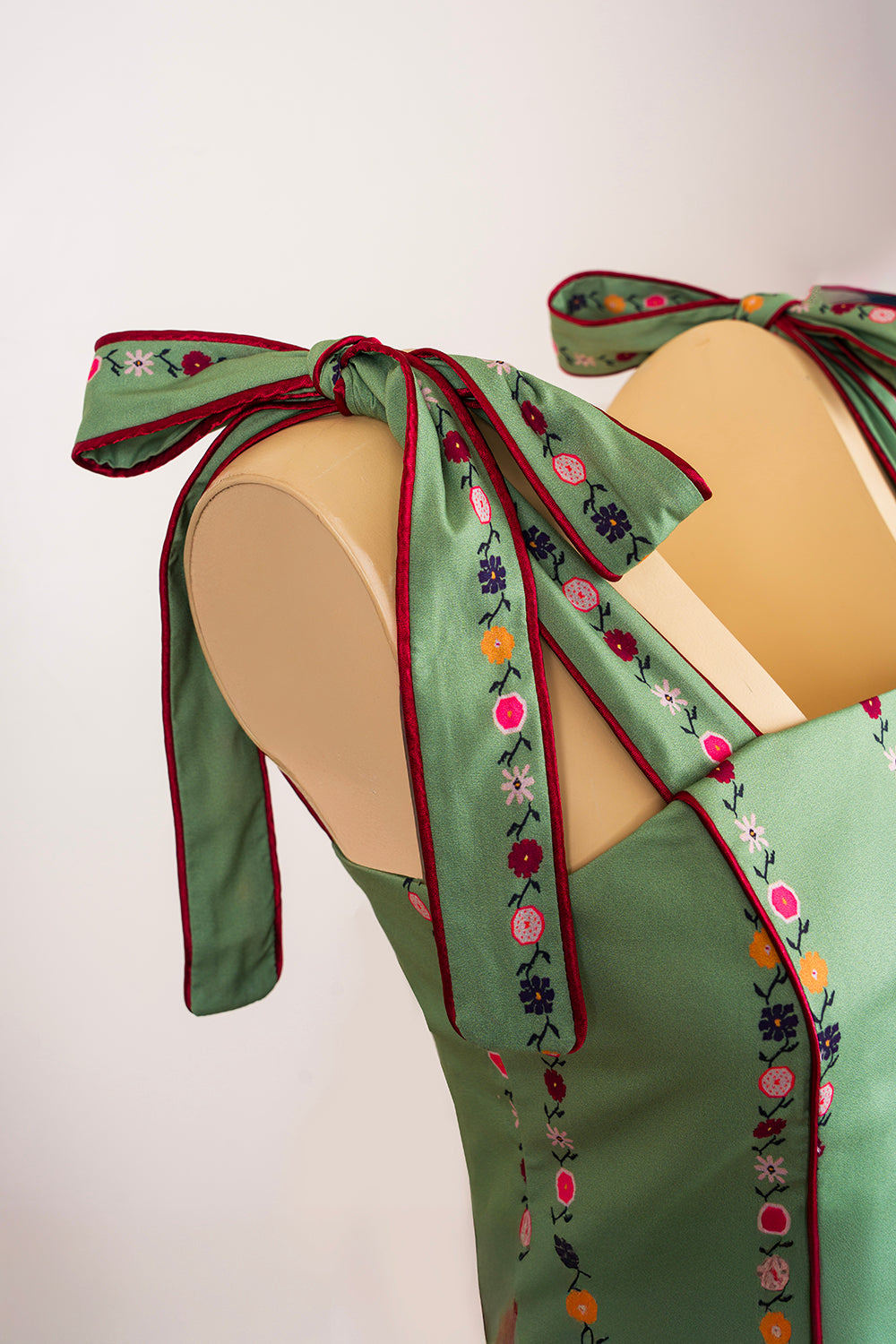 Doğal tonlardaki yeşil zemin üzerine işlenen rengarenk etnik çiçek şerit desenleri, vintage esintiyi enerjik bir tarzla buluşturuyor. Hafif ve nefes alabilen pamuk karışımlı kumaşı sayesinde yaz günlerinde ferah bir kullanım sunar.