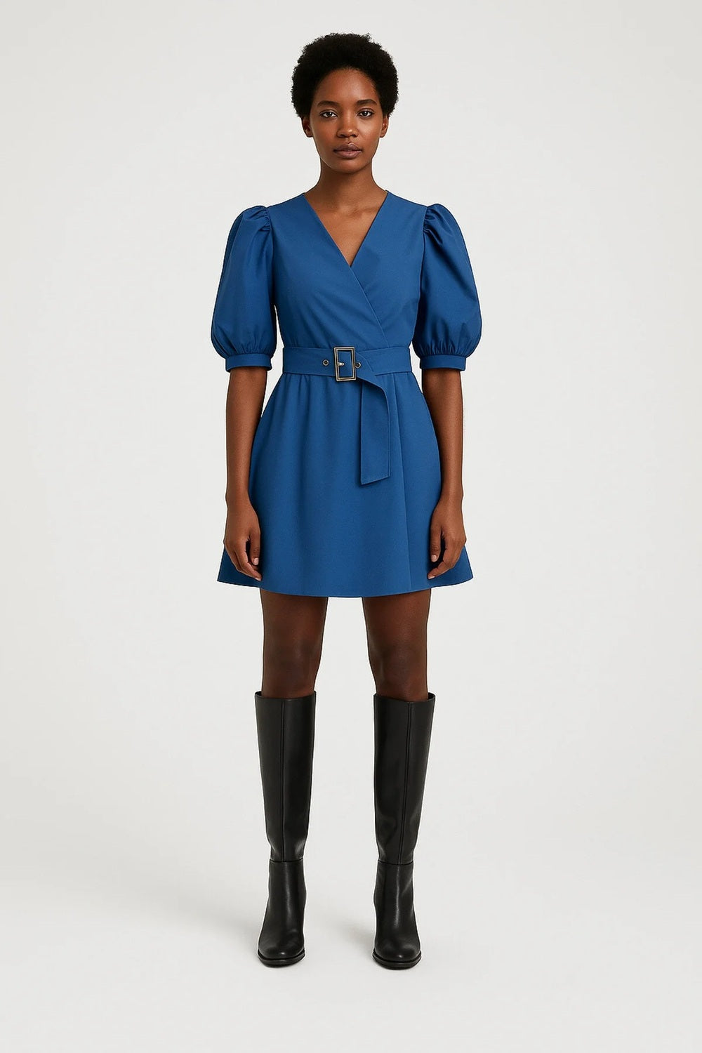 Balon Kollu İndigo Renk Kuşaklı Poplin Elbise