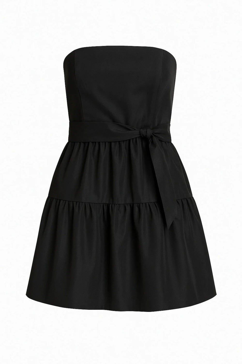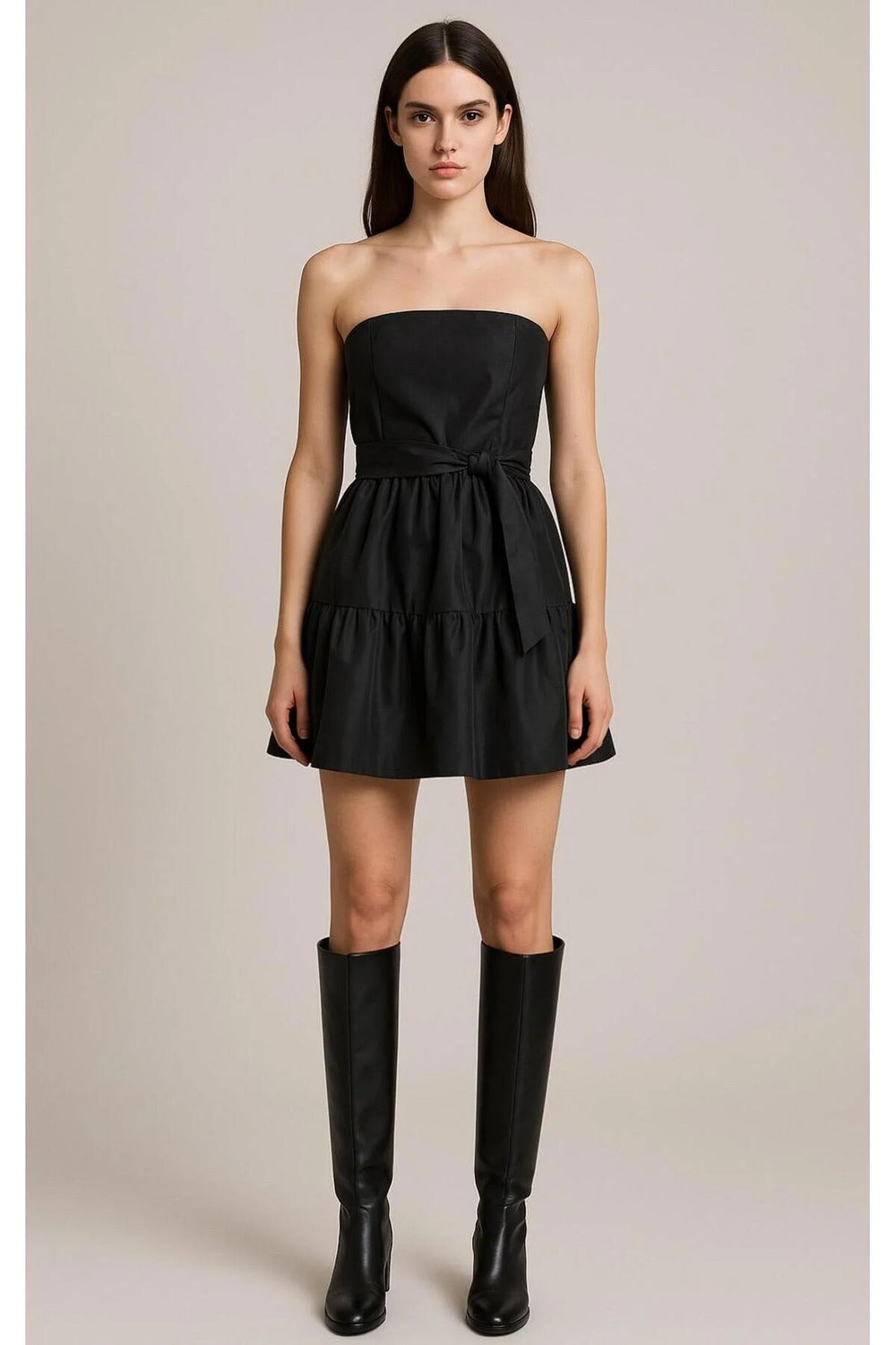 Fırfırlı & Katman Detaylı Siyah Straplez Kısa Elbise