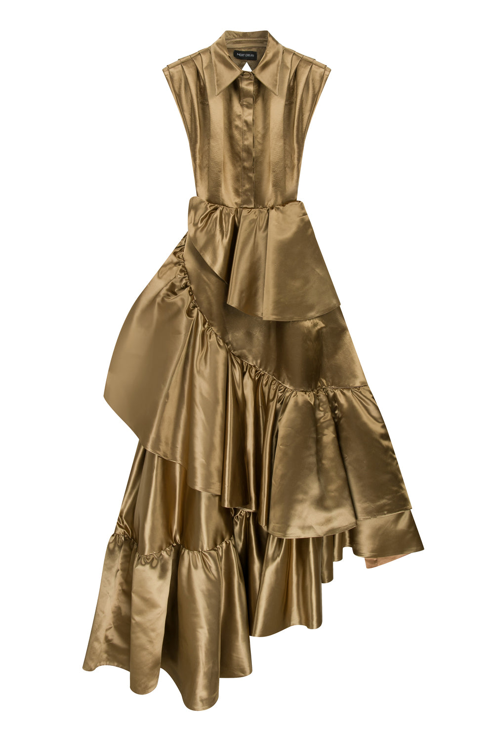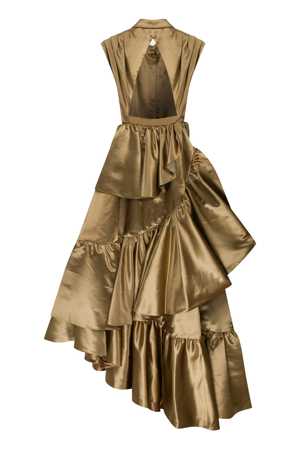 Katman & Cut-Out Detaylı Haki Amerikan Saten Şık Davet Elbisesi