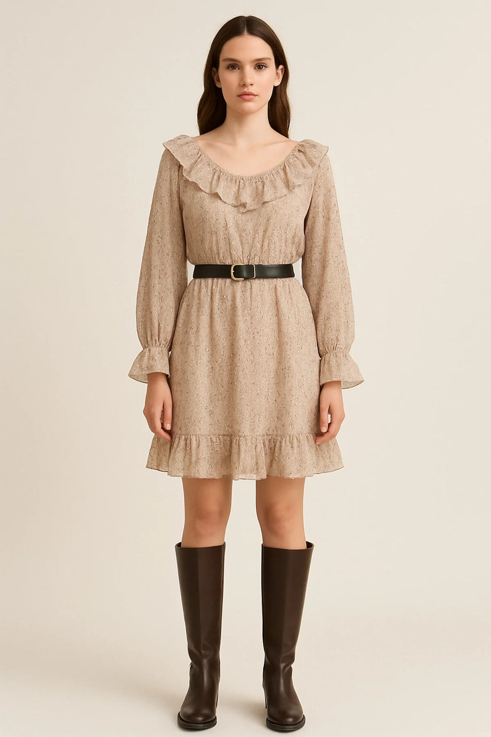 Pıtırcık Çiçek Desenli Camel Şifon Astarlı Elbise
