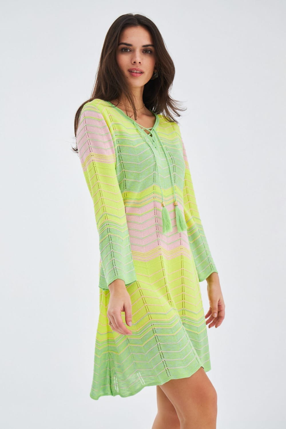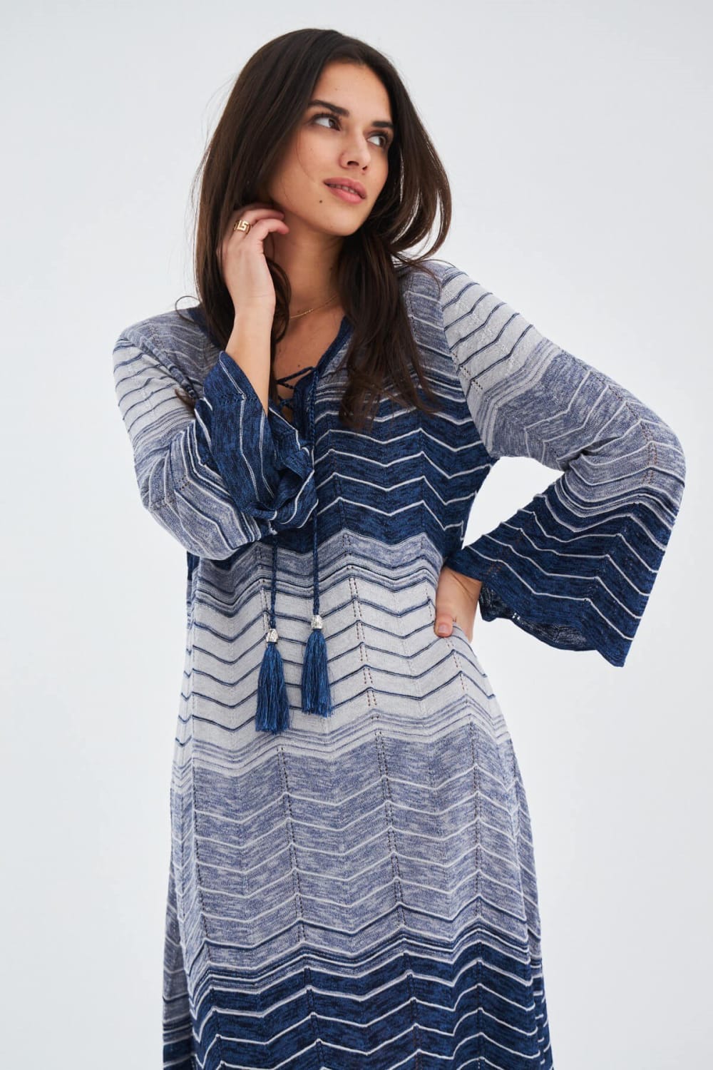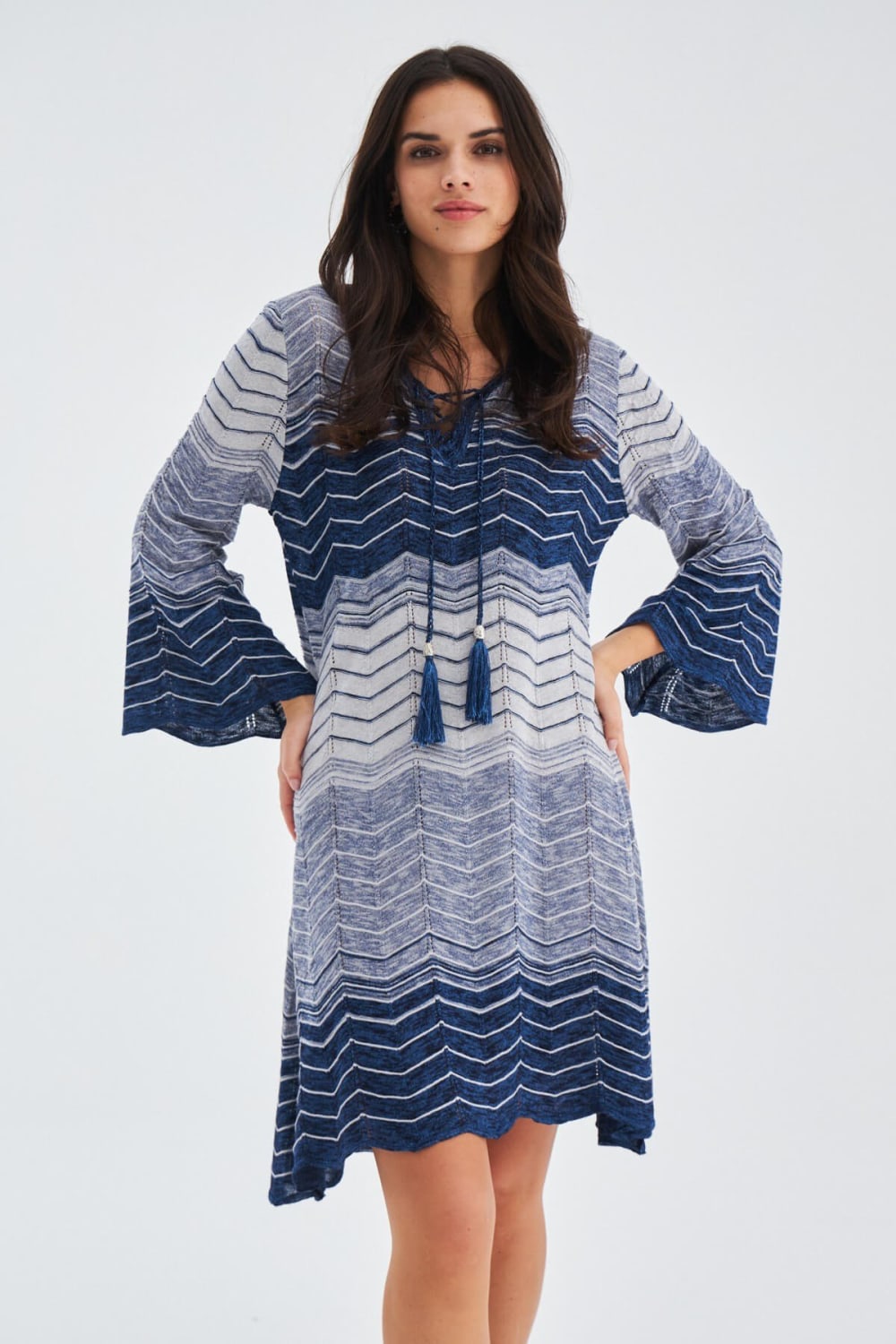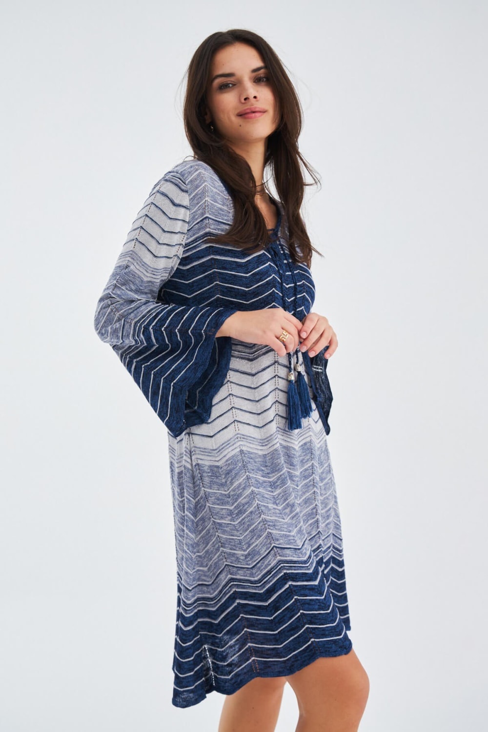 53% Viskon / 47% PolyesterModel Ölçüleri: Boy: 174 cm, Göğüs: 86 cm, Bel: 63 cm, Basen: 93 cmModel üzerindeki ürün S/M bedendirTablo CM cinsindendir.Zigzag Desenli, V  Yakalı, Çan Kollu, Diz Üstü, Viskonlu, Yazlık Triko ElbiseRahat Kesim