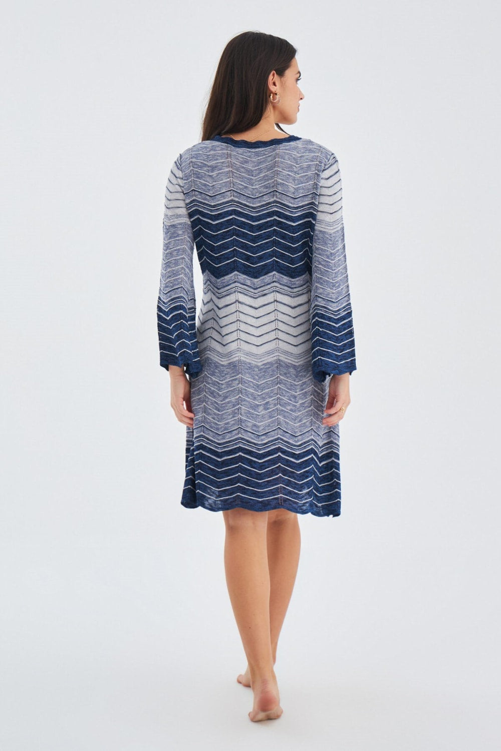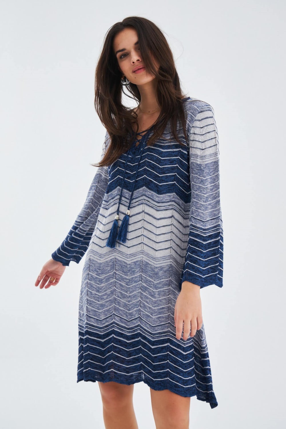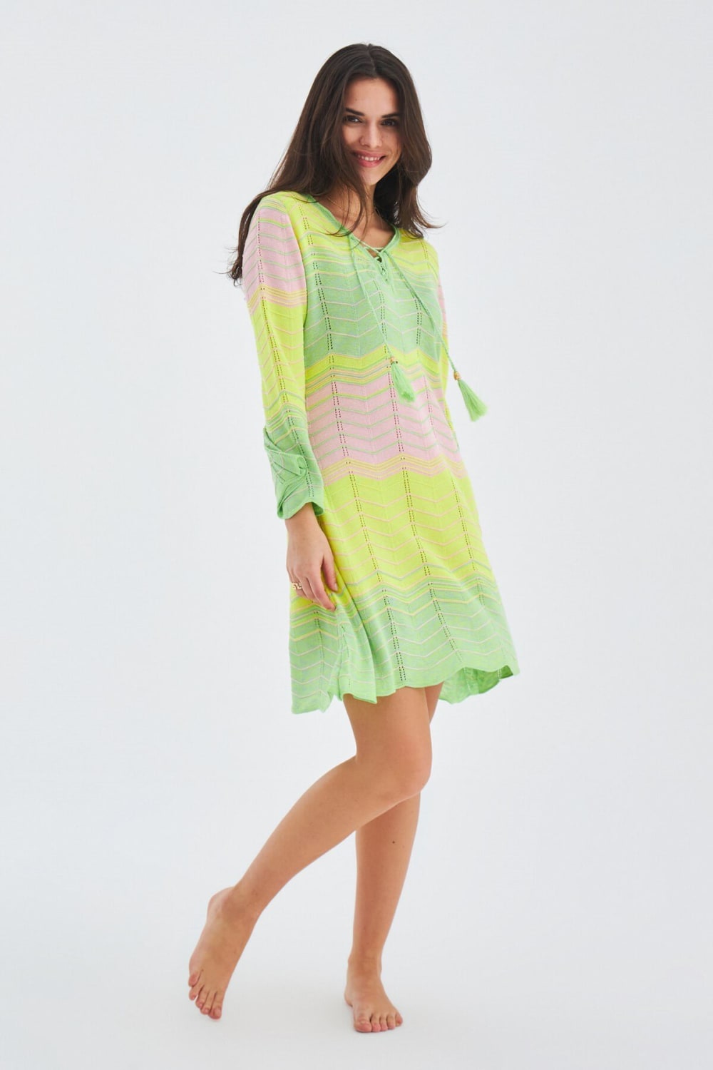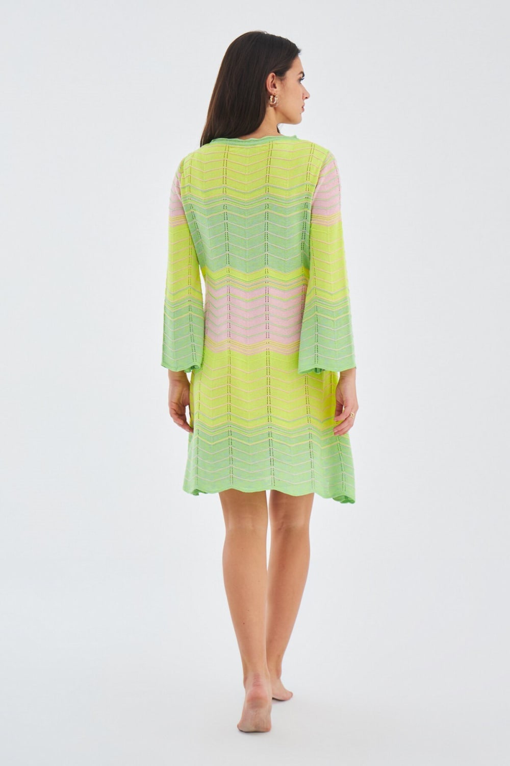 53% Viskon / 47% PolyesterModel Ölçüleri: Boy: 174 cm, Göğüs: 86 cm, Bel: 63 cm, Basen: 93 cmModel üzerindeki ürün S/M bedendirTablo CM cinsindendir.Zigzag Desenli, V  Yakalı, Çan Kollu, Diz Üstü, Viskonlu, Yazlık Triko ElbiseRahat Kesim