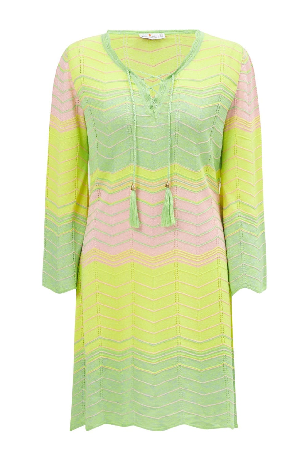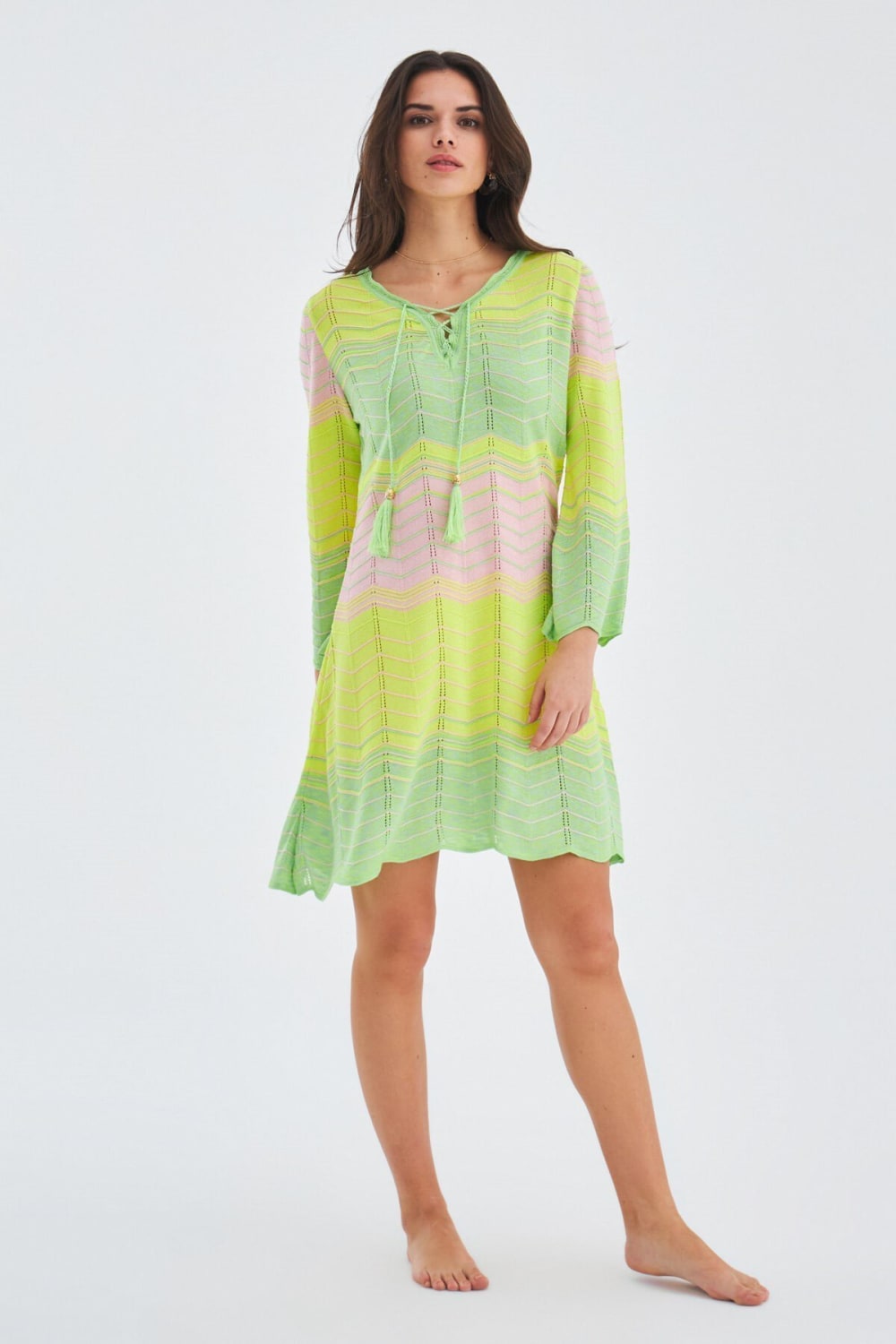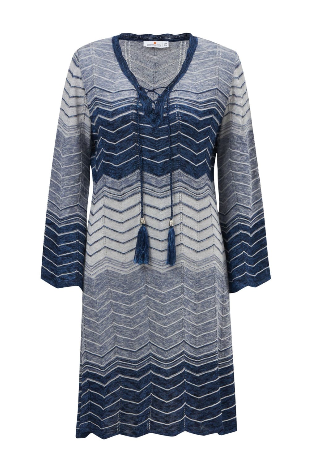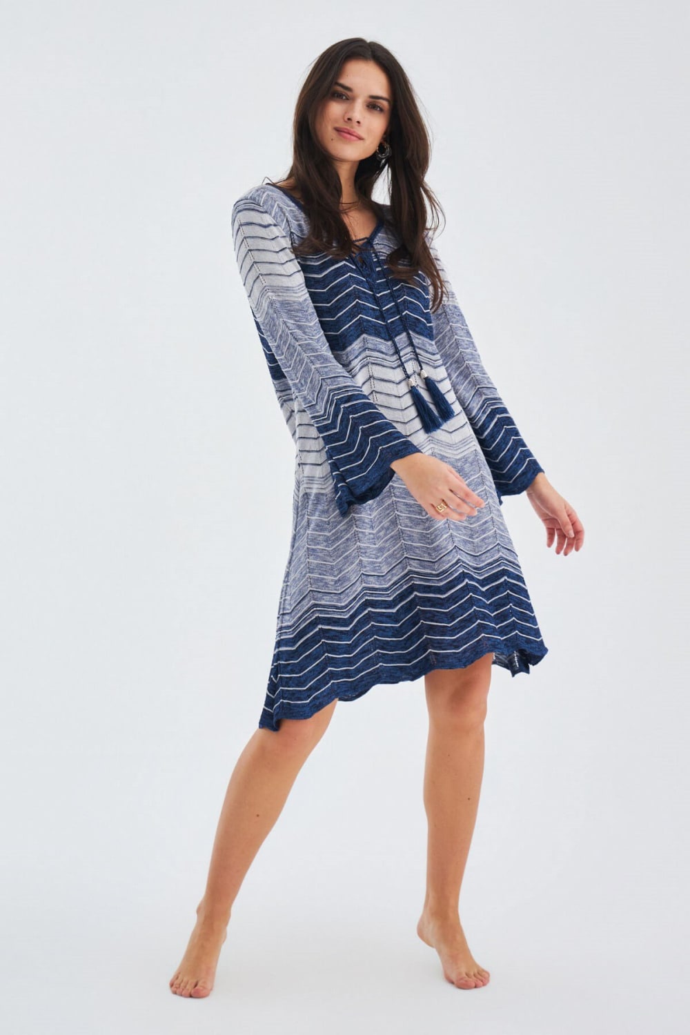 53% Viskon / 47% PolyesterModel Ölçüleri: Boy: 174 cm, Göğüs: 86 cm, Bel: 63 cm, Basen: 93 cmModel üzerindeki ürün S/M bedendirTablo CM cinsindendir.Zigzag Desenli, V  Yakalı, Çan Kollu, Diz Üstü, Viskonlu, Yazlık Triko ElbiseRahat Kesim