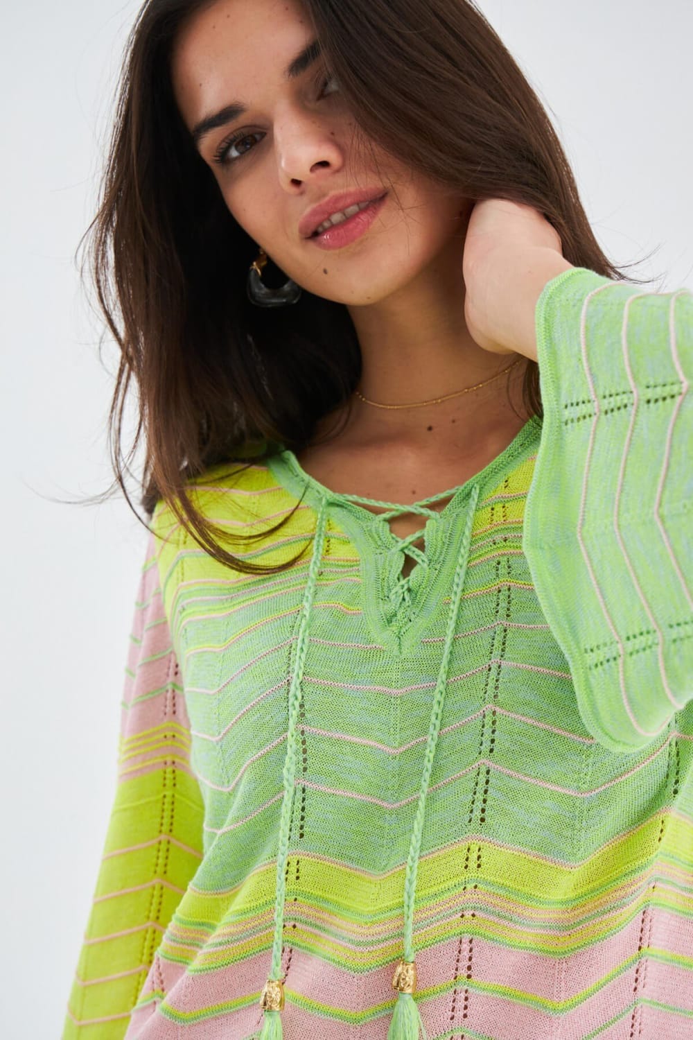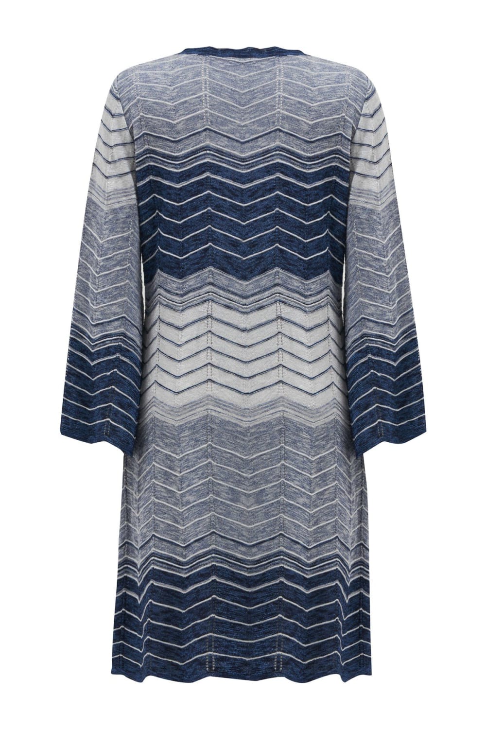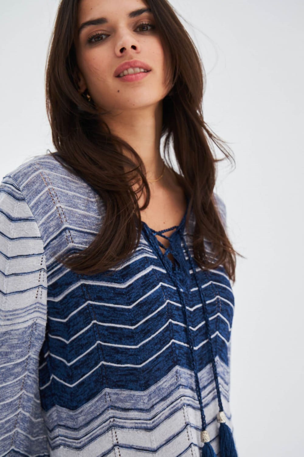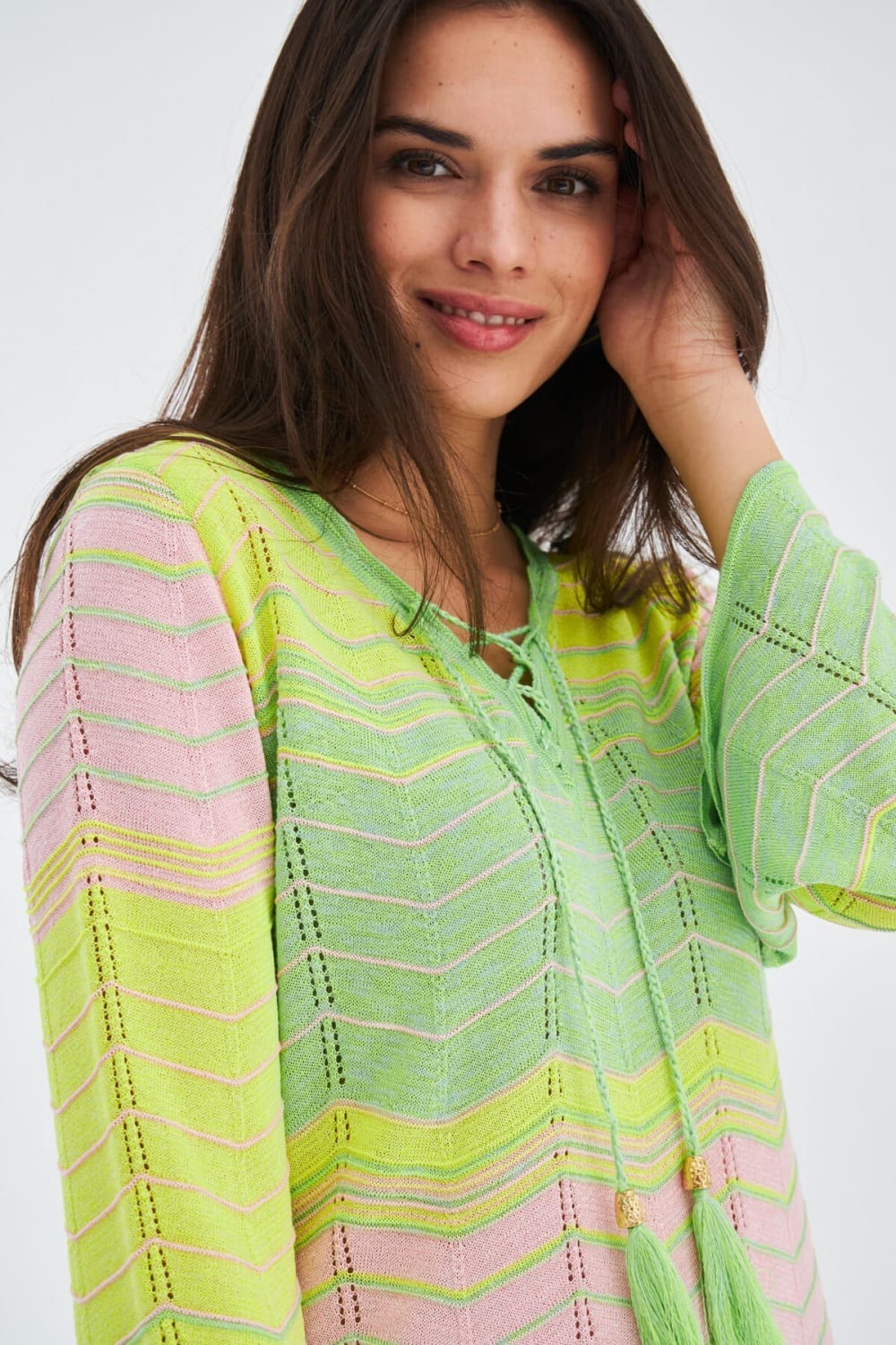 53% Viskon / 47% PolyesterModel Ölçüleri: Boy: 174 cm, Göğüs: 86 cm, Bel: 63 cm, Basen: 93 cmModel üzerindeki ürün S/M bedendirTablo CM cinsindendir.Zigzag Desenli, V  Yakalı, Çan Kollu, Diz Üstü, Viskonlu, Yazlık Triko ElbiseRahat Kesim