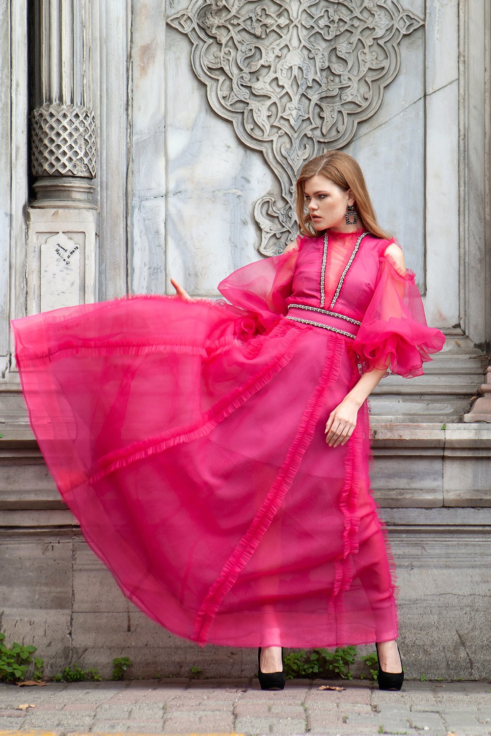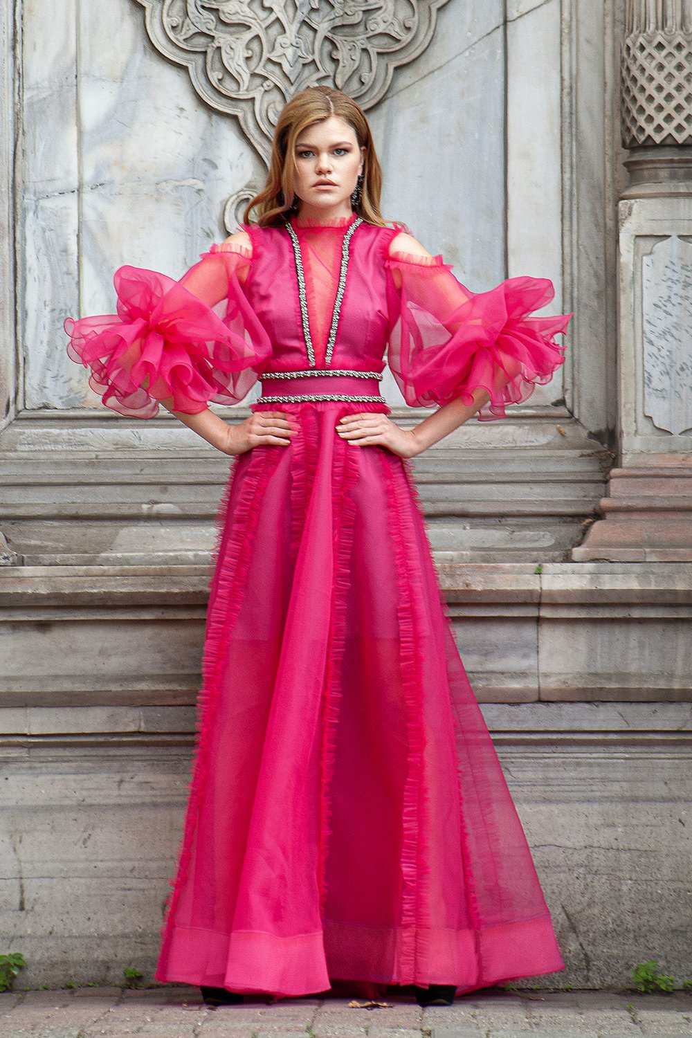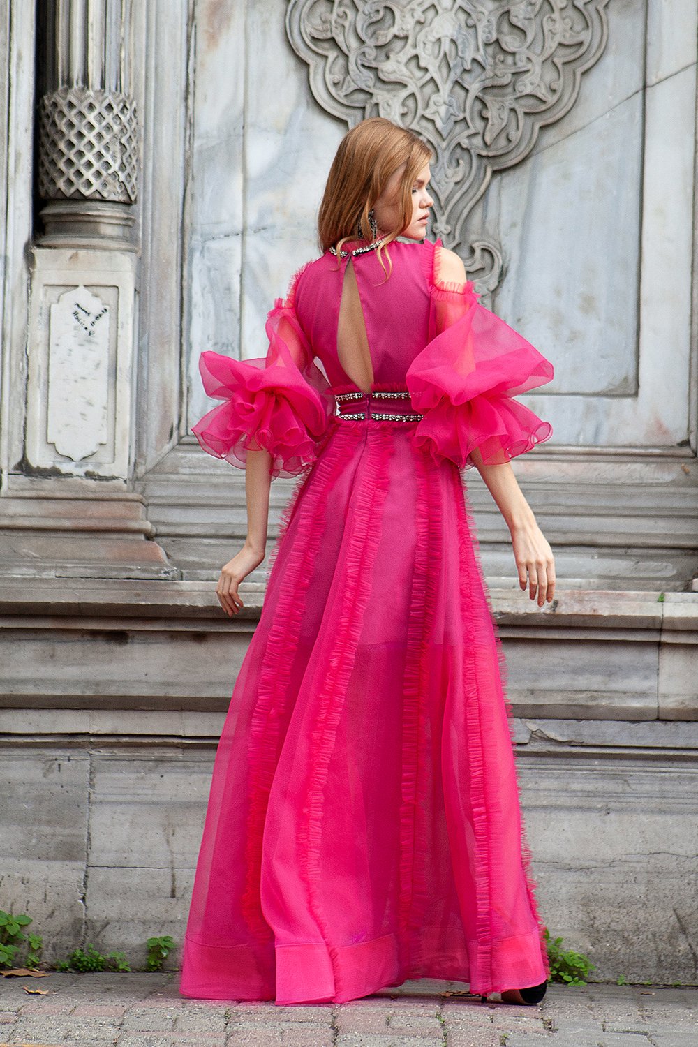 Ön ve arka kısmındaki boncuk işlemeleriyle zarif detaylara sahip bu pembe uzun gece elbisesi, mat transparan görünümlü dalya organze kumaştan üretilmiştir. Kabarık formu ve dar kesimiyle silueti vurgularken, fit kalıbı likrasız yapısıyla vücuda oturur. Kollu tasarımı ve derin dekoltesiyle dikkat çekerken, arkadaki damla kesim detayı ve gizli fermuarı ile şık bir tamamlayıcılık sunar. Özel davetlerde şık ve dengeli bir görünüm arayanlar için ideal bir tercihtir.