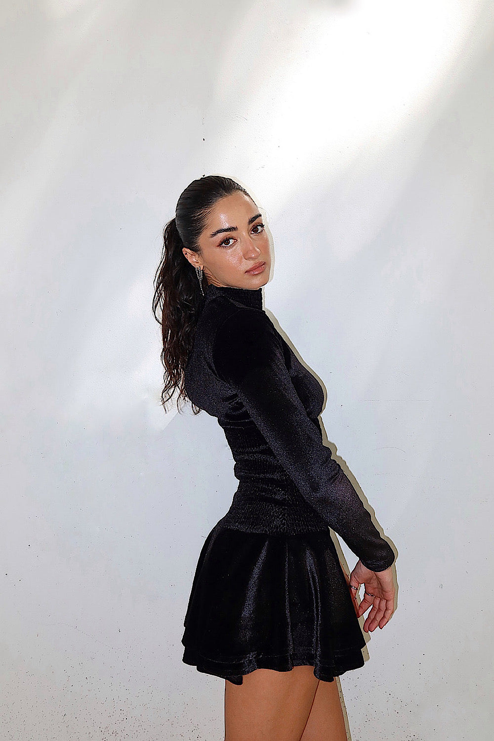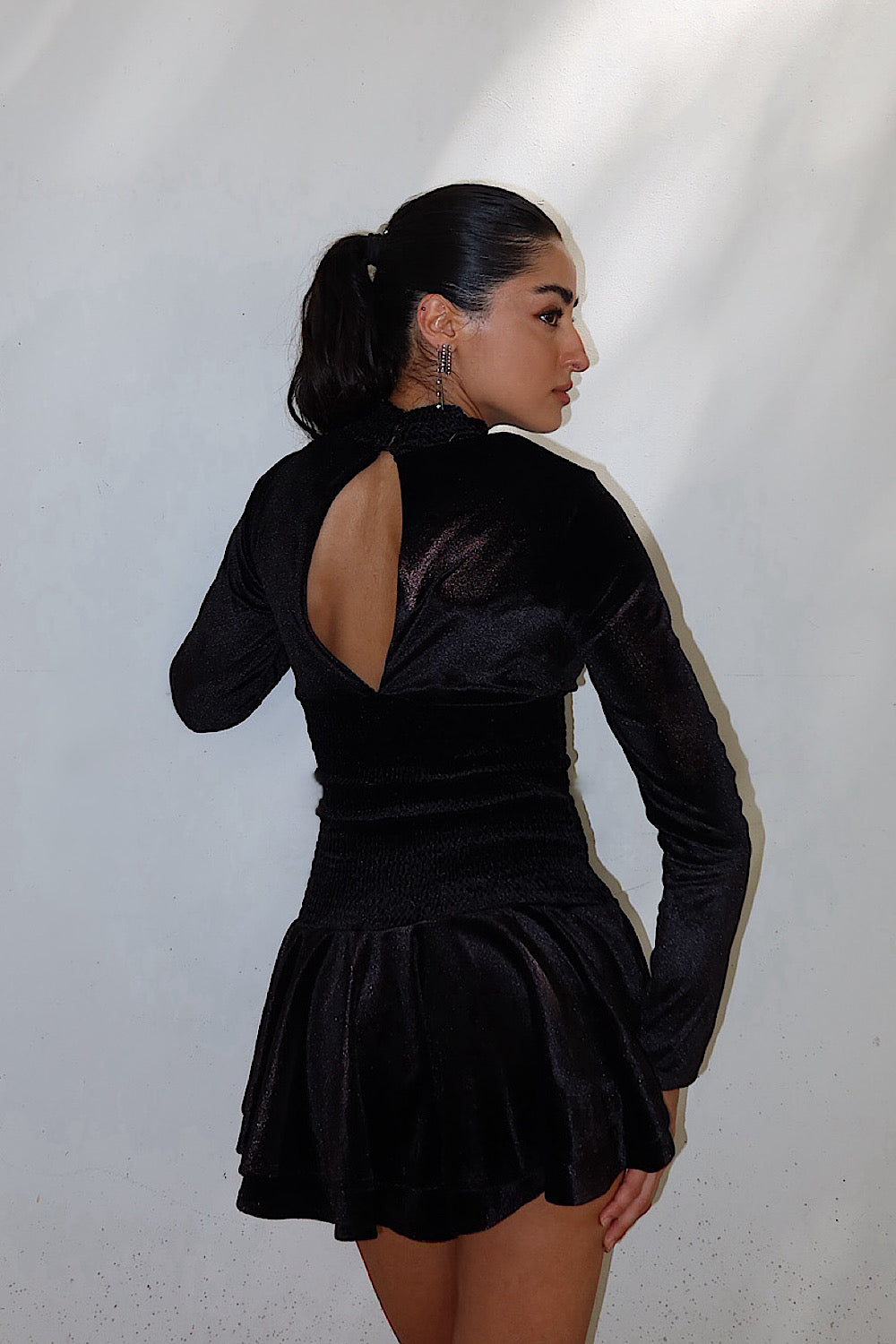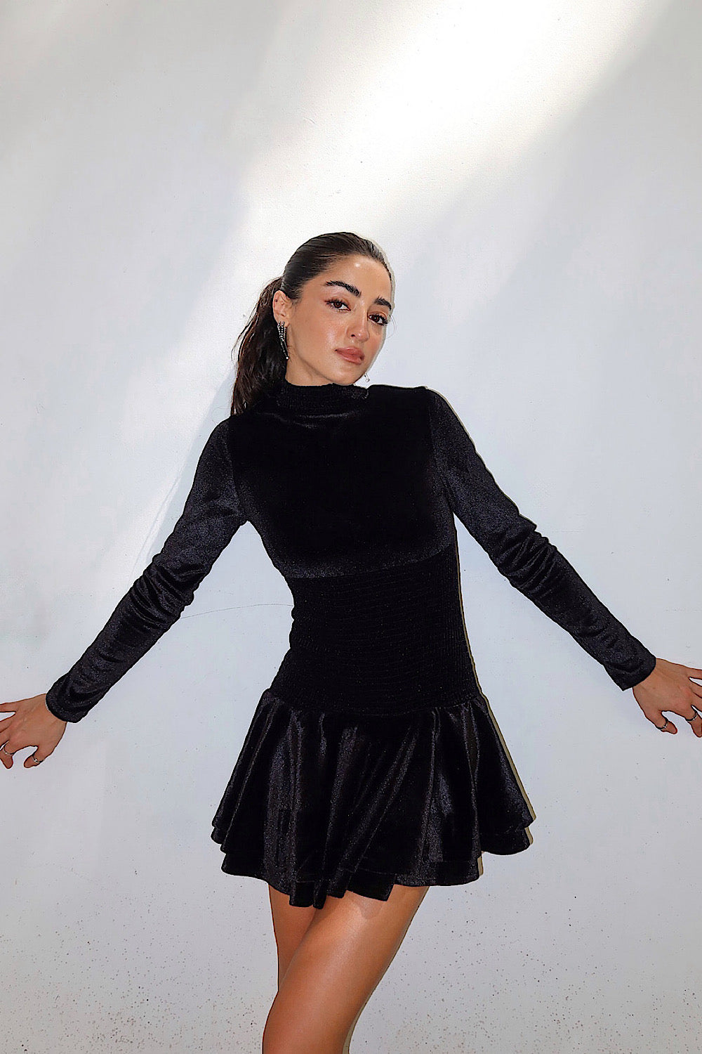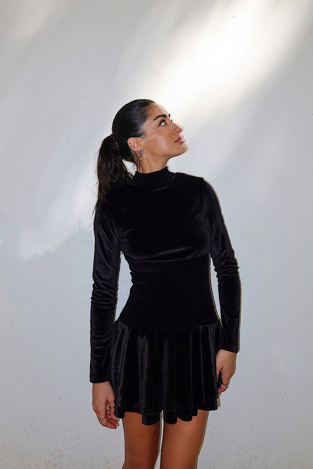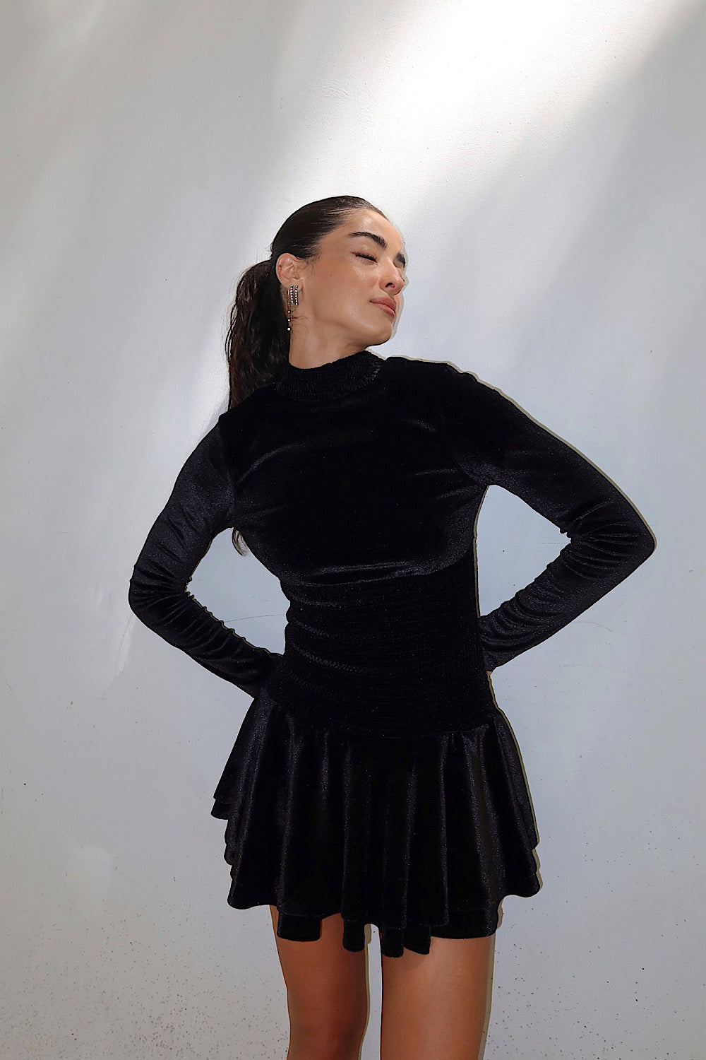 Kadın Siyah Kadife Belden Lastikli Mini Uzun Kollu Elbise
