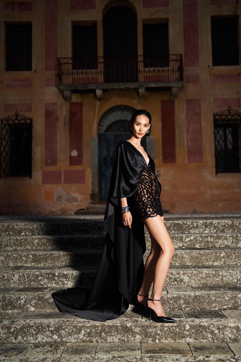 Üst bölümde, derin V yaka kesimiyle öne çıkan parlak siyah ipek kumaş, beden boyunca akarak uzun ve akışkan bir kuyruk formuna dönüşür.