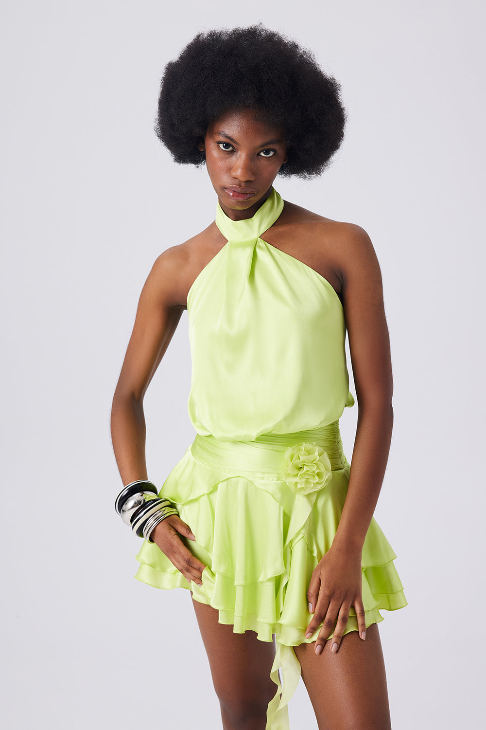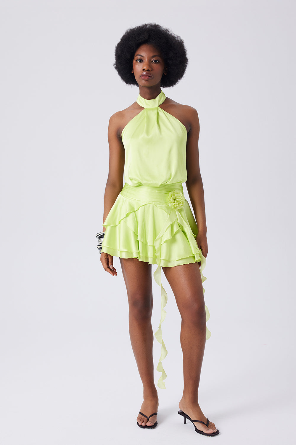 Kat kat tasarlanmış, akıcı etek kısmı; büzgülü bel kemeriyle buluşarak zarifçe tanımlanmış bir siluet oluşturur. A-kesim, yüksek yakalı üst kısmı modern bir zarafet katarken; ayarlanabilir bağcıklarla tamamlanan açık sırt detayı, zahmetsiz bir çekicilik sunar. Konforundan ödün vermeden stil sahibi olmayı önemseyen kadınlar için tasarlandı.