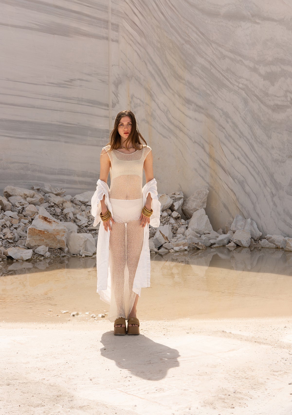 Kolsuz ve uzun formda tasarlanmıştır. Doğal dokulu kumaşı hafif ve serin tutan yapıdadır. Seri üretim değildir; her ürün tekil olarak elde üretilmiştir.