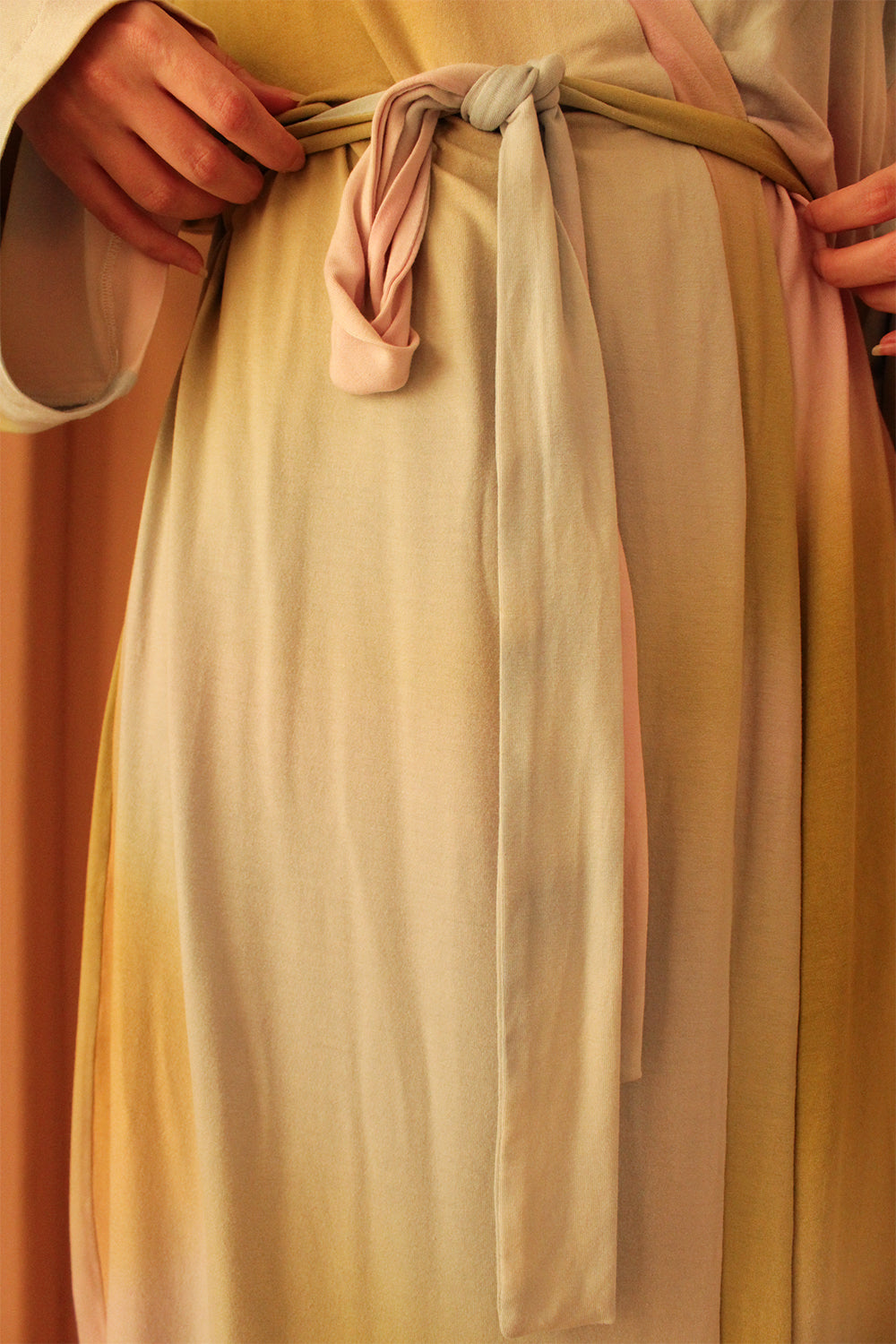 AURI deseni, Daydreamer Koleksiyonu’nun içsel akış fikrinden ilham ala yeşil, açık mavi ve yumuşak pembe tonlarının kumaş yüzeyinde organik biçimde birbirine karışmasıyla oluşur. Renklerin yönsüz hareketi, hayal hâlinin hafif bulanık ama rahatlatıcı hissini taşır.Aftersun’ın özel olarak geliştirdiği el boyama tekniğiyle tek tek uygulanır. Her parça, renklerin kumaş üzerinde doğal akışına izin verilerek ayrı ayrı çalışıldığı için birbirinden farklı karakterlerde ortaya çıkar.