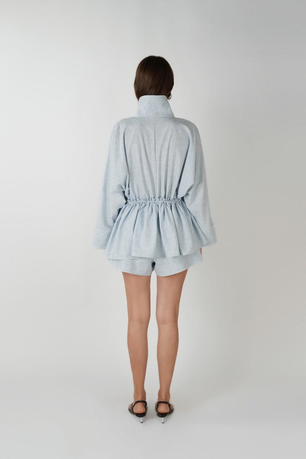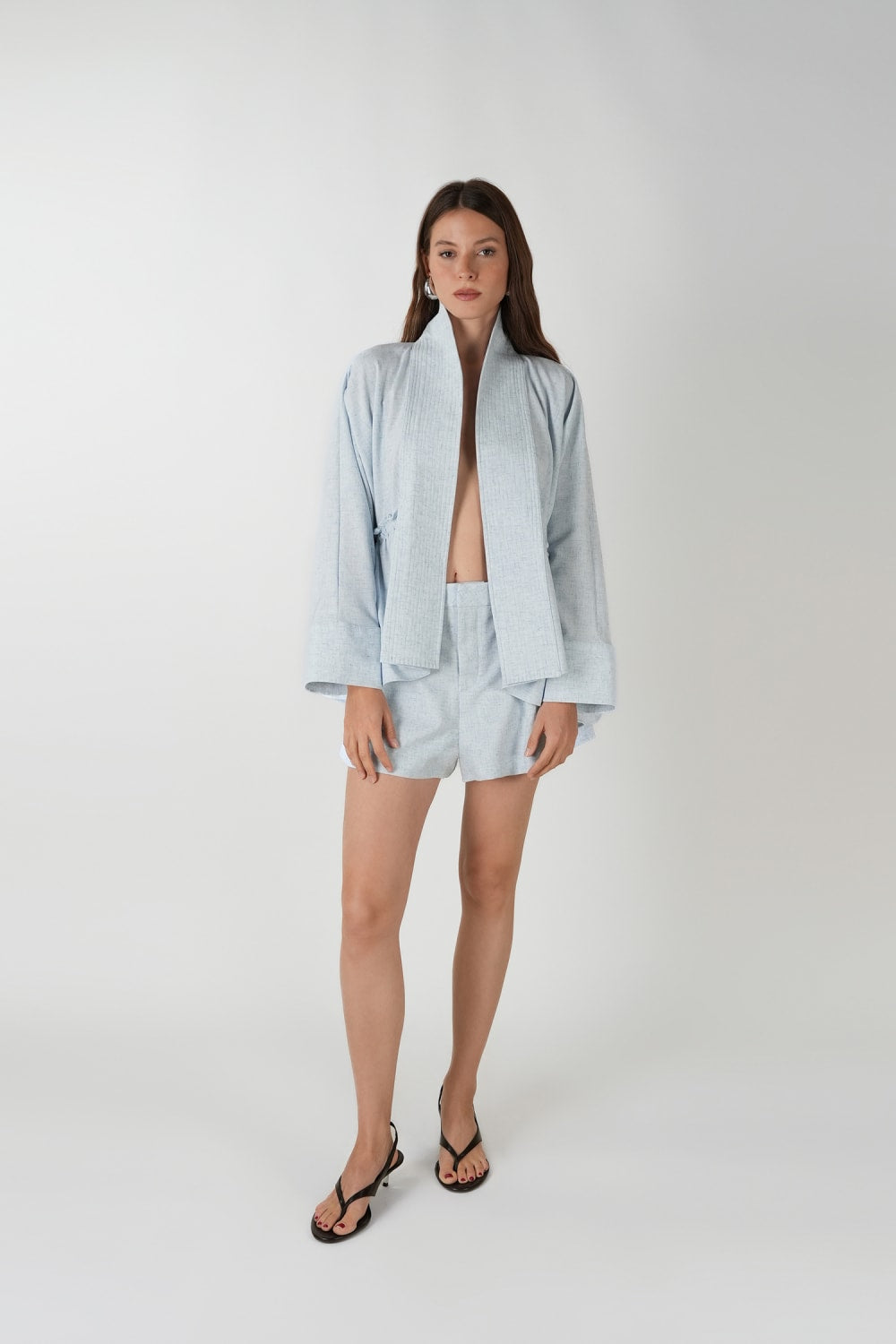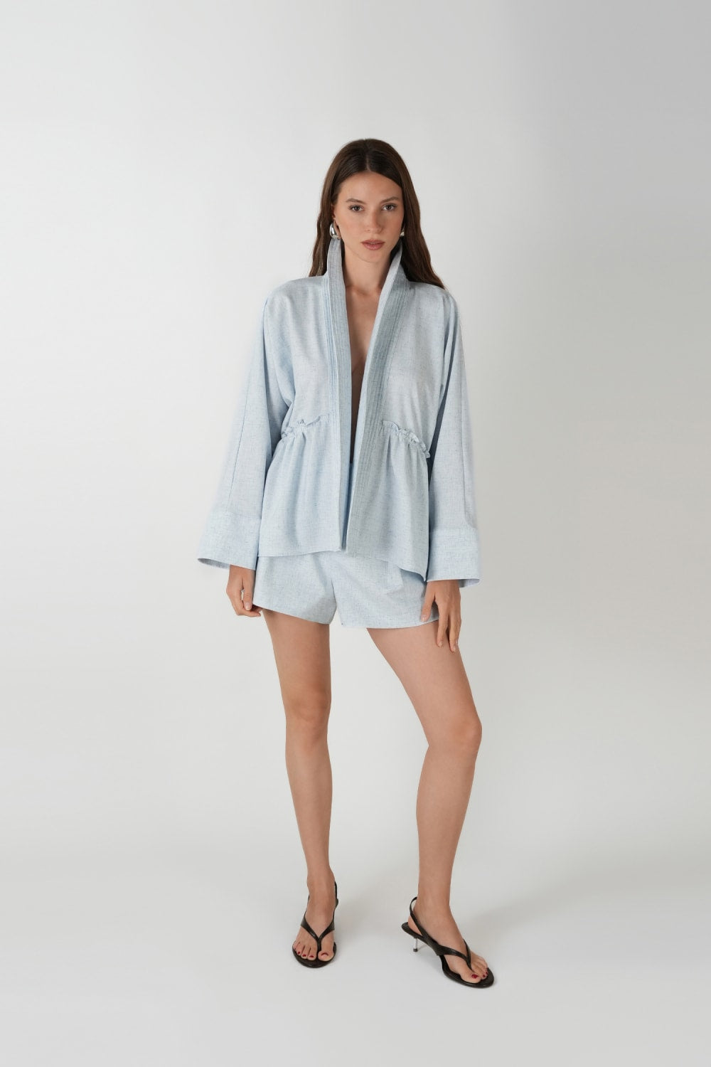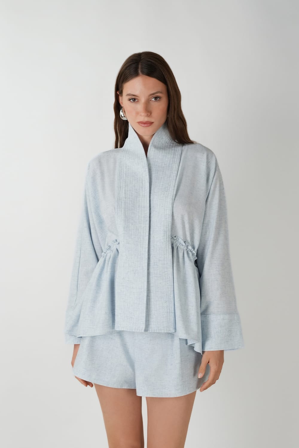 Doğal dokulu kumaşı ve oversize kesimiyle bu mavi kimono, hem konforu hem de zarafeti bir araya getirir. İki yandaki kadife bağcıklar sayesinde bel kısmı, kendi beden ölçünüze göre dilediğiniz gibi daraltılıp bollaştırılabilir. Açık ya da kapalı şekilde kullanılabilir; rahat ve aynı zamanda stil sahibi bir görünüm sunar.