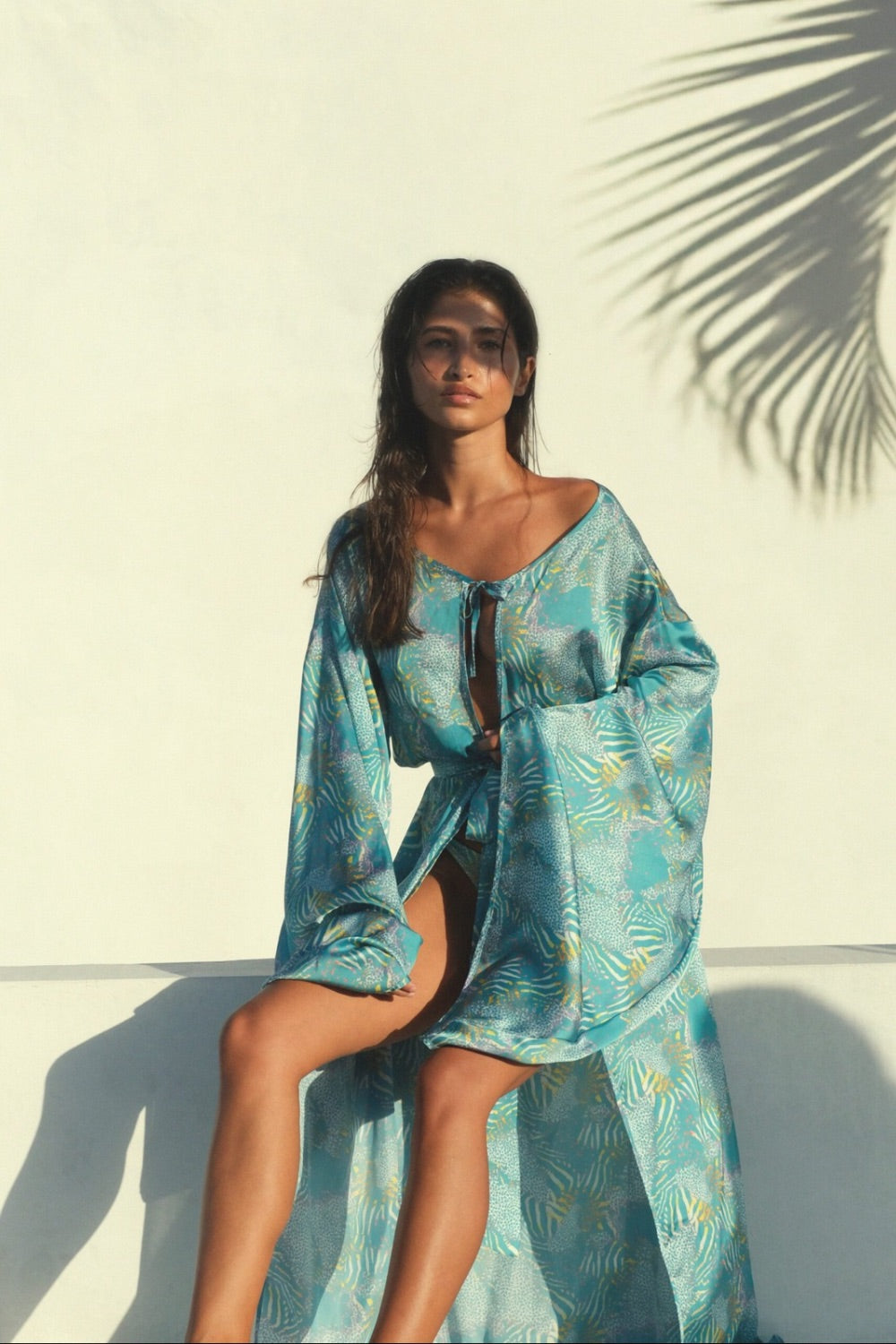 AMAE kimono, çok yönlü kullanıyla stiline esneklik kazandırır. Boyundan ayarlanabilen kayık yakası sayesinde ön açıklığı isteğe göre şekillendirilebilir. Bel kısmındaki bağlama detayı, vücut hatlarına göre uyum sağlarken yarasa kol kesimi ve yırtmaçlı yan detaylar hareket özgürlüğü sunar. Akıcı kumaşı ile zarif ve Feminen bir duruş yakalayan bu model, bağlama şekline göre farklı görünümler yaratmaya olanak tanır.