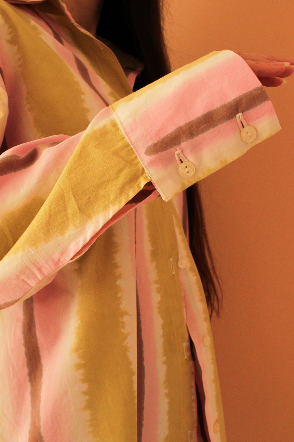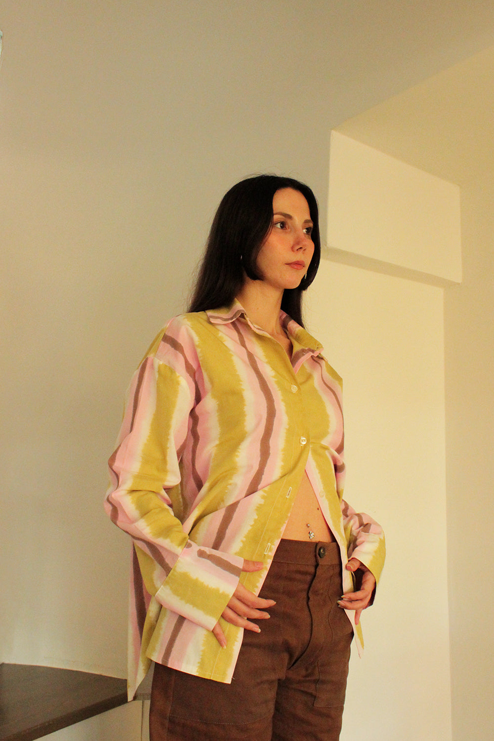Lina Oversized Gömlek'te kullanılan çizgisel yüzey, elle çizilmiş diyagonal hatların kumaşa hafif bir yayılma efekti vermesiyle ortaya çıkar. Bu çizgiler, Daydreamer’ın dalgalanan ritmine uyumlu, sakin ama hareketli bir doku oluşturur.