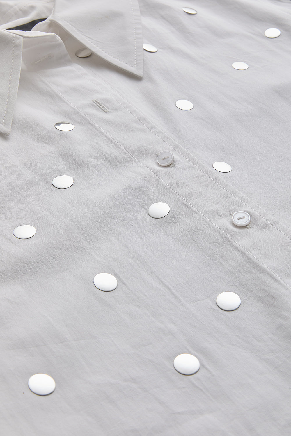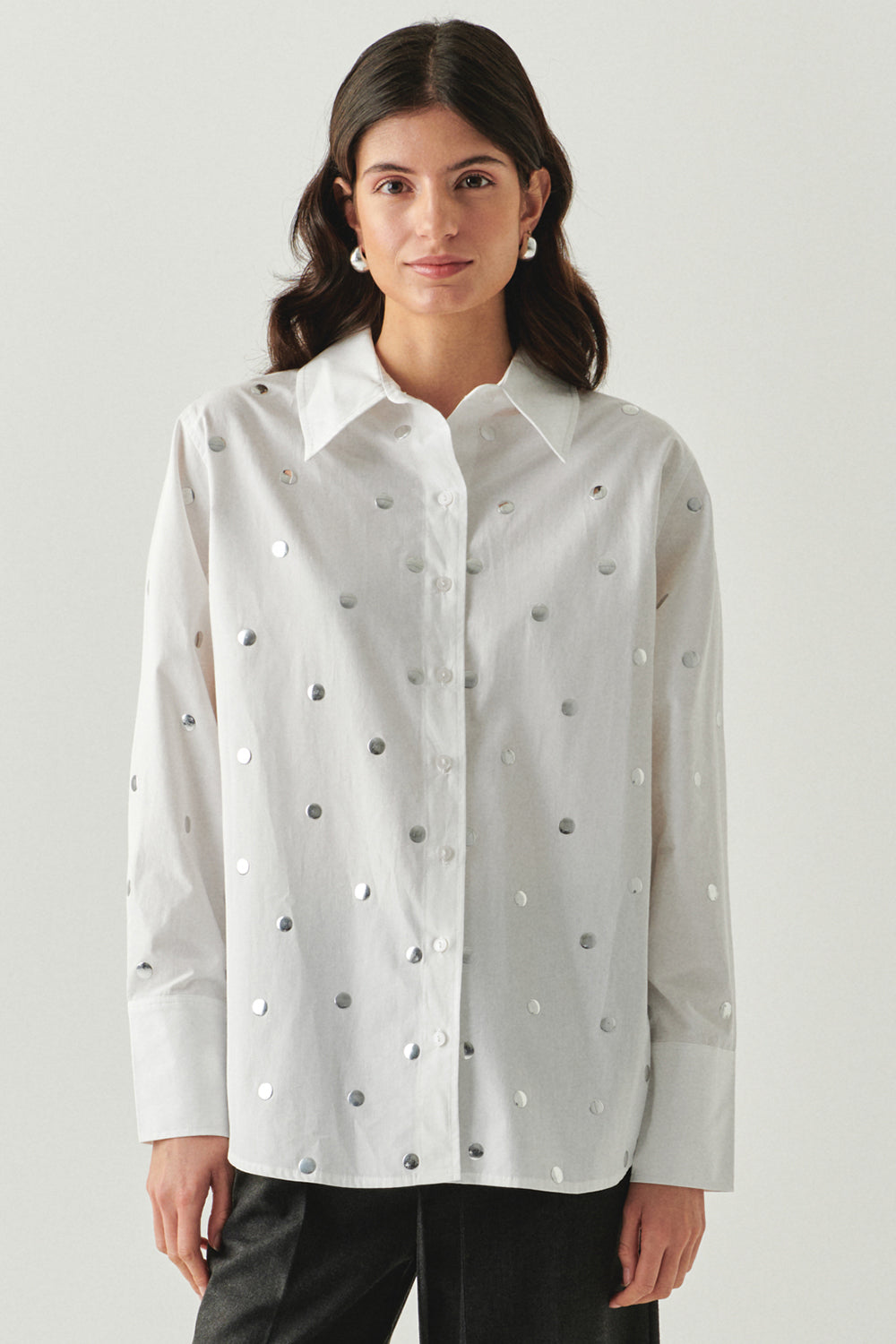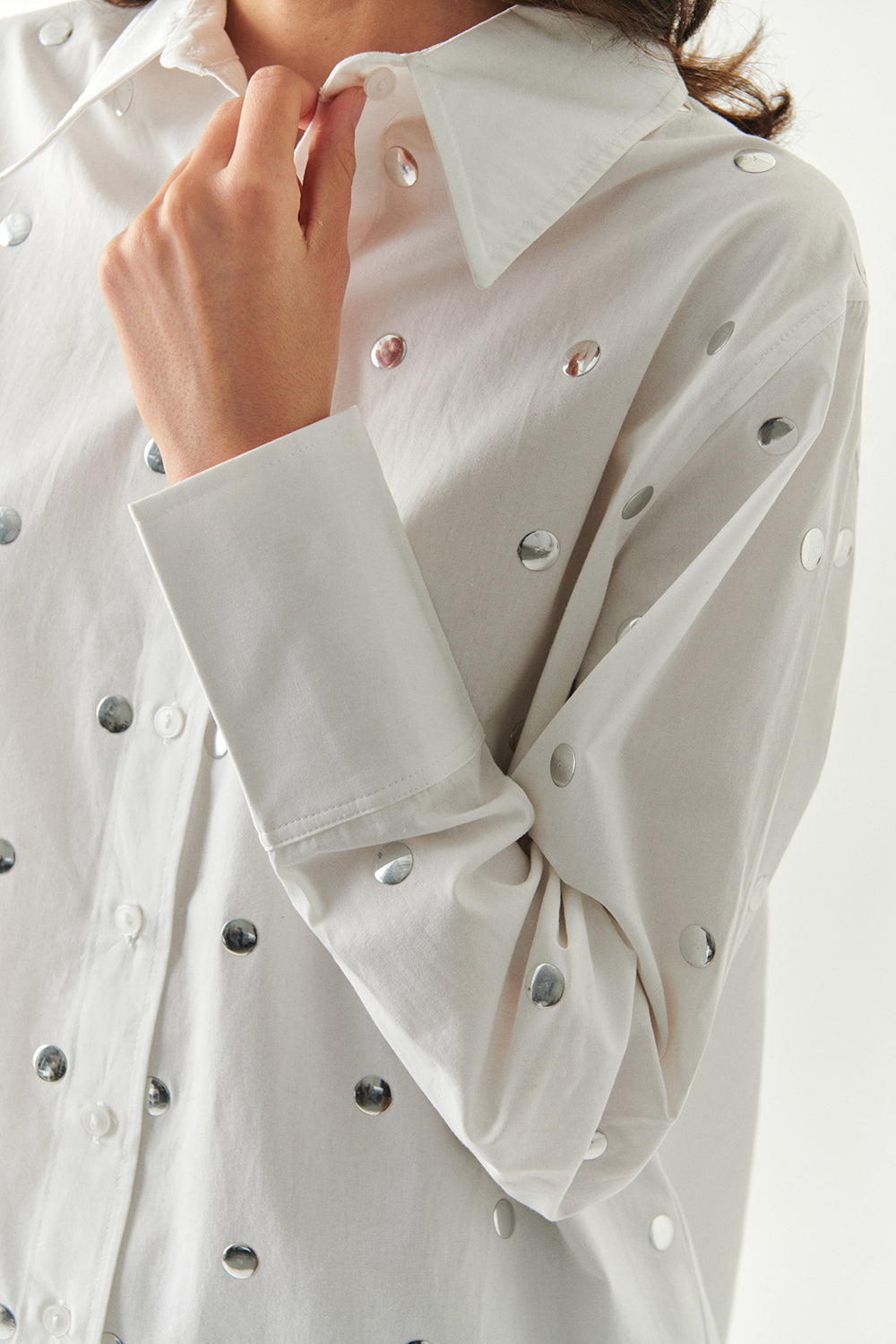 Modern ve ışıltılı bir stil sunan bu oversize gömlek, tüm yüzeye serpiştirilmiş metal taş işlemeleriyle dikkat çeker. Rahat kesimi ve uzun kollu tasarımı, konforla birlikte şıklığı bir araya getirir. Hem günlük stillerde hem de özel davetlerde iddialı bir görünüm için ideal bir seçimdir. Jean pantolonlardan kumaş eteklere kadar farklı parçalarla kolayca kombinlenerek gardırobunuzun göz alıcı parçalarından biri olur.