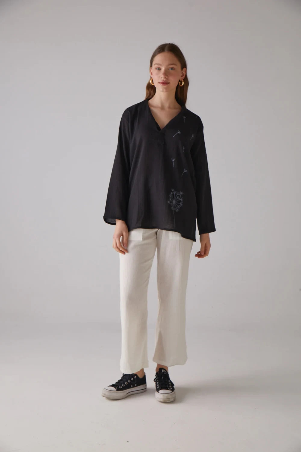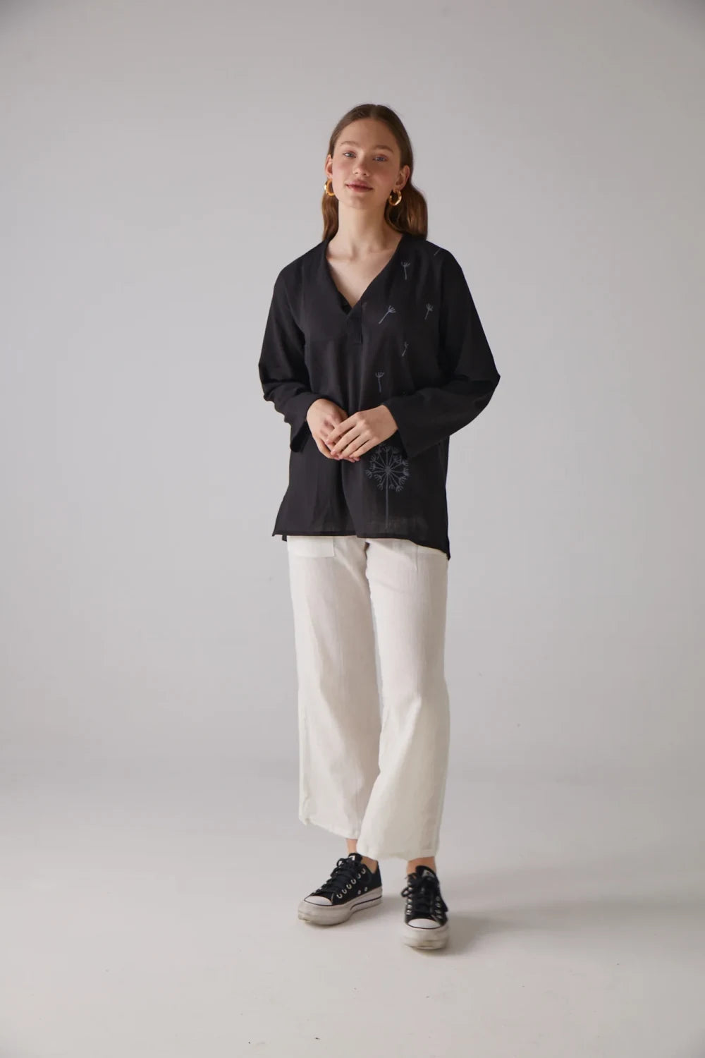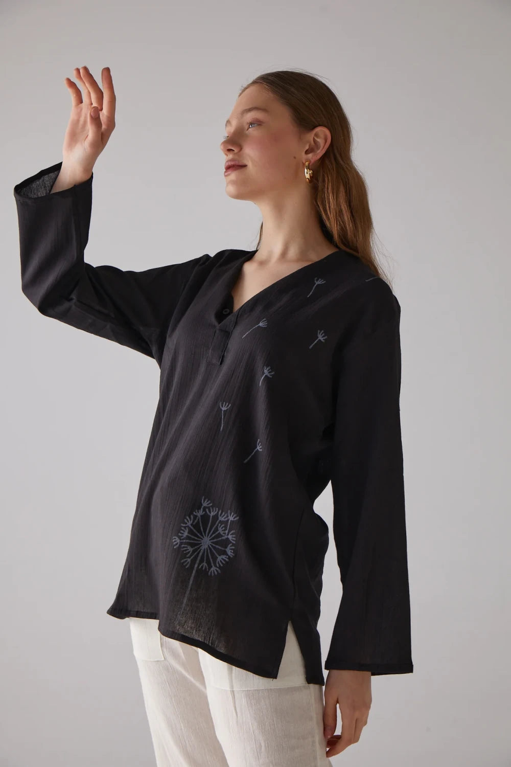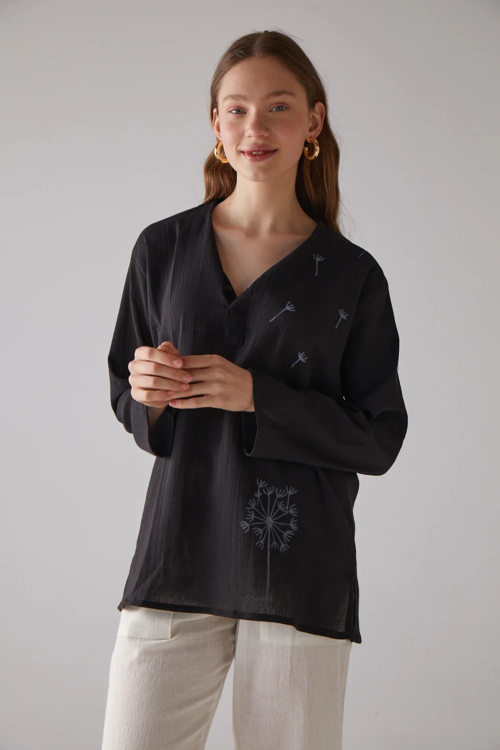 Hindiba Desenli Uzun Kollu Gömlek - Siyah