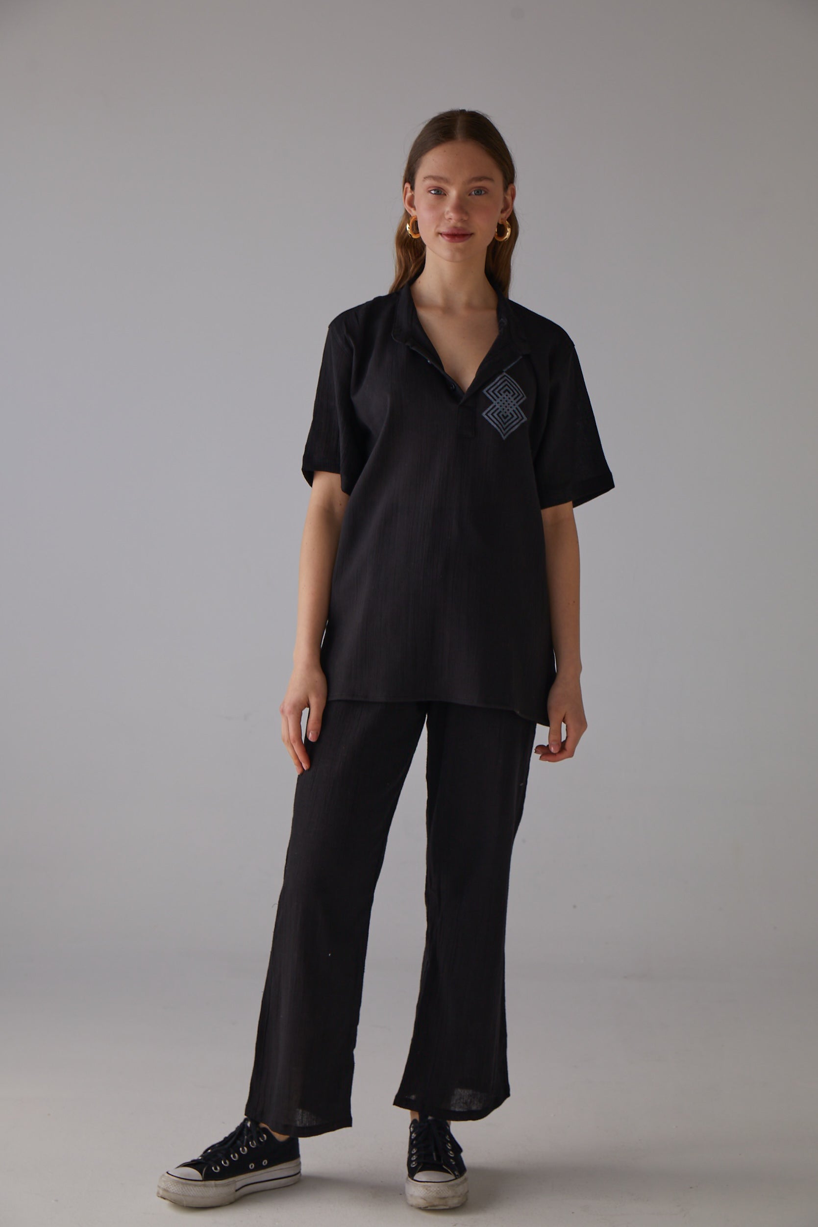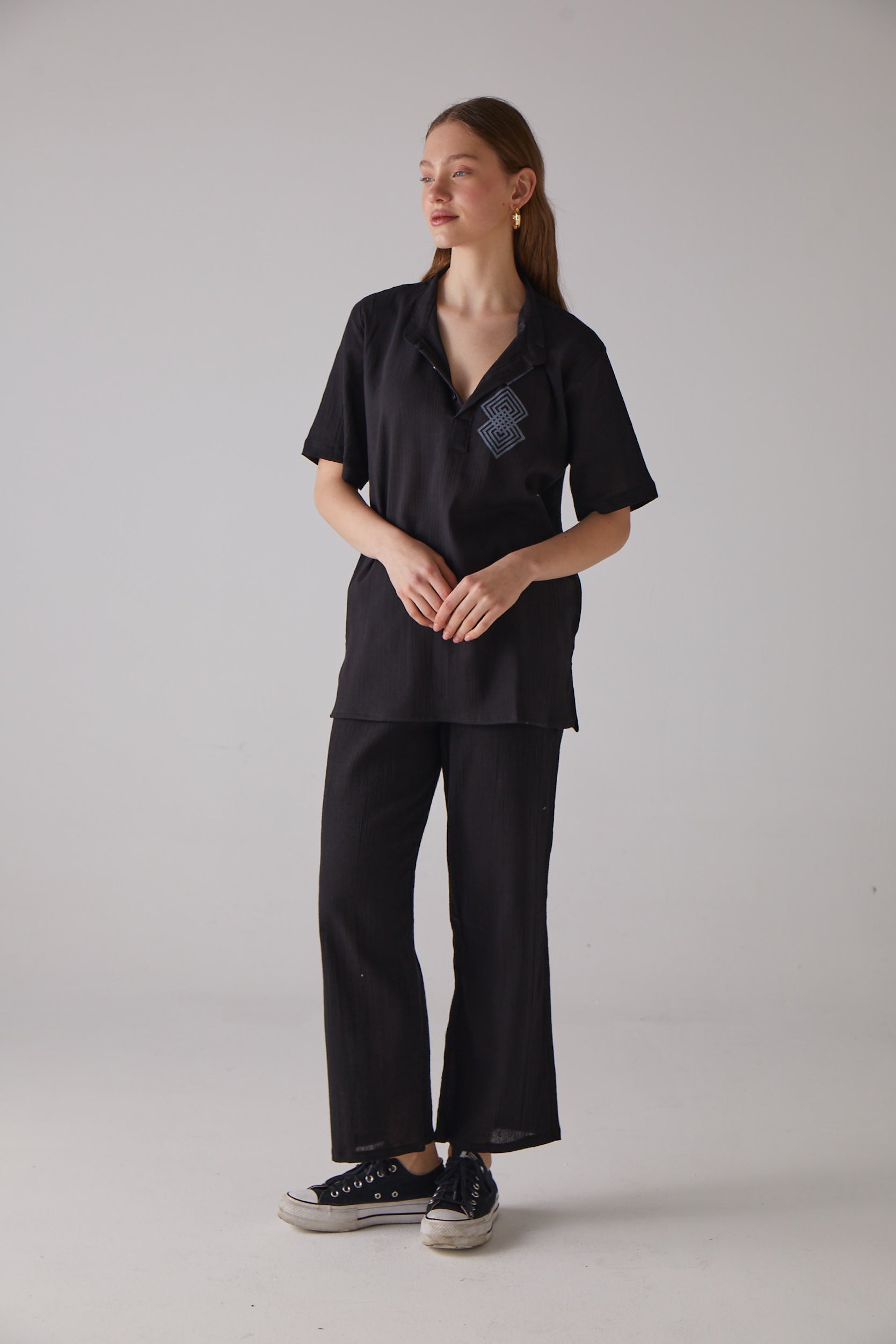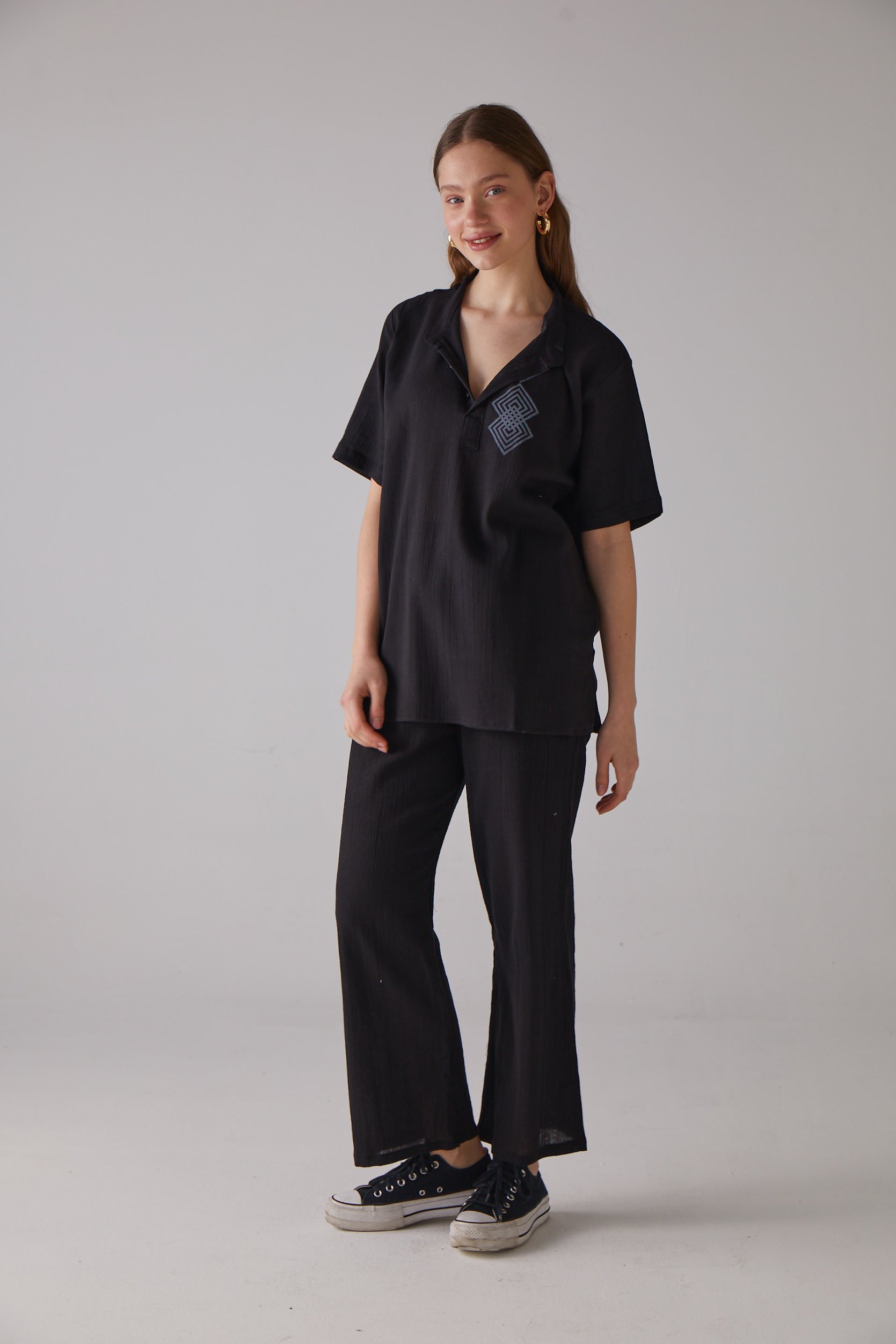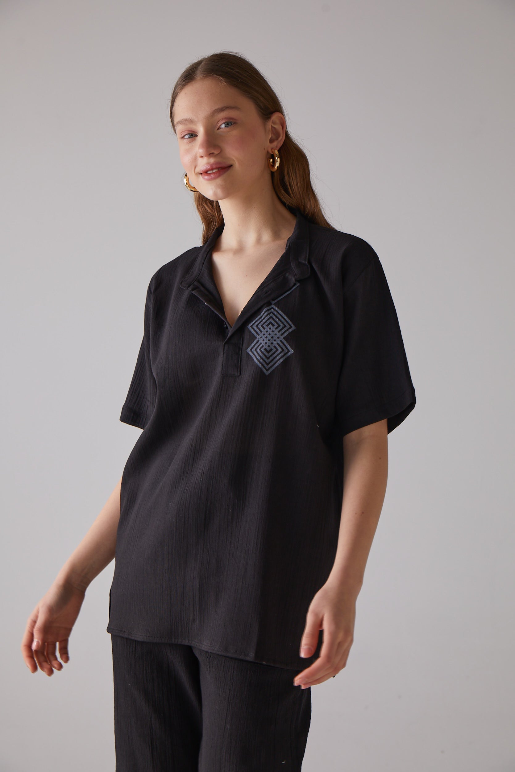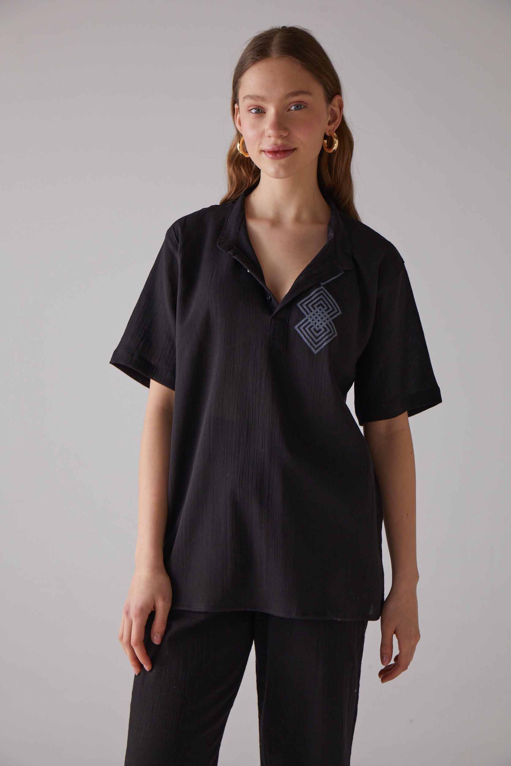 Kare Desenli Kısa Kollu Siyah Gömlek