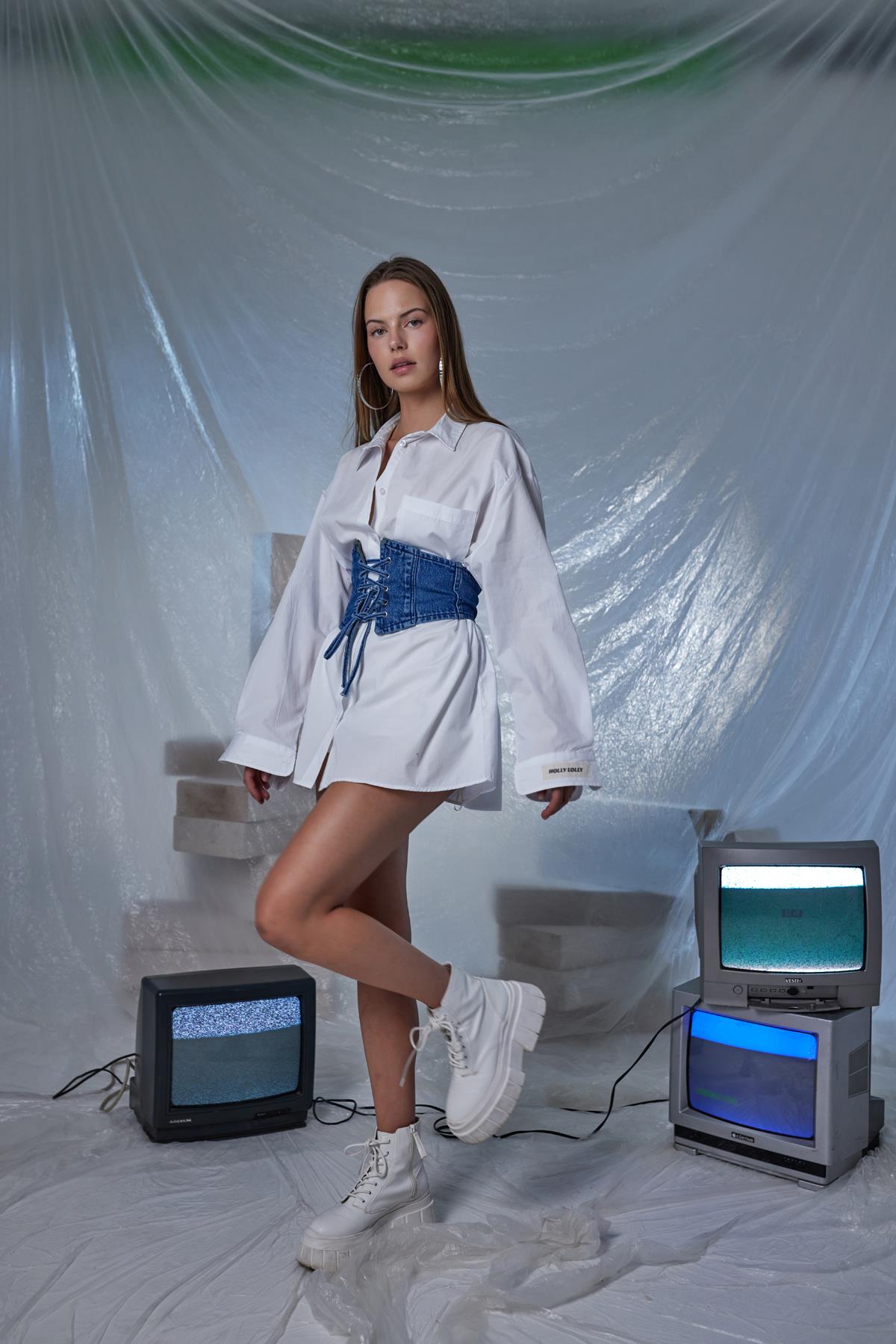 Düğme Kapamalı Oversize Cepli Tuli Gömlek Beyaz