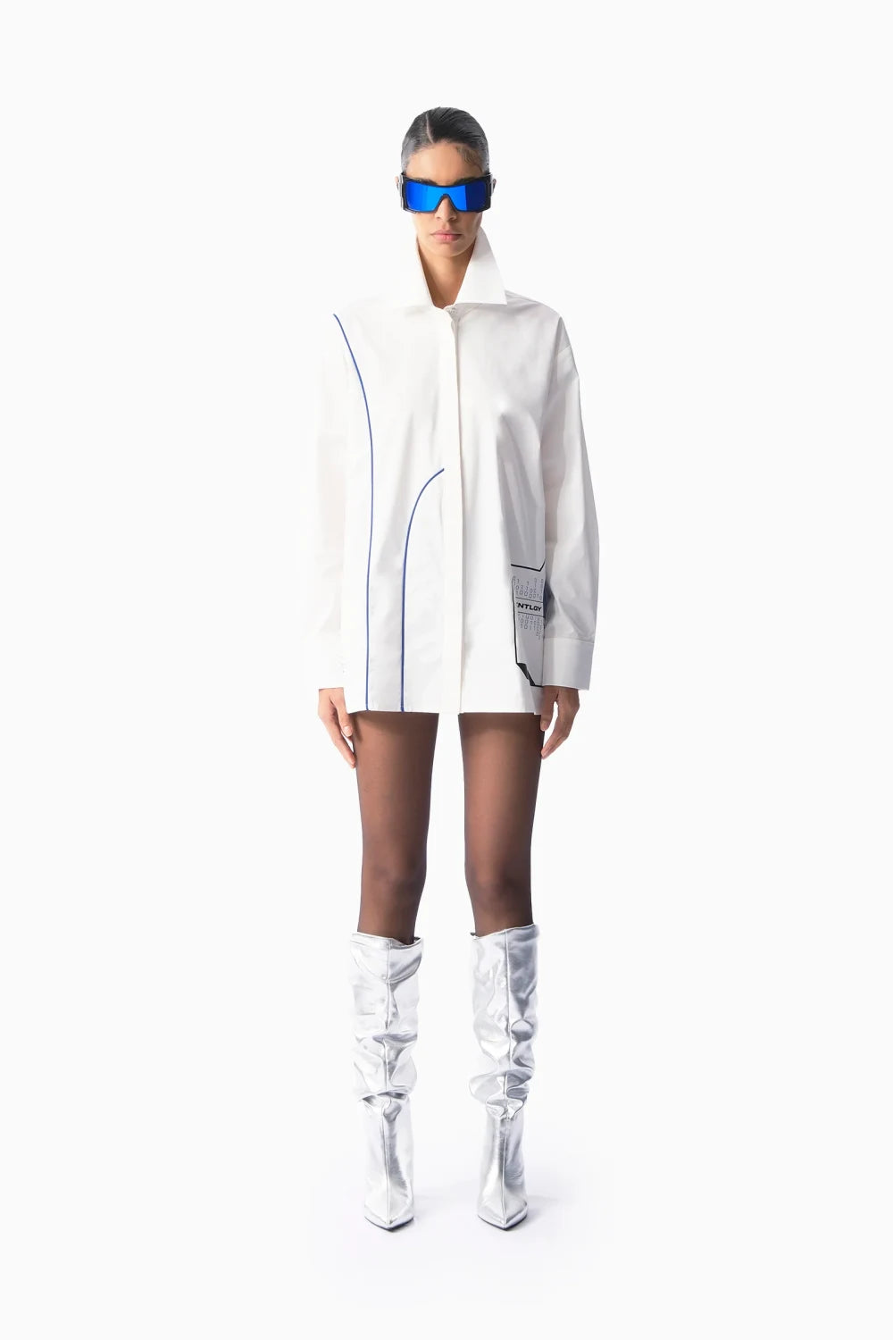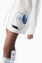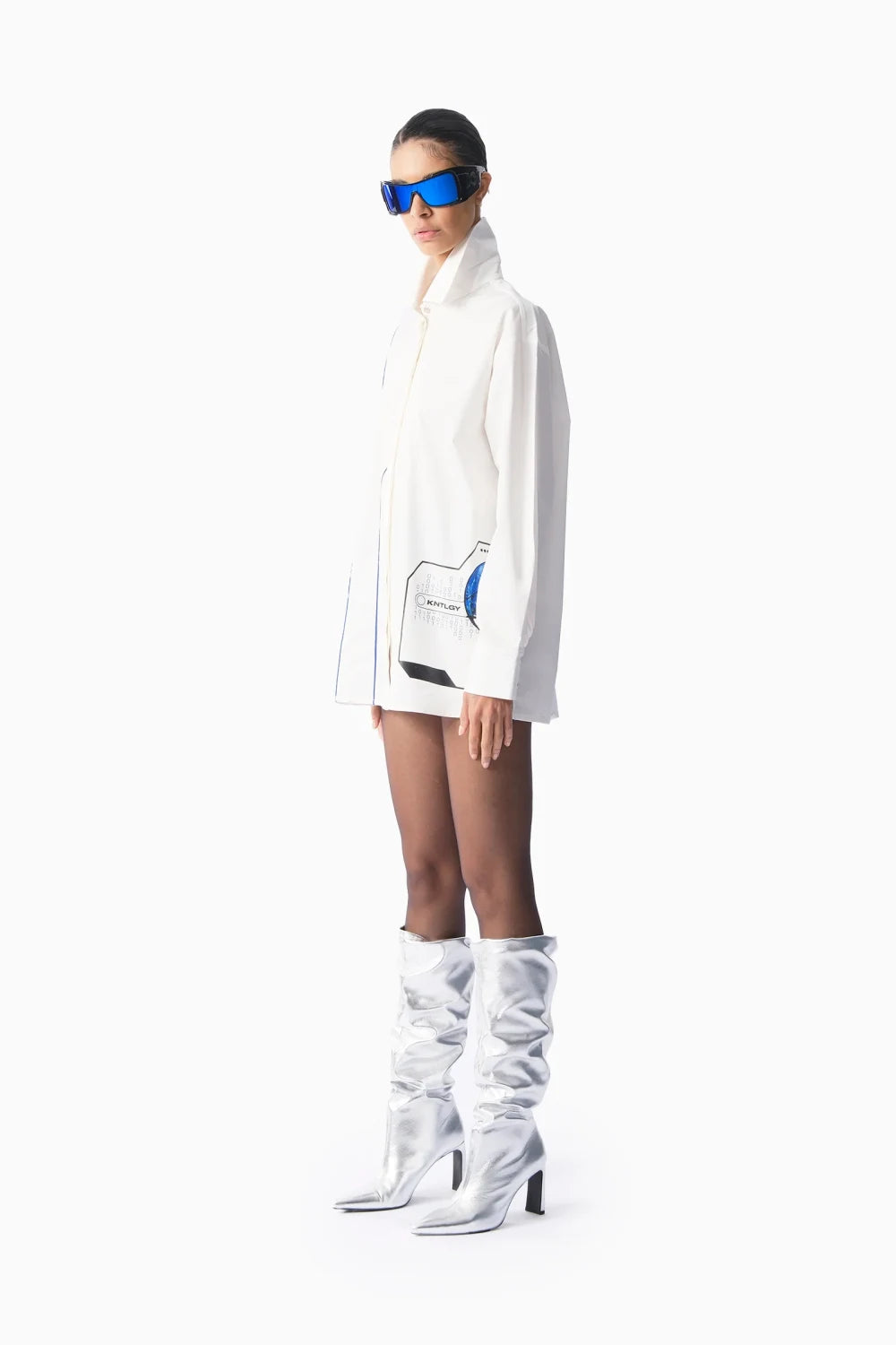 Oversize kesim, unisex, uzun kollu, AI baskı detaylı organik pamuk poplin gömlek.