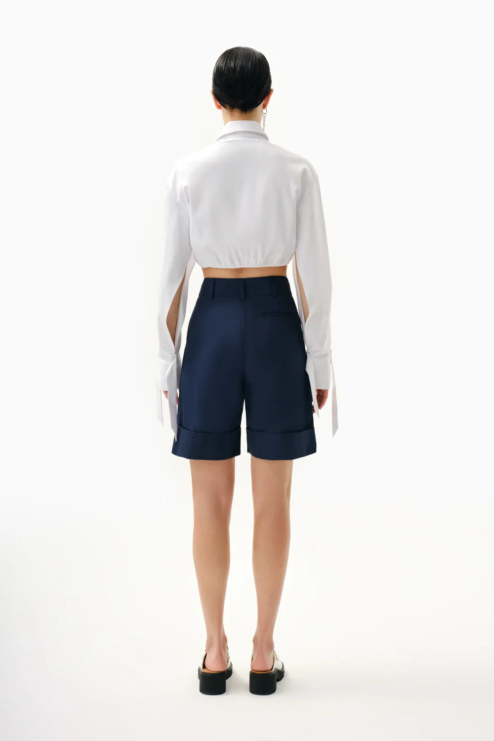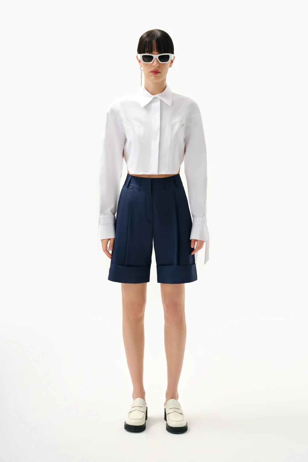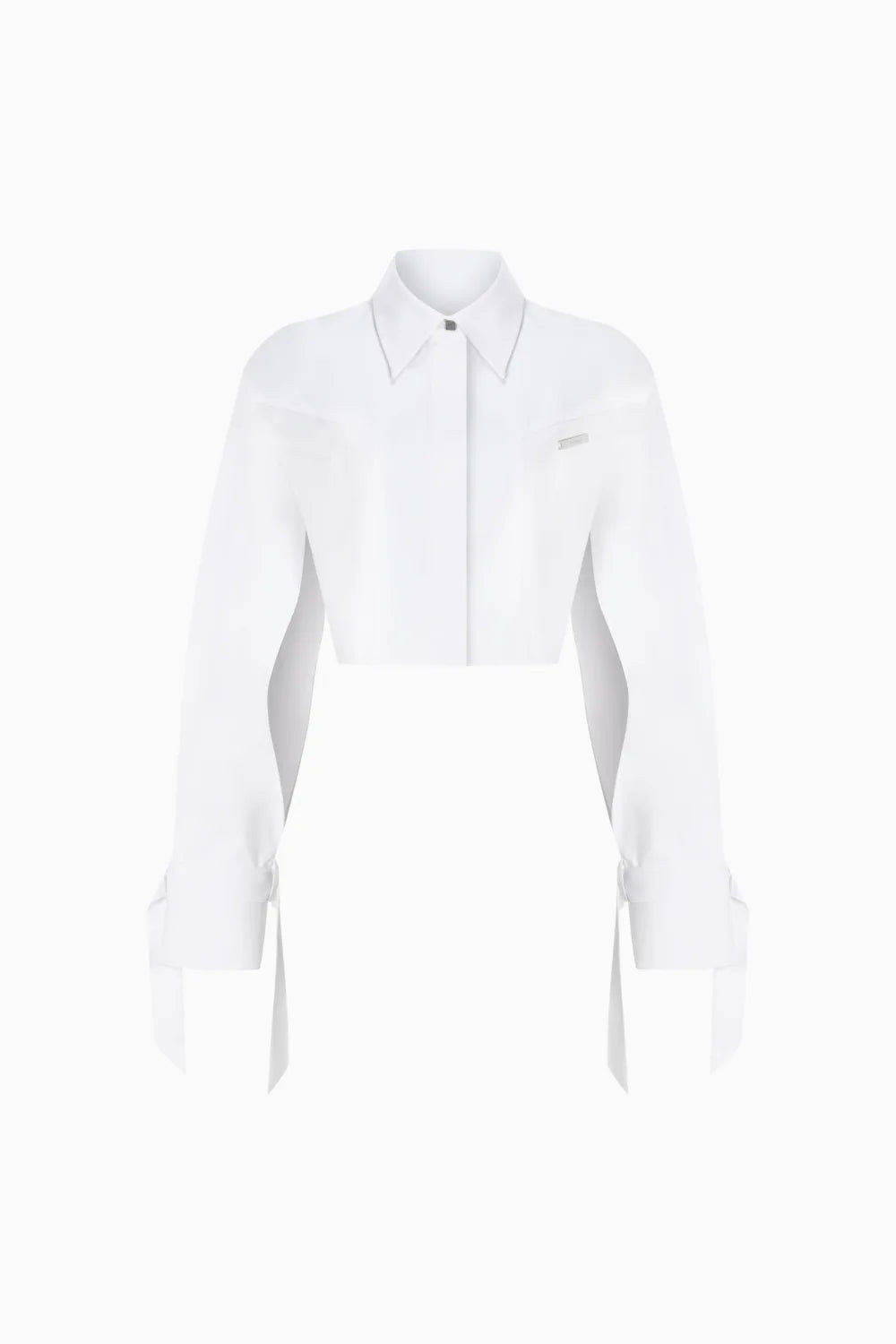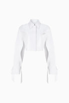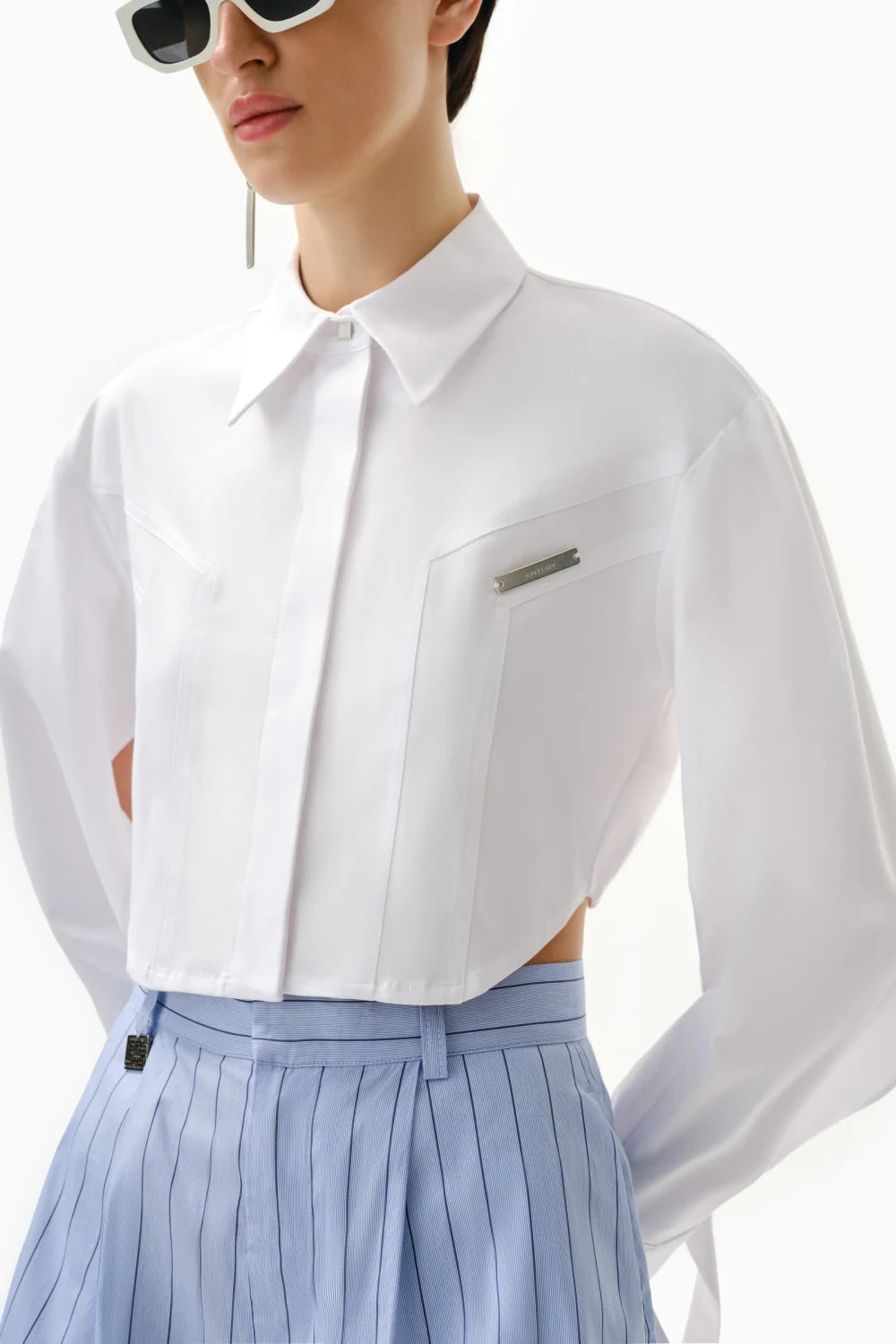 Asimetrik kesim, beli lastikli, metal logo aksesuarlı, kolu yırtmaçlı, beyaz poplin gömlek.