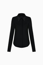 Siyah teknik kumaştan uzun kollu, sivri yaka detaylı gömlek.