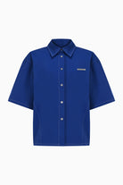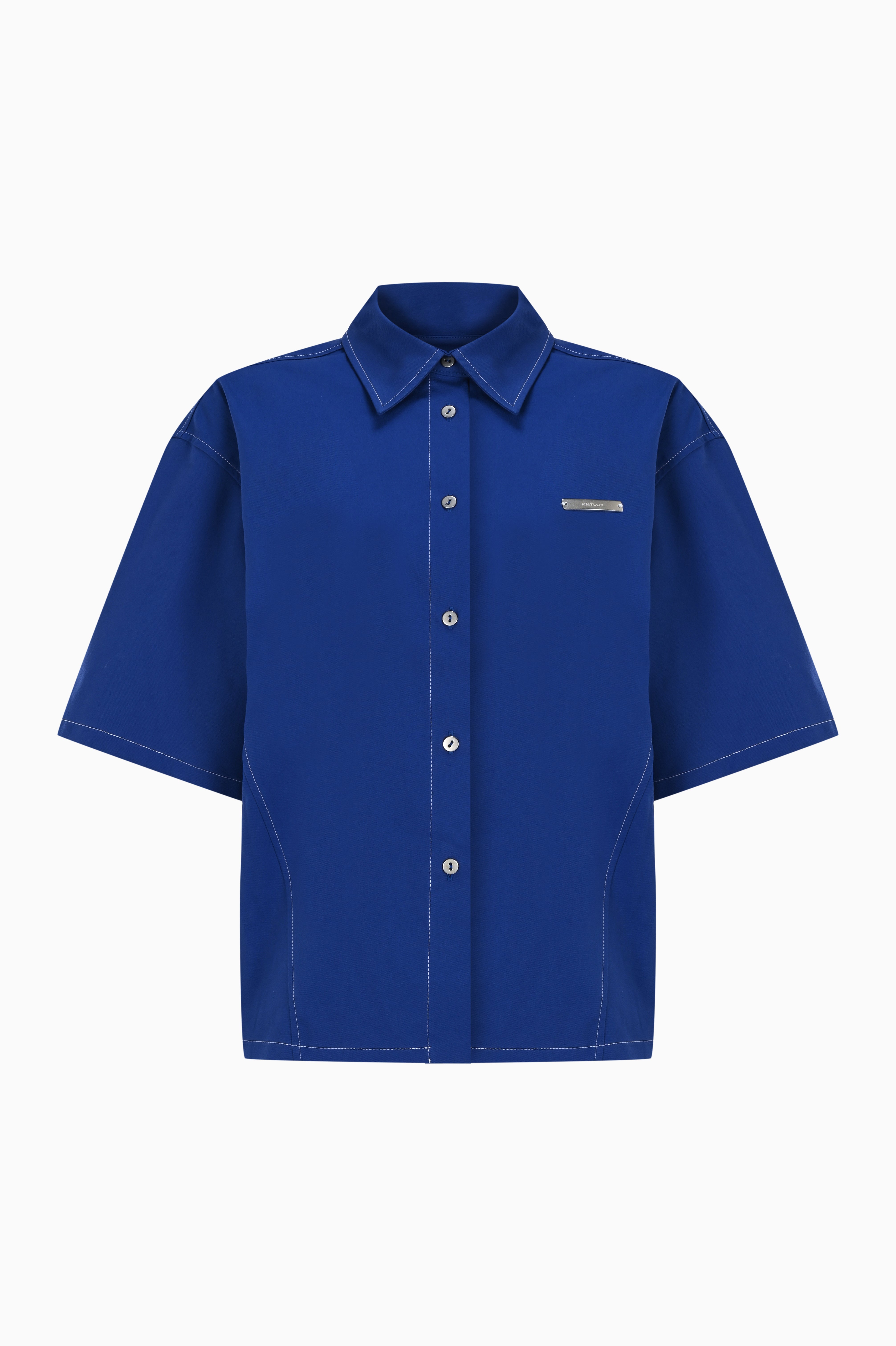 4/3 kollu, rahat ve bol kesimli, beyaz kontrast dikiş ve metal aksesuar detaylı Türk denizi mavisi pamuklu gömlek.