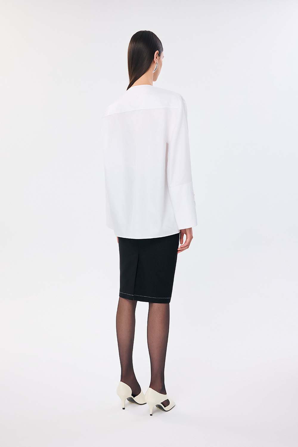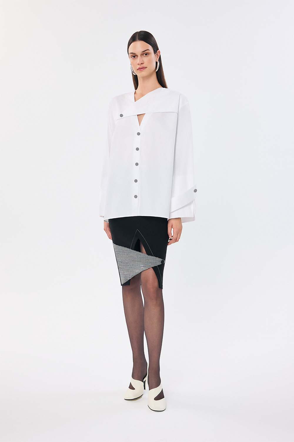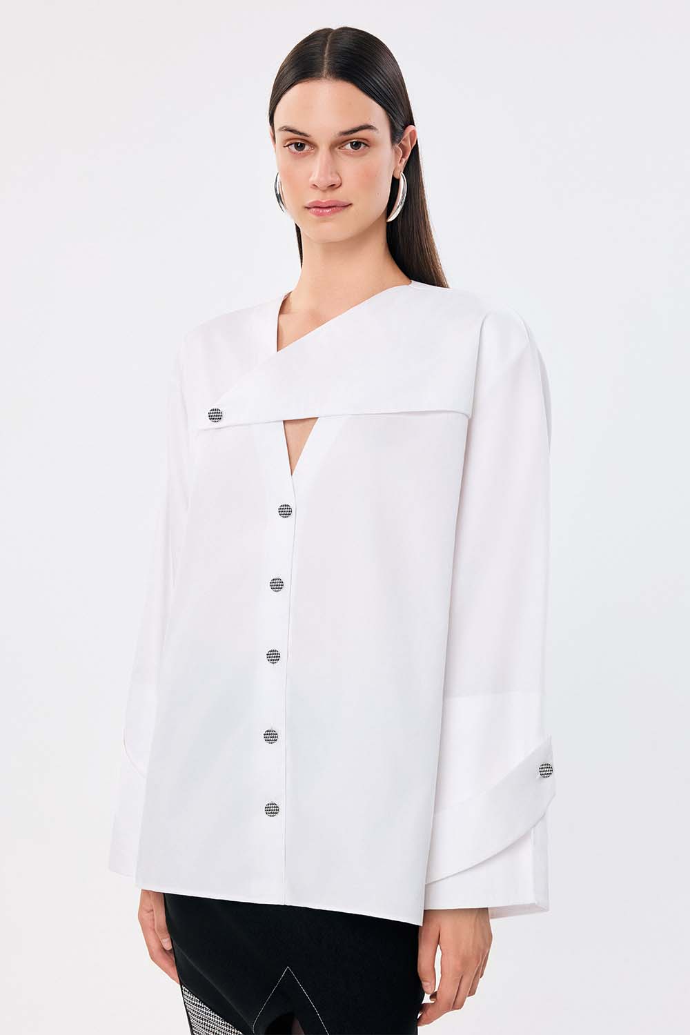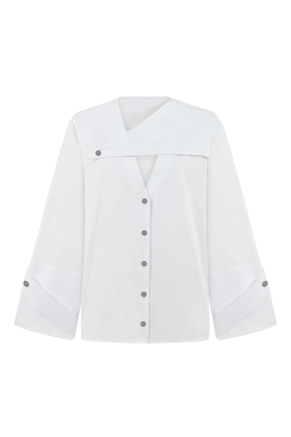 A contemporary take on the classic white shirt, the Eta Classic Shirt is designed with an asymmetrical neckline and gold-tone button accents for a modern edge. The structured cuffs and flowing fabric create a perfect balance of sharpness and ease, making it an essential piece for effortless elegance.