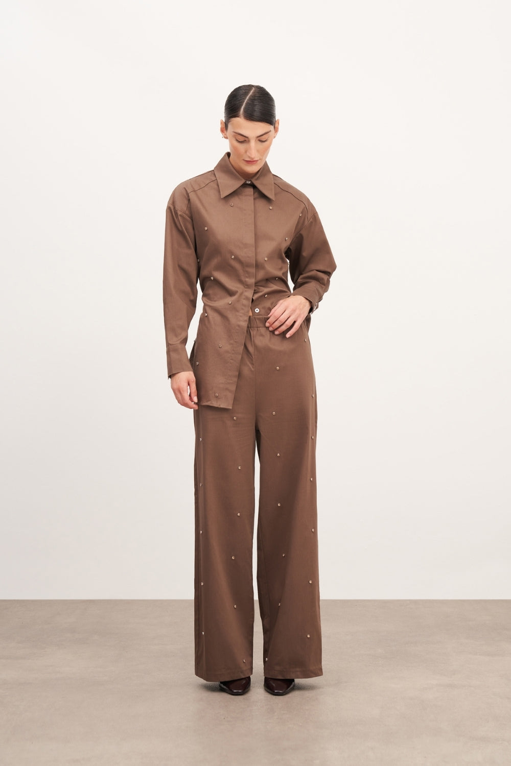 Kahverengi Taş İşlemeli Bağlama Detaylı Pamuk Gömlek