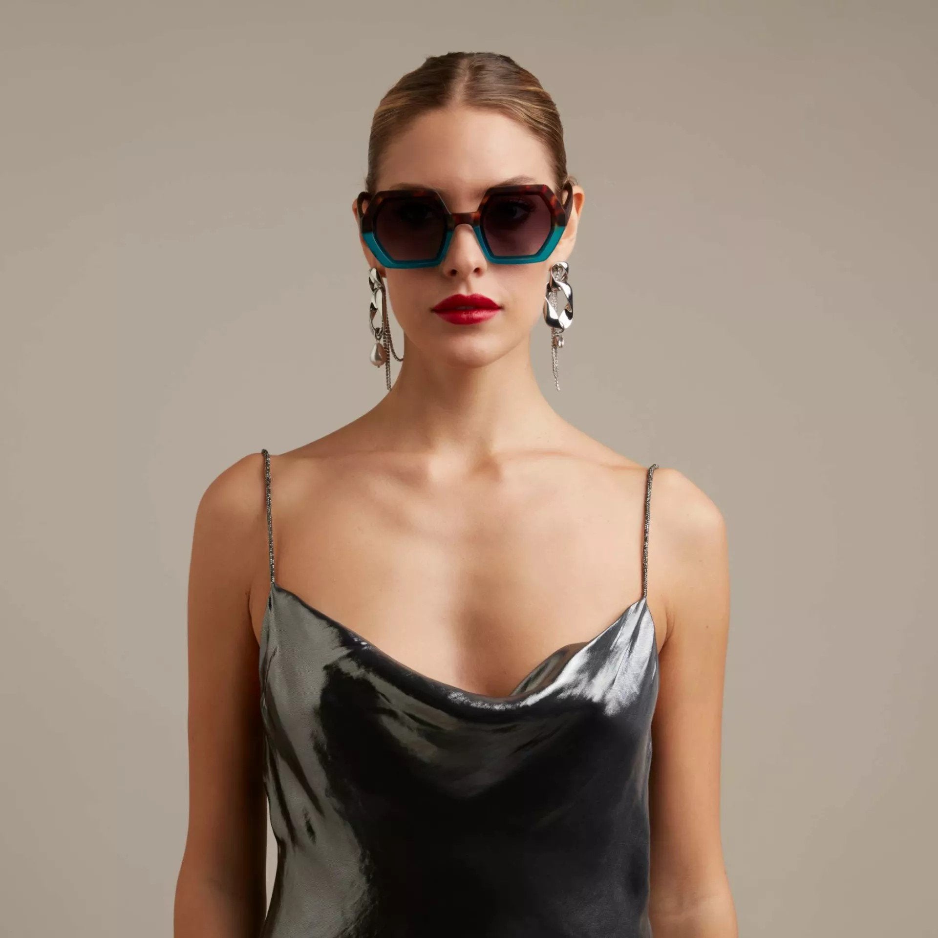 EMMA, yumuşak dokunuşlu çerçeveye ve üst üste binen merceklere sahip, önceden birleştirilmiş altıgen bir güneş gözlüğüdür.