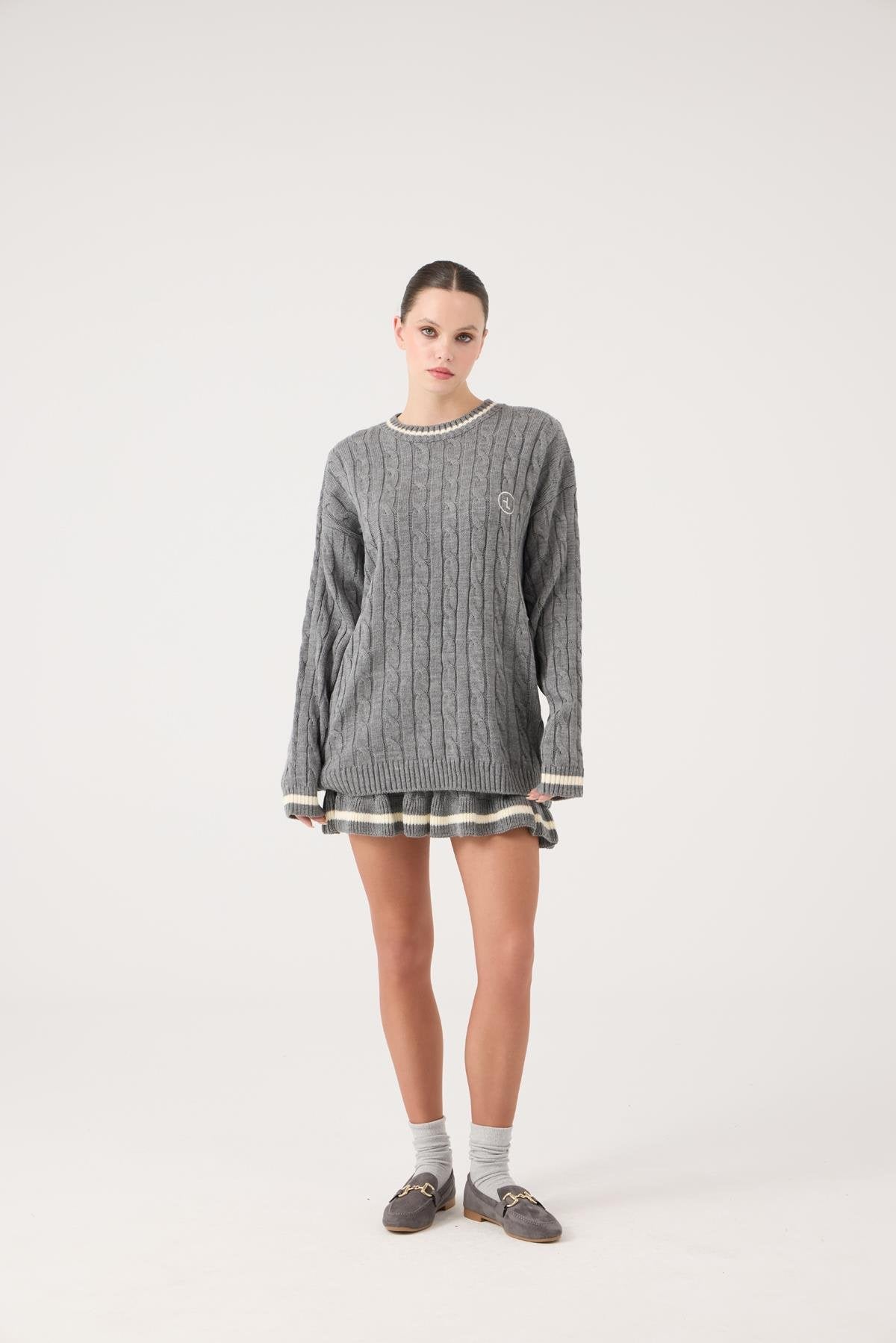 Logolu Örgü Desenli Oversize Triko Harold Kazak Gri