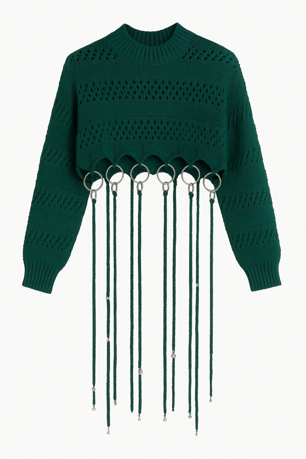 Metal Halka Toka & El Örgüsü Uzun Sarkıt Detaylı Crop Triko